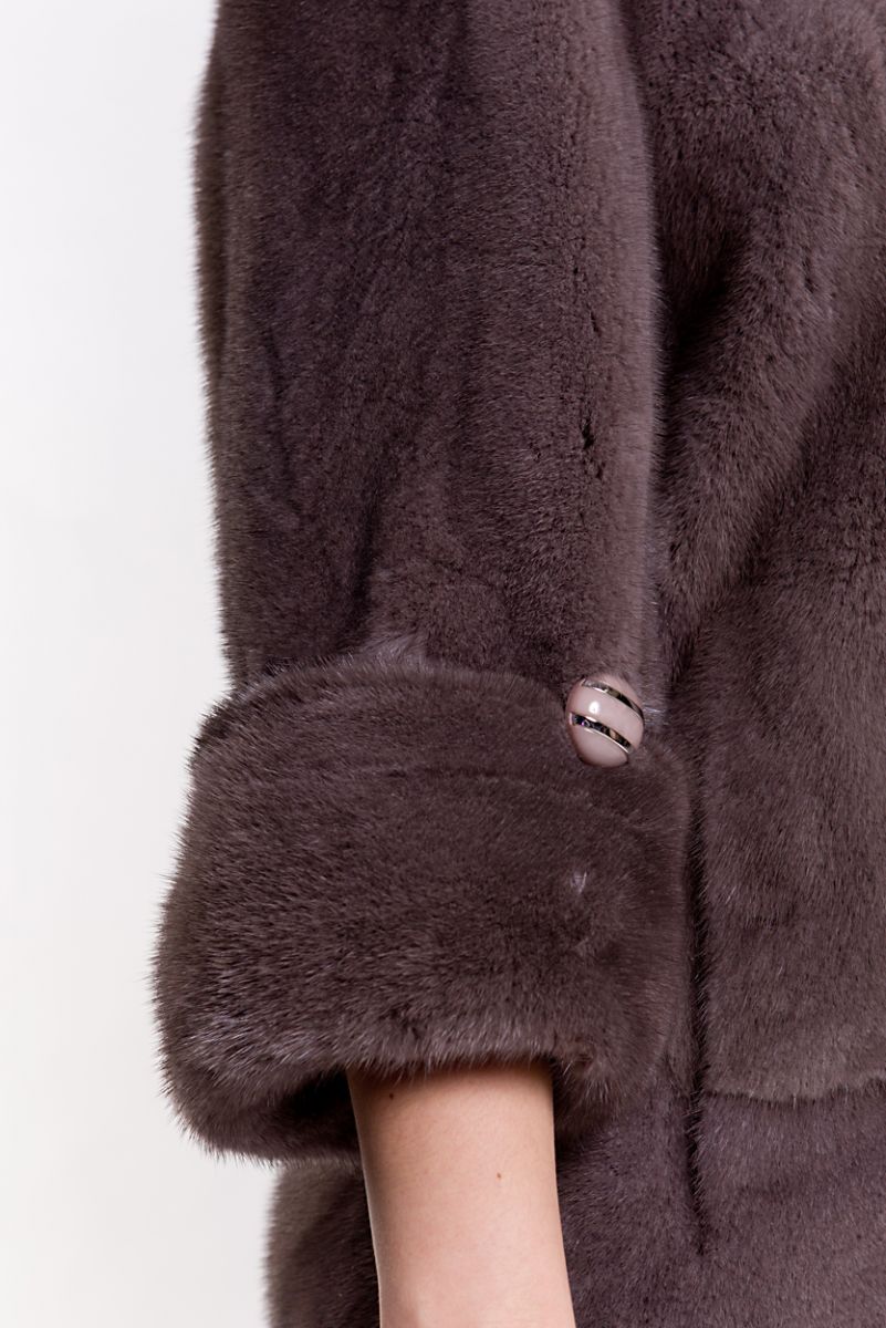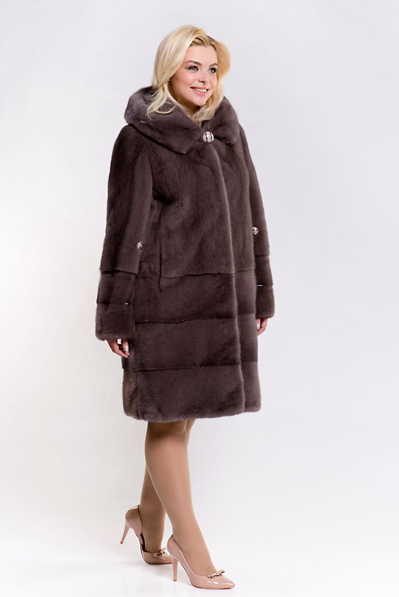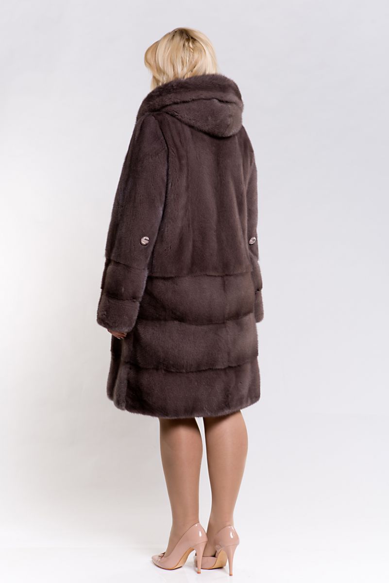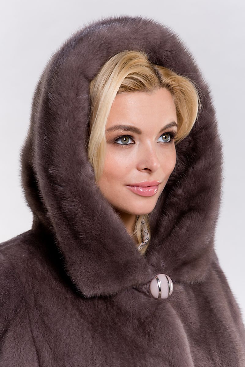 Полупальто из меха норки с капюшоном. Крой изделия комбинированный. Верх модели собран в роспуск, а низ изделия поперечная выкладка пластин. Рукава модели трансформируются в более укороченные. Длина изделия 100см.