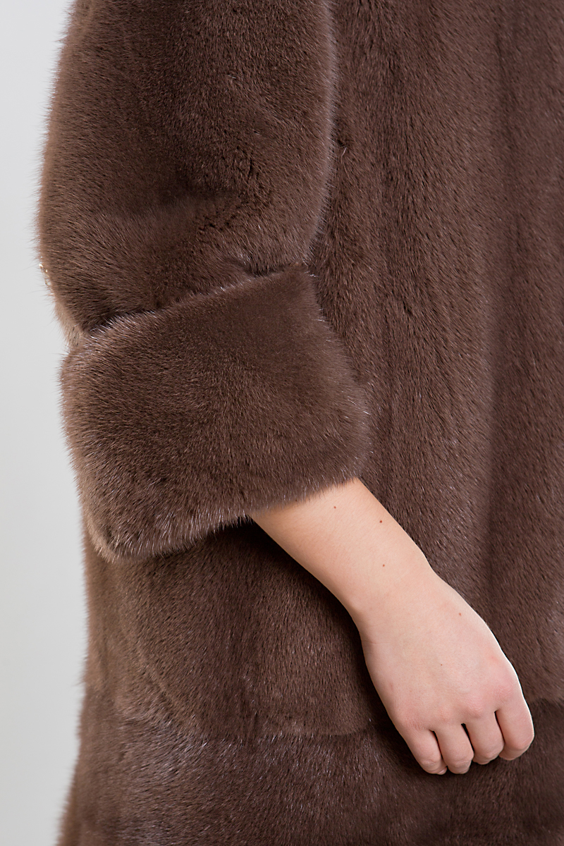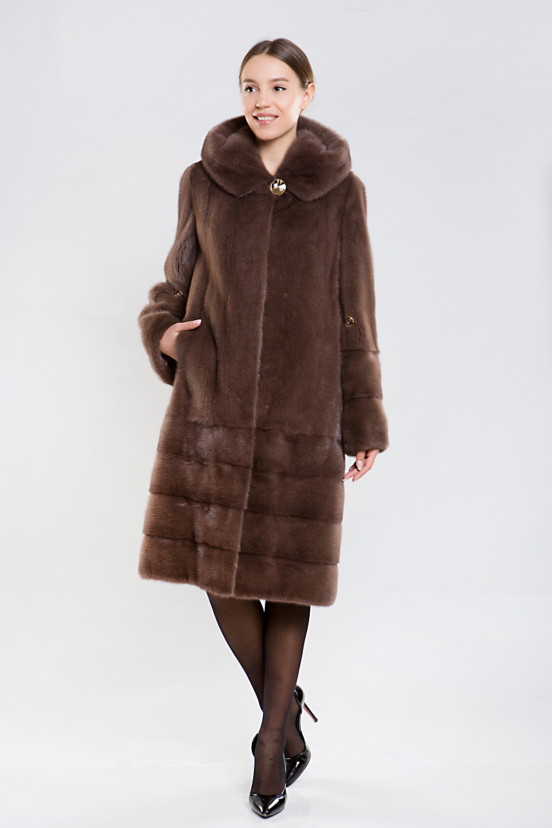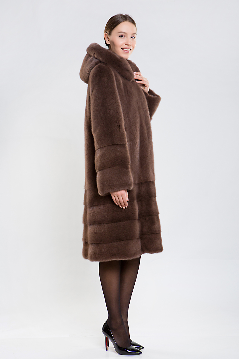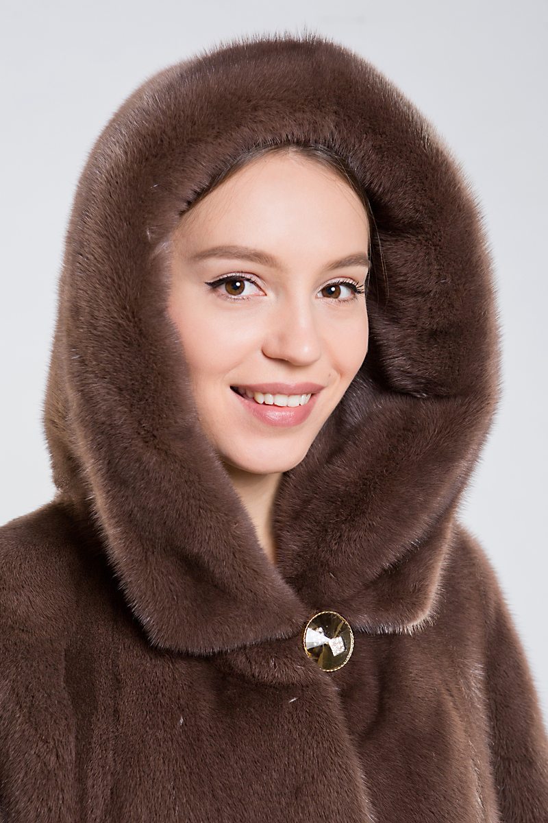 Полупальто из меха норки с капюшоном. Верх изделия сшит в роспуск, а низ поперечная выкладка пластин. Рукава модели трансформируются в более укороченные и имеют регулирующую утяжку. Длина изделия 110 см.