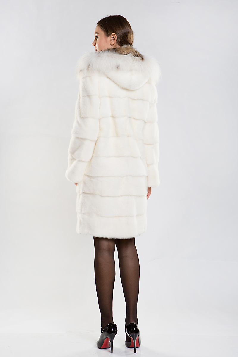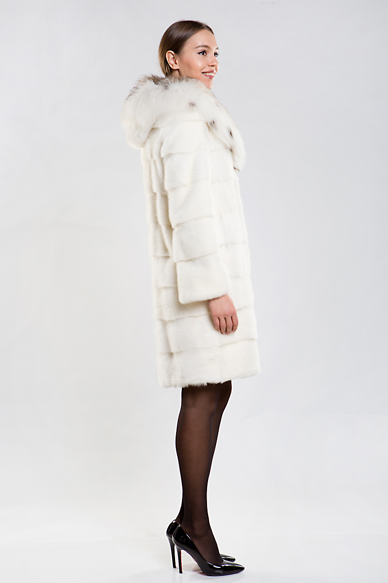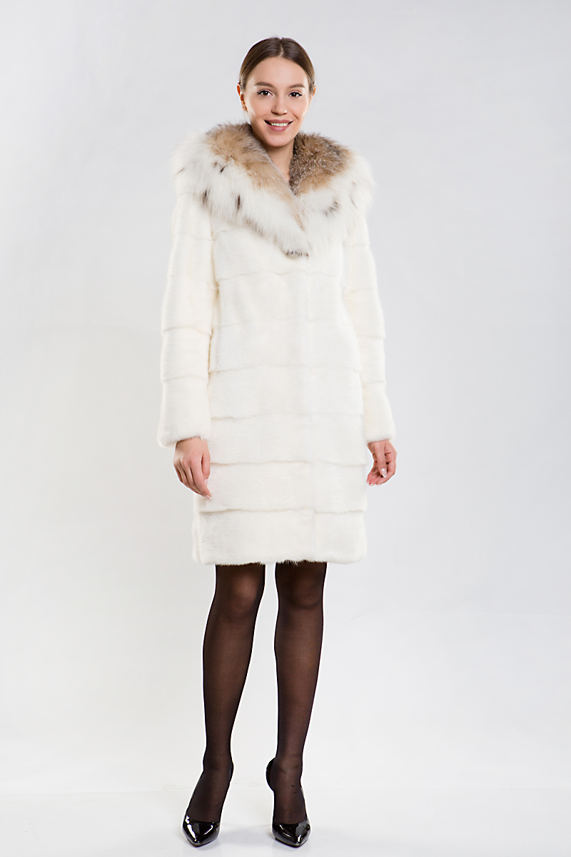 Полупальто из меха норки. Шикарный, объемный капюшон декорирован мехом рыси. Крой изделия поперечная выкладка пластин. На талии модели регулирующая утяжка. Такая великолепная шубка украсит ваш гардероб и согреет даже в самый сильный мороз!