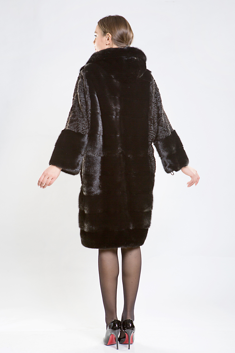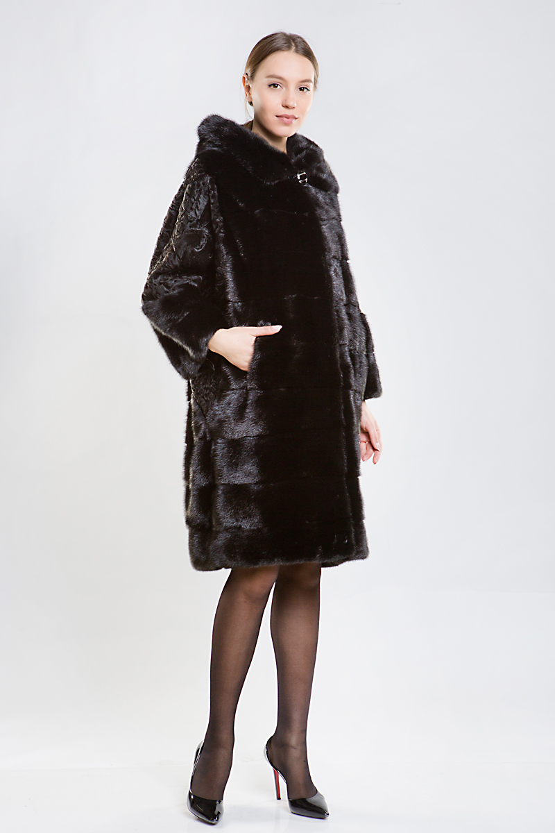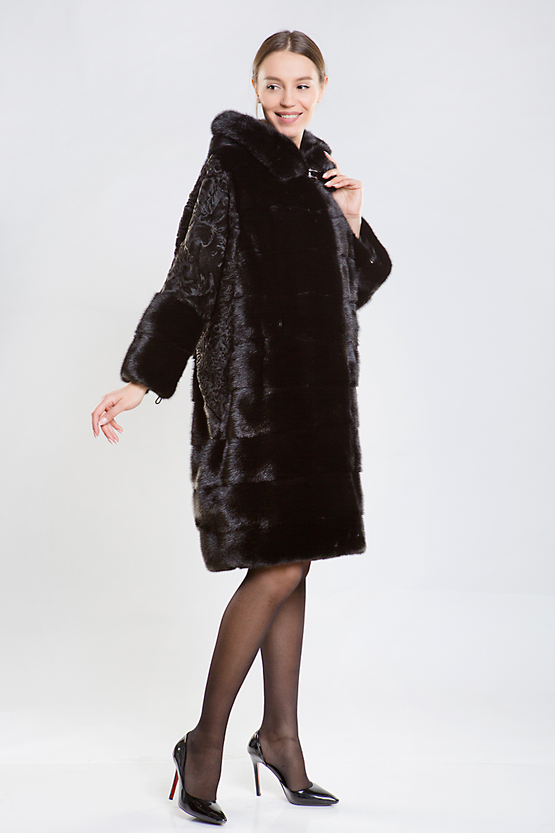 Полупальто из меха норки с капюшоном. Крой изделия поперечная выкладка пластин. Рукава модели с заниженной проймой и декорированы мехом каракуля. Такая красивая шубка подойдет женщинам любой комплекции и позволит чувствовать себя комфортно.