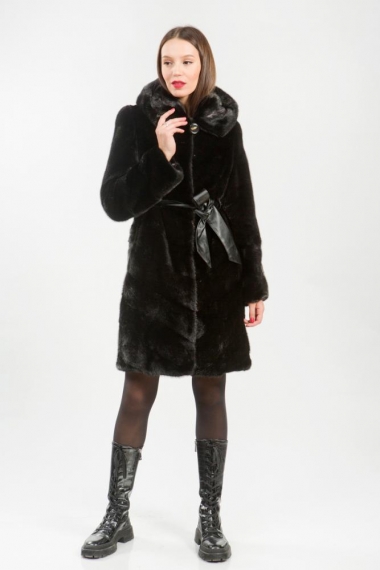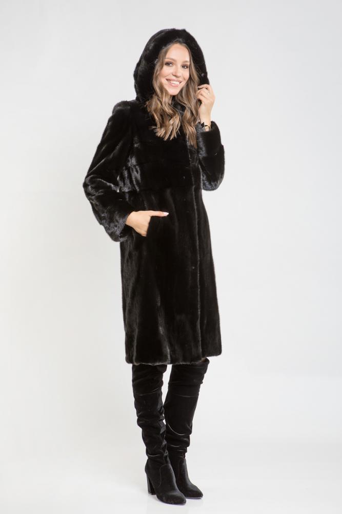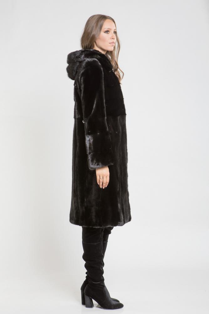 Полупальто их меха норки с капюшоном. Крой изделия комбинированный. Низ модели - сборка полотна ворсом вверх. Внутри и на рукавах изделия имеются регулирующие утяжки. Верх шубки - поперечная выкладка пластин. Рукава модели трансформируются в более укороченные. Лаконичный прямой силуэт подойдет девушкам любой комплекции и позволит чувствовать себя комфортно!