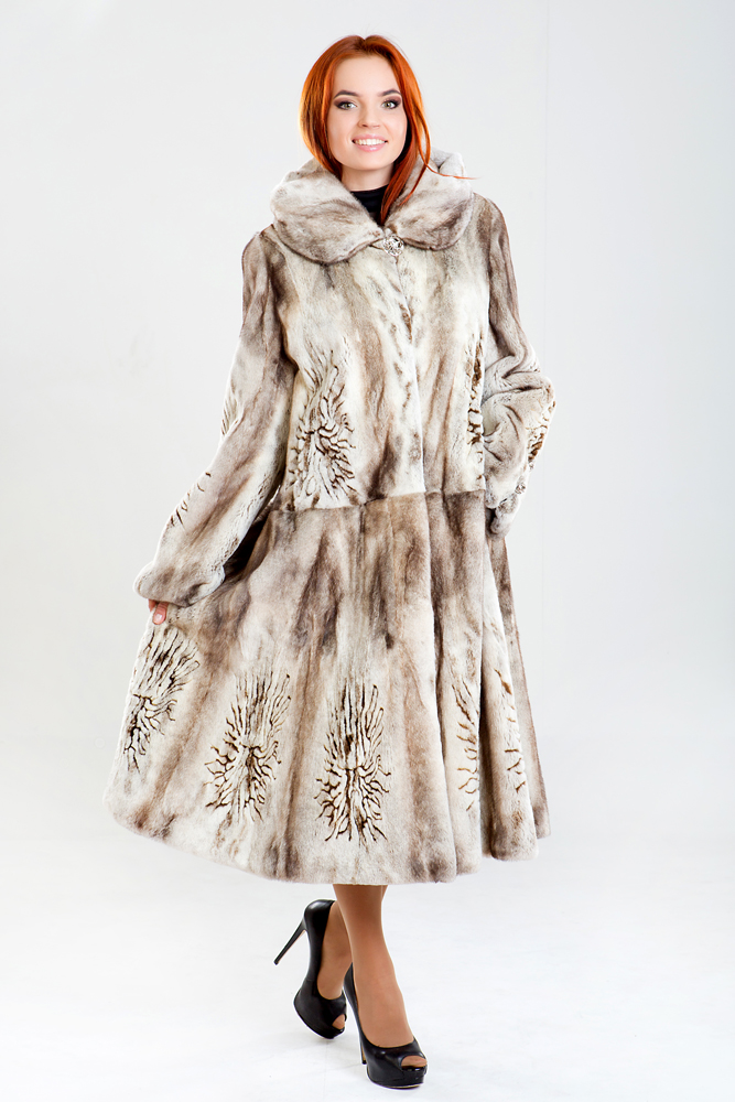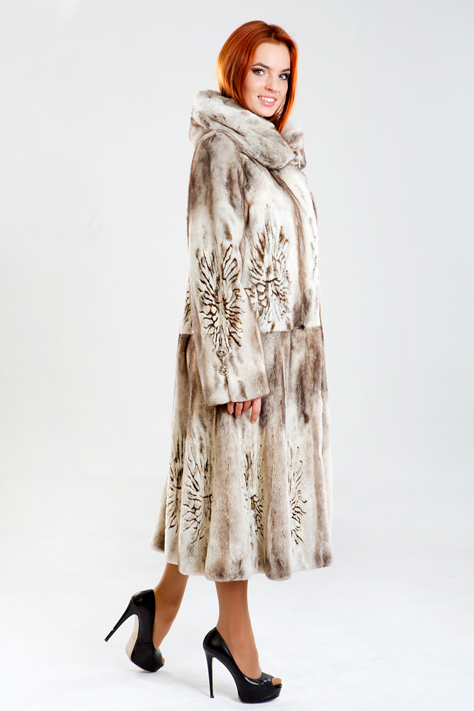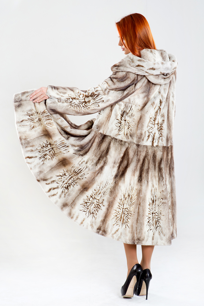 Полупальто из меха стриженной норки с капюшоном. Крой изделия роспуск с добавлением пластин. Внутри модели имеется регулирующая утяжка. Длина изделия 120 см. Меховое пальто декорировано лазерной выстрижкой. Юбка модели к низу имеет большой клеш, поэтому шубка смотрится шикарно!