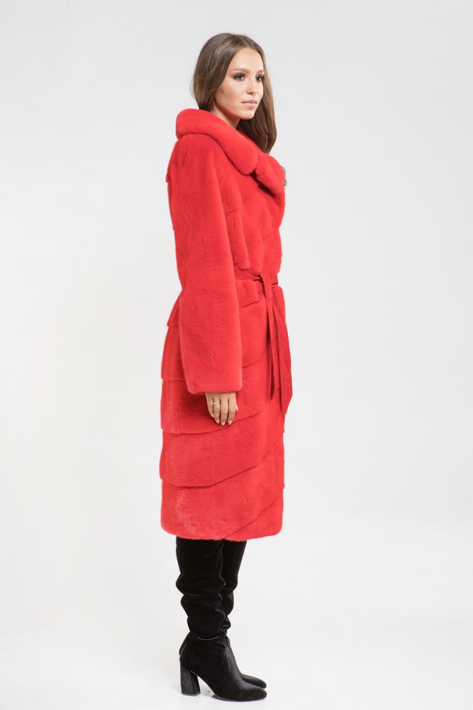 Полупальто из меха норки с английским воротником. Крой изделия комбинированный. Перед - диагональная выкладка пластин, спина - поперечная сборка. Внутри и на рукавах модели регулирующие утяжки. Прилагается пояс из натуральной замши. Сногсшибательный, насыщенный, красный цвет предает шубке неповторимость и изысканность