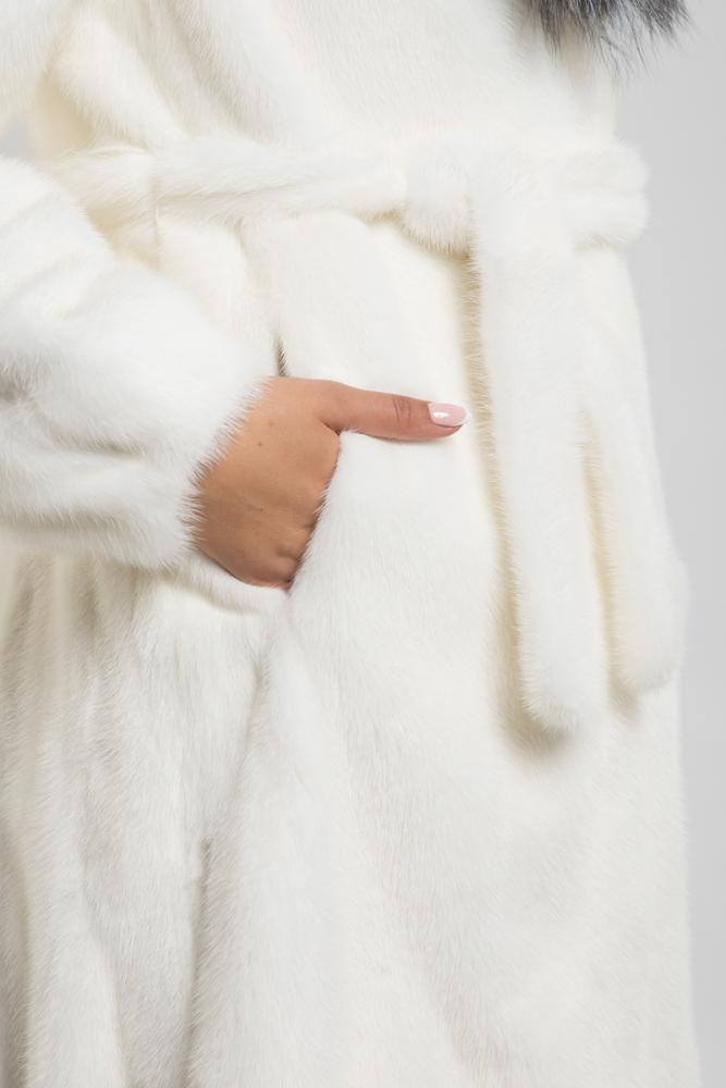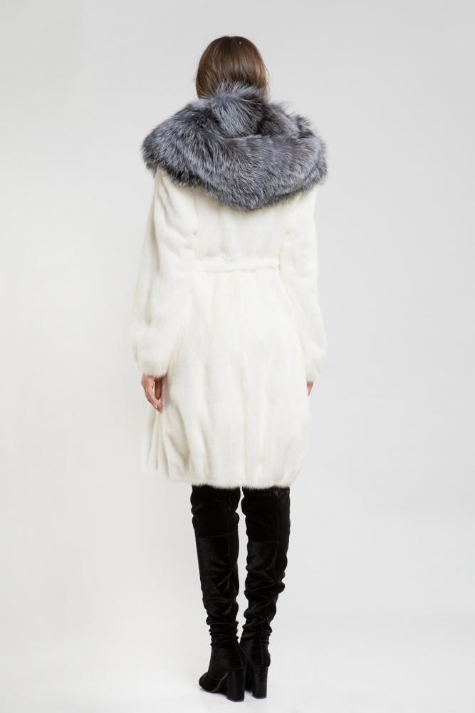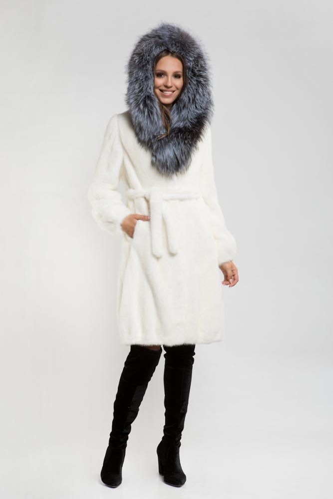 Полупальто из меха норки. Капюшон изделия декорирован мехом чернобурой лисы. Крой модели - пластина с добавлением роспуска. Рукава и низ изделия присобраны. Такая шубка сногсшибательного снежно-белого цвета позволит стать яркой личностью и почувствовать себя королевой!