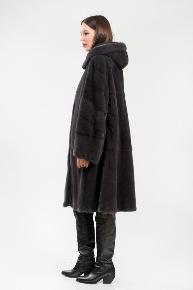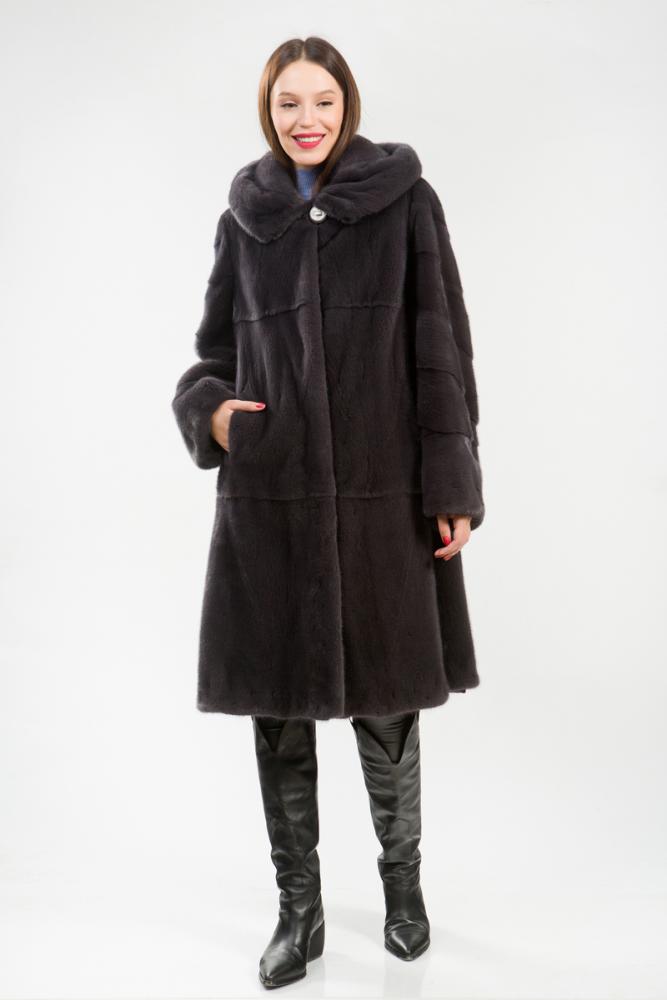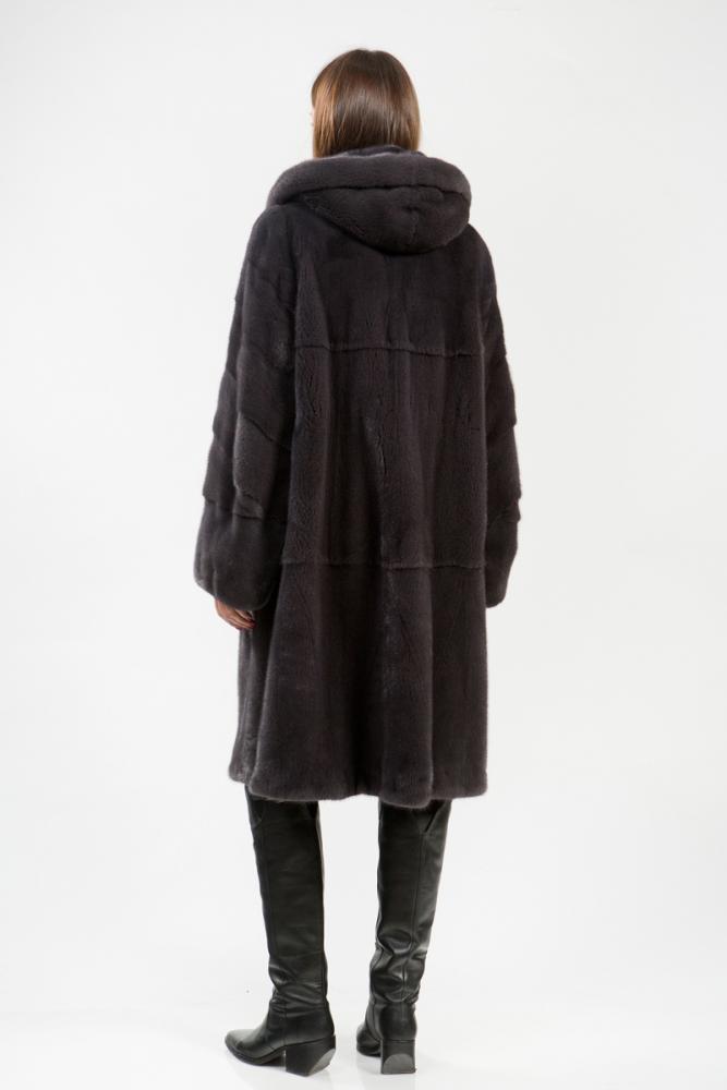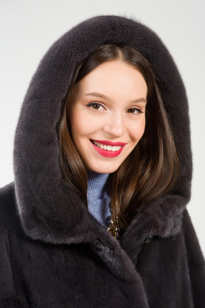 Полупальто из меха норки Kopenhagen Fur с капюшоном. Крой изделия пластины с добавлением роспуска. Рукава шубки собраны диагональной выкладкой пластин. Внутри на талии и на рукавах модели имеются регулирующие утяжки. Длина изделия 110 см. Мех с коротким ворсом не добавляет объема, выгодно корректирует силуэт, обеспечивает ему пропорциональность. А выразительная расцветка муссона добавляет образу элегантность и шик!