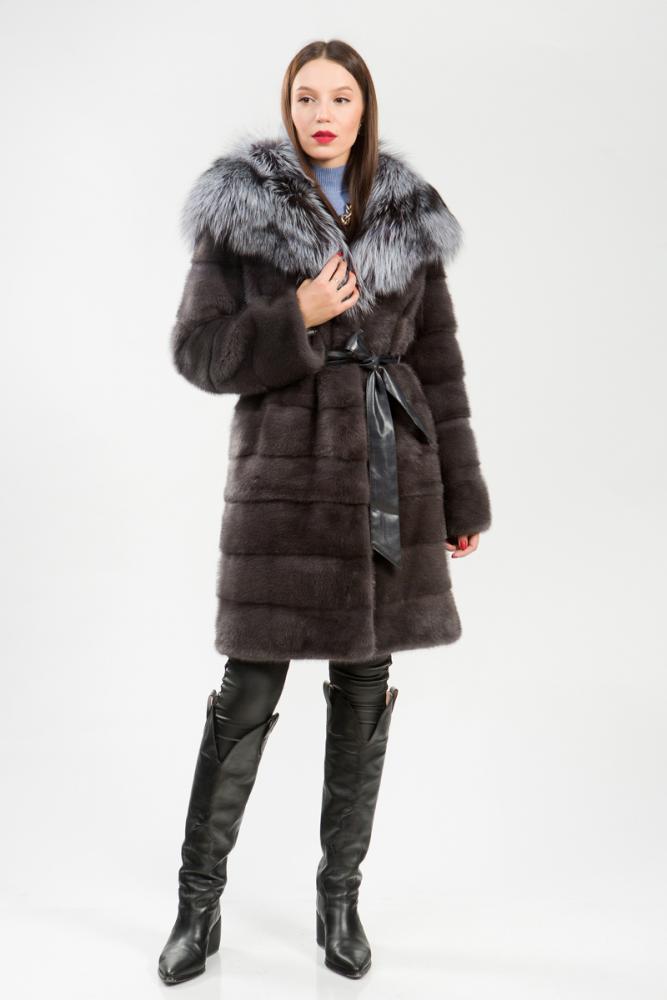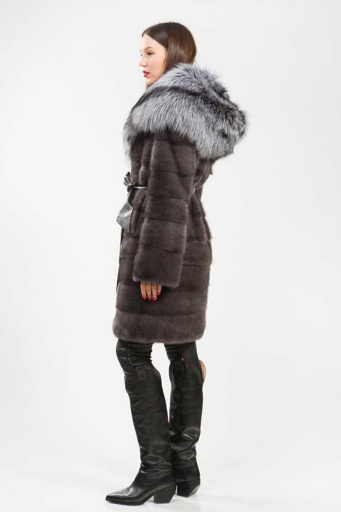 Полупальто из меха норки. Капюшон модели декорирован мехом чернобурой лисы. Крой изделия поперечная выкладка пластин. Внутри на талии, на рукавах и по низу модели имеются регулирующие утяжки. Пояс из кожи в комплекте. Длина изделия 100 см. Великолепное норковое пальто является трансформером! Благодаря молниям-невидимкам шубка превращается в миниатюрную курточку! Такая универсальная вещь подойдет любой леди и бесспорно украсит женский гардероб!