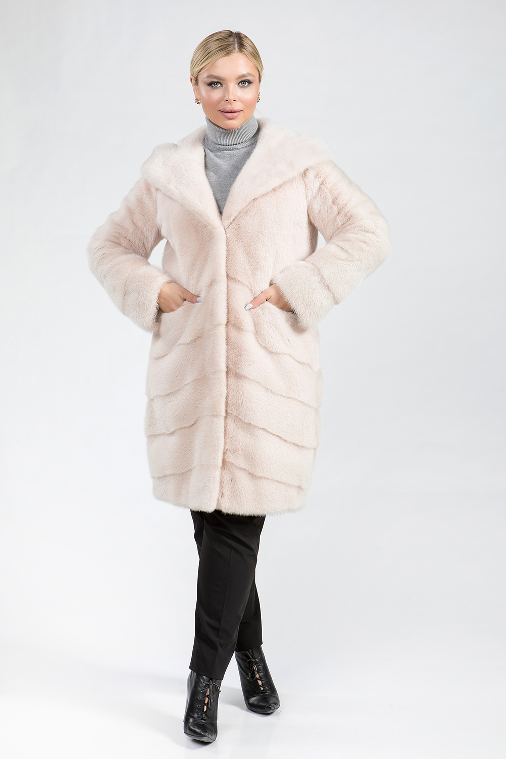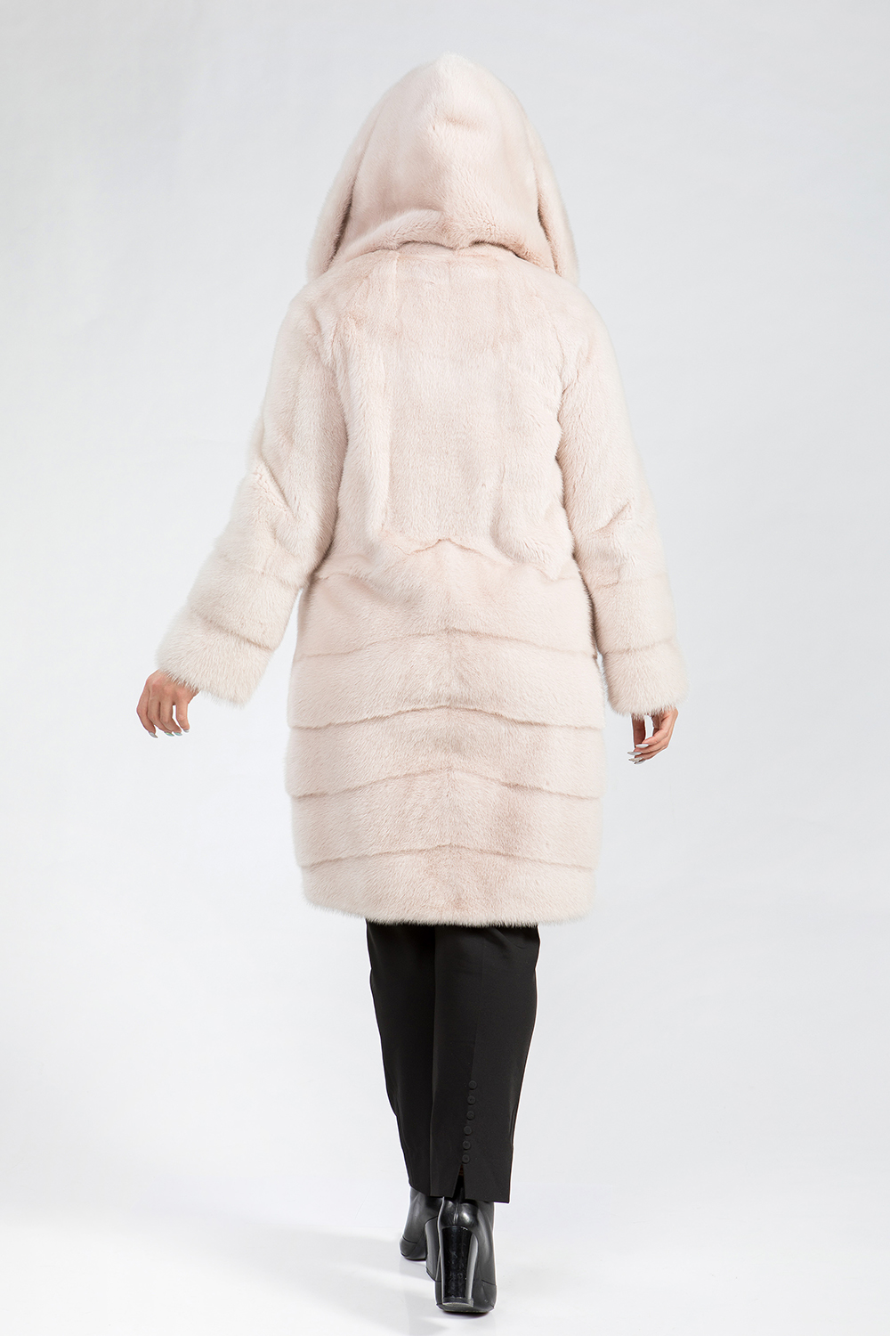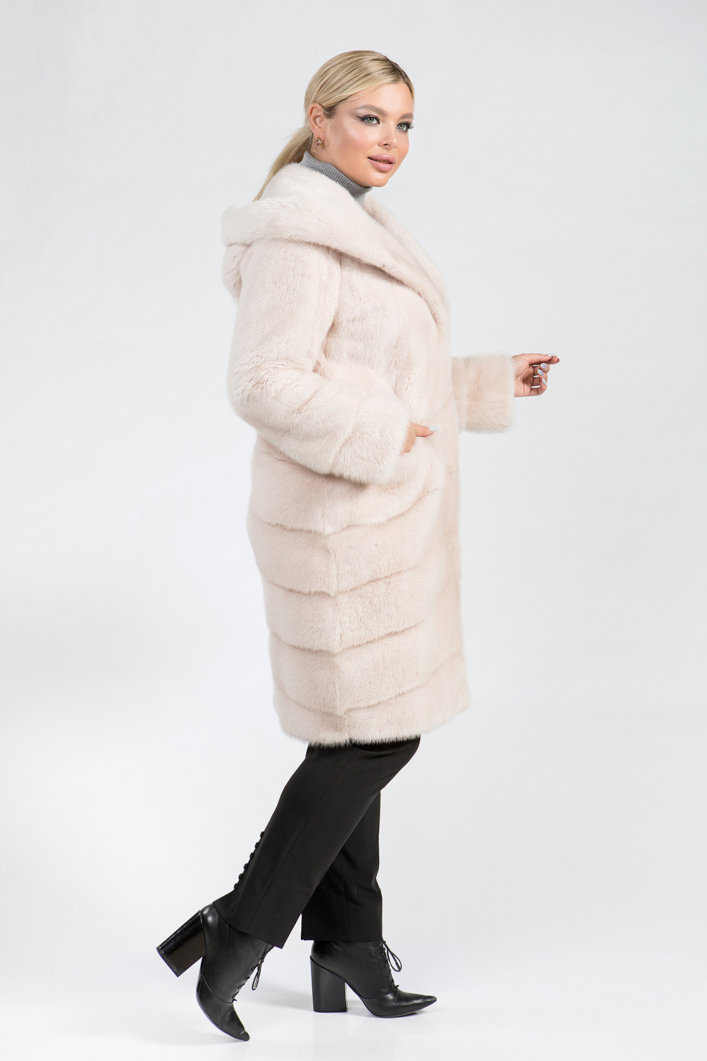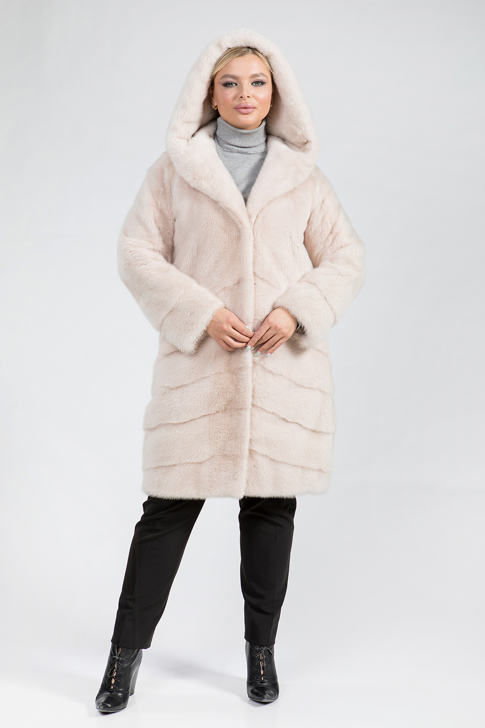 Полупальто из меха норки с капюшоном. Крой изделия роспуск, низ модели-диагональная выкладка пластин. Шубка оснащена регулирующими утяжками на рукавах, на талии и по низу изделия. Кармашки модели с магнитами. Рукава изделия трансформируются в более укороченные благодаря молниям. Нежная шубка в жемчужных тонах дополнит образ преуспевающей леди, придаст свежесть и женственность!