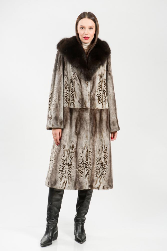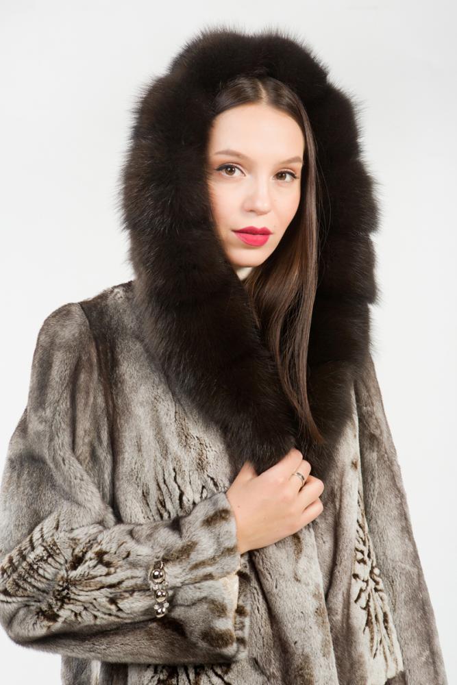 Полупальто из меха стриженной норки. Капюшон модели дополнена мехом тонированной куницы. Крой изделия пластины с добавлением роспуска. Внутри на талии модели есть регулирующая утяжка, а по бокам шубки небольшие элегантные разрезы. Норковое полотно изделия декорировано лазерной выстрижкой. Создайте новый, комфортный и оригинальный зимний образ!