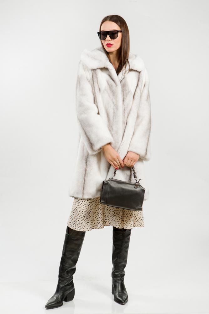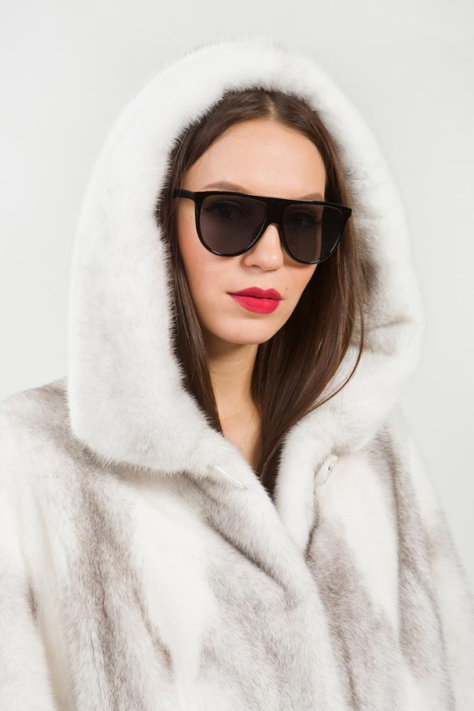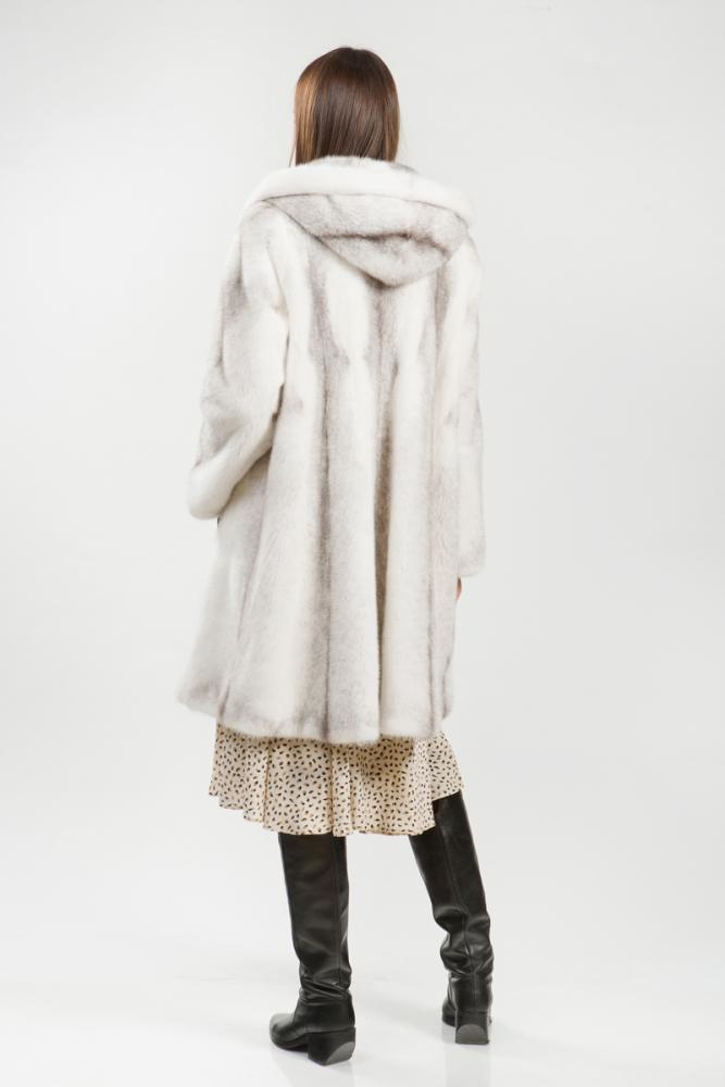 Полупальто из меха норки с капюшоном. Крой изделия роспуск. Внутри на талии и на рукавах модели имеются регулирующие утяжки. Длина изделия 100 см. Шубка к низу расклешена и имеет великолепные фалды. Такое норковое пальто в светлых тонах циркона является прекрасным вариантом для тех, кто не хочет хандрить в морозную погоду, а предпочитает радовать себя привлекательными луками, поднимающими настроение!