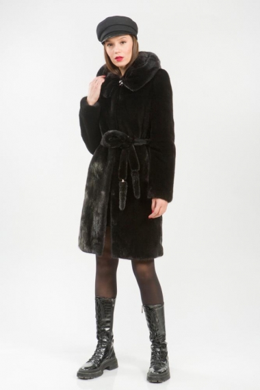 Полупальто из меха норки с капюшоном. Крой изделия пластины с добавлением роспуска. На рукавах модели есть регулирующие утяжки, а по бокам небольшие элегантные разрезы. Пояс из меха норки в комплекте. Благородный блеск черного меха гарантирует образу престижность и презентабельность!