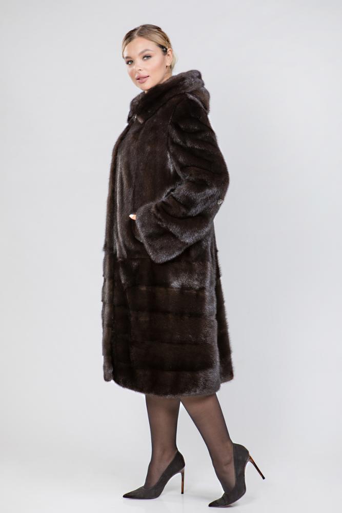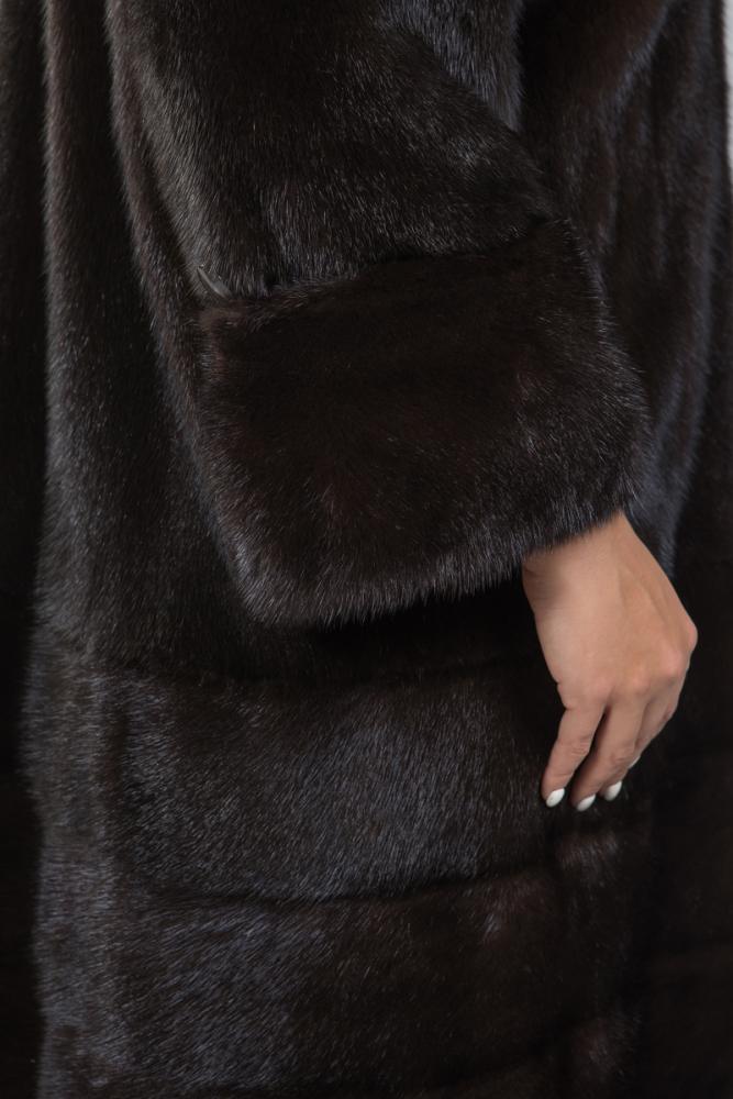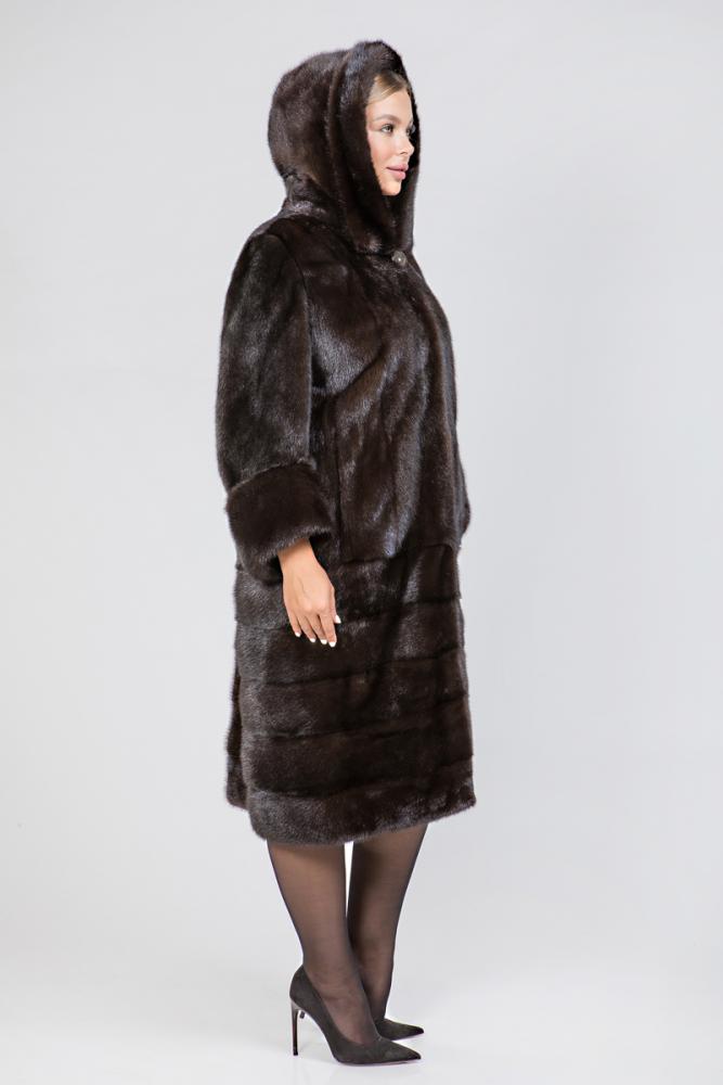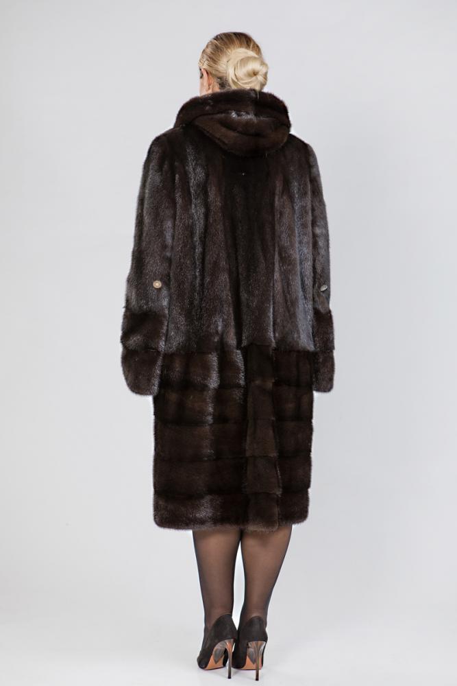 Полупальто из меха норки с капюшоном. Крой изделия роспуск, по низу и на рукавах поперечная выкладка пластин. Талия и рукава модели имеют регулирующие утяжки. Длина изделия 110 см. Благодаря уникальной технологии трансформера, рукава шубки укорачиваются с помощью пуговиц. Такое меховое пальто с укороченными рукавами можно носить с длинными перчатками или митенками!