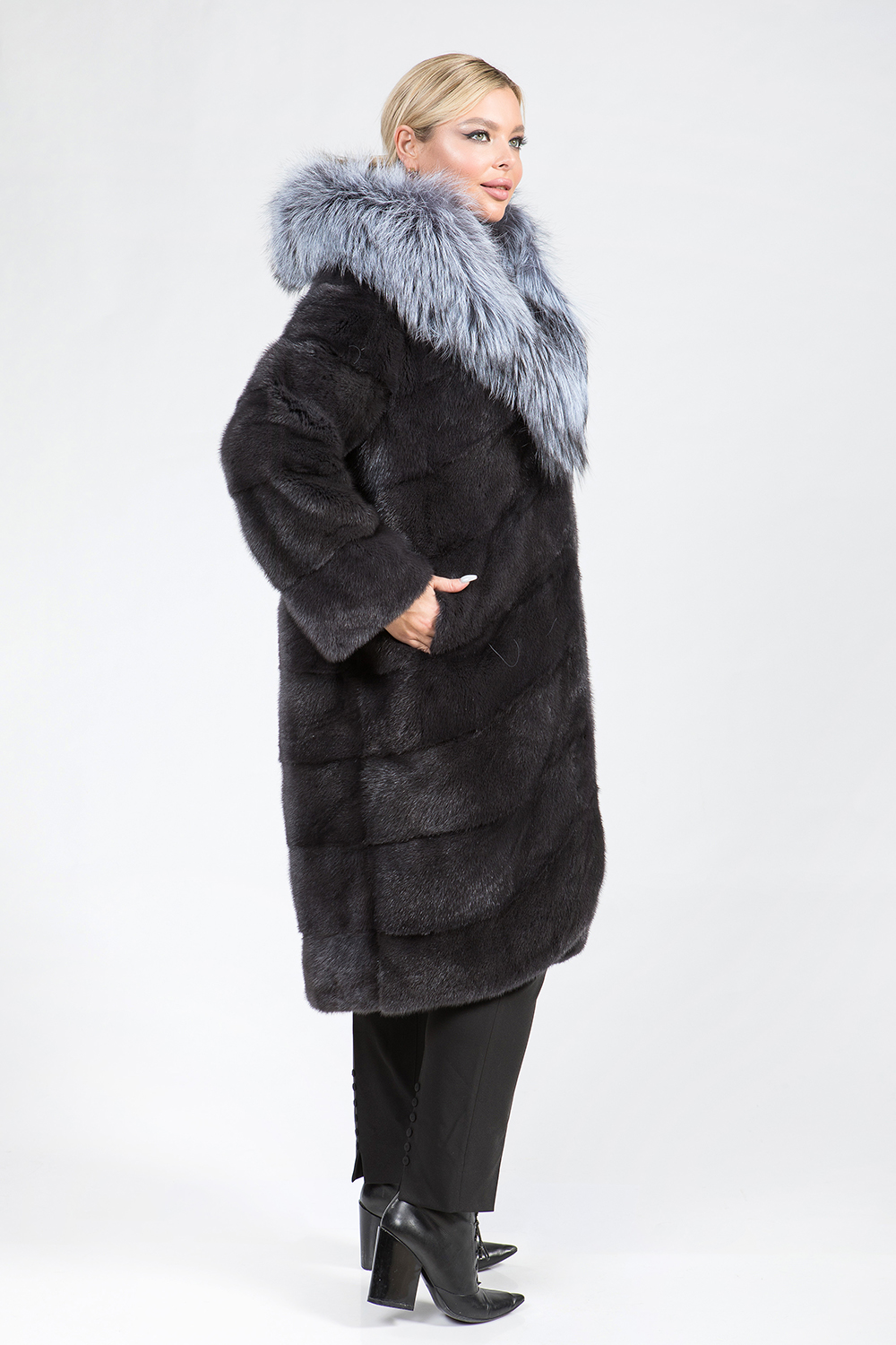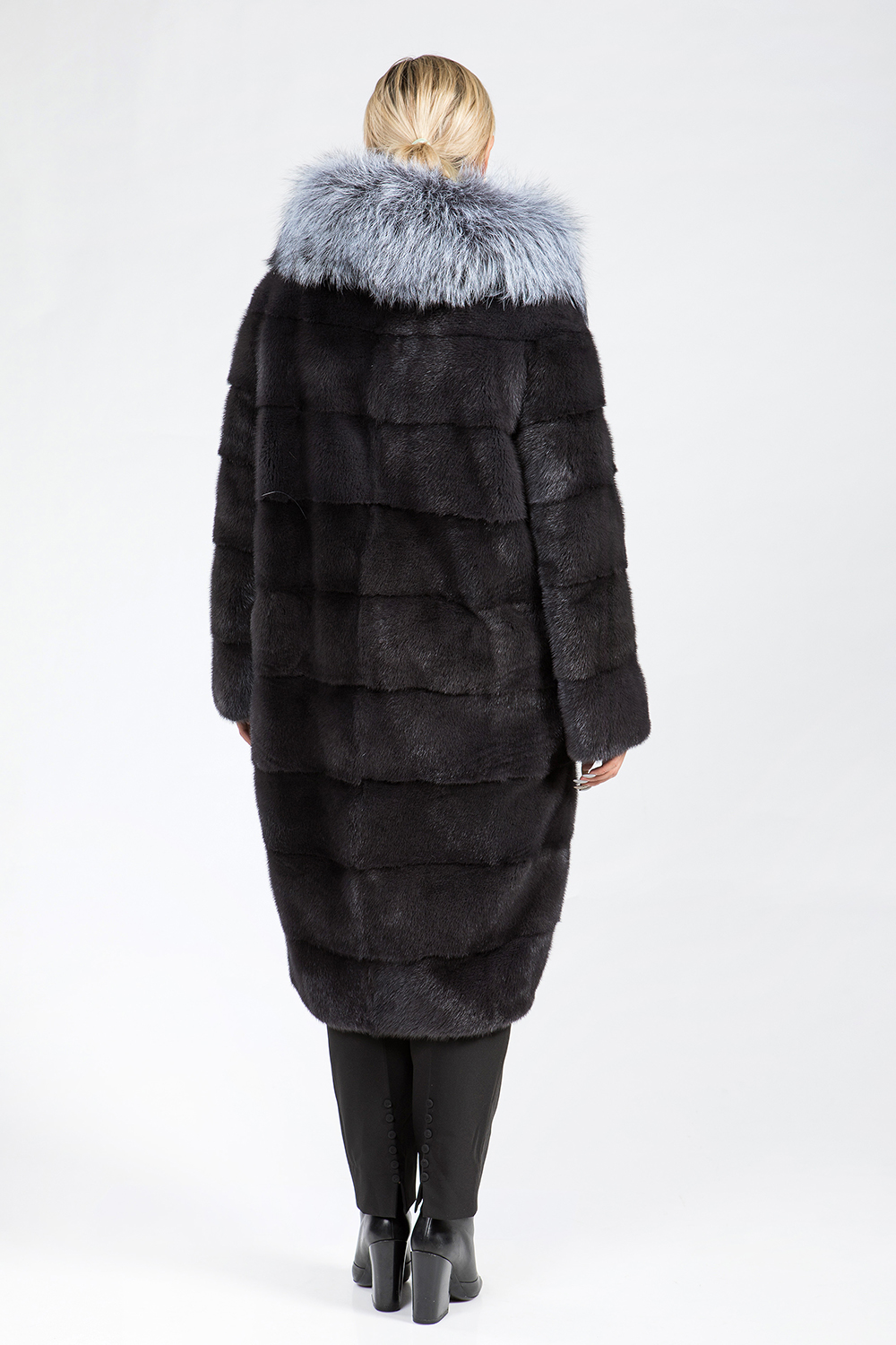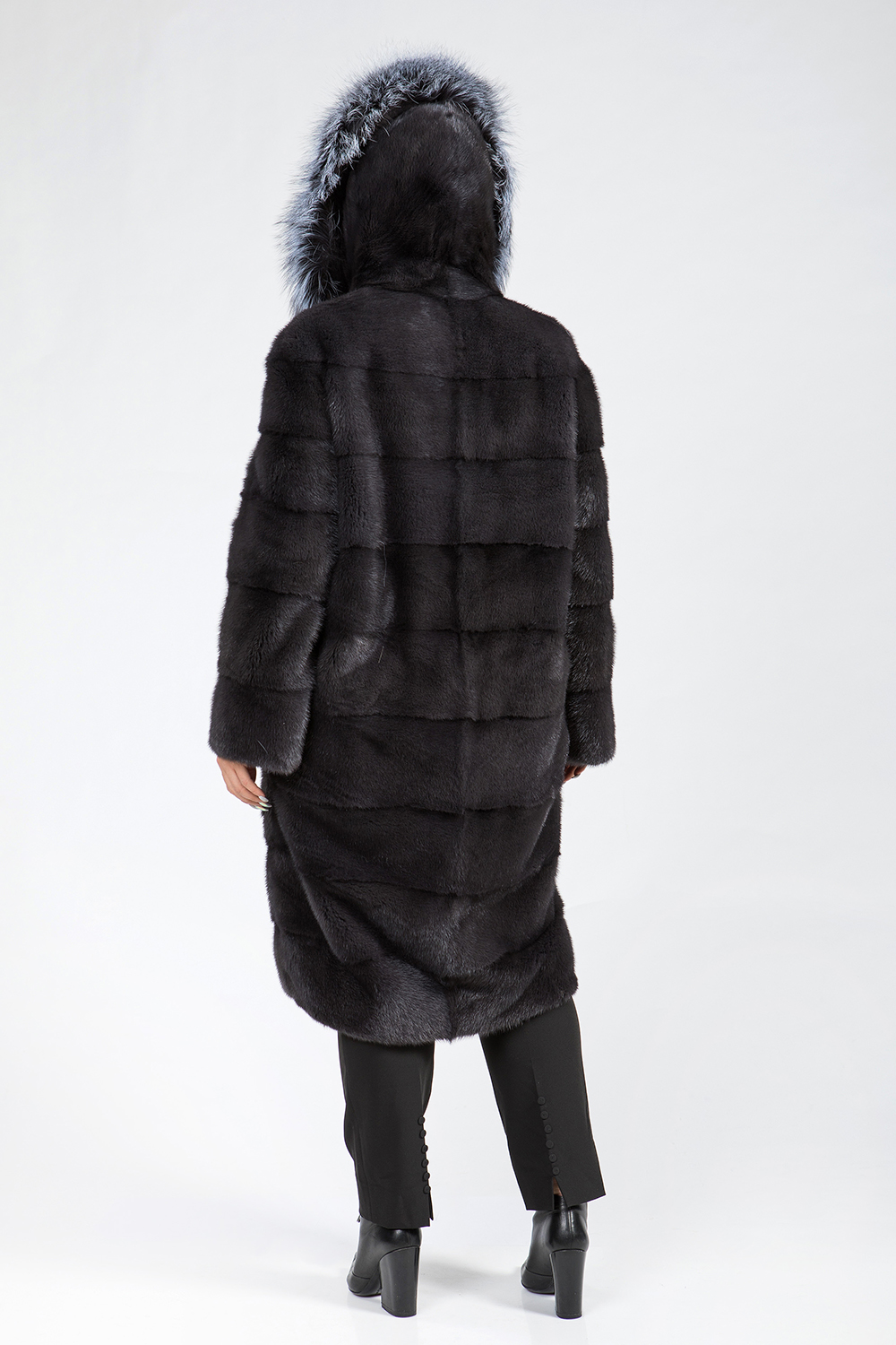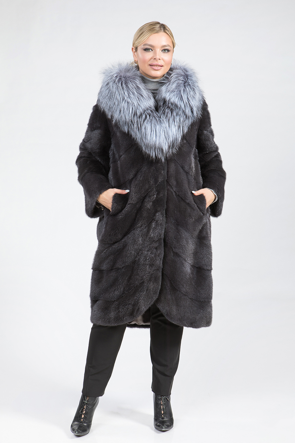 Полупальто из меха норки. Капюшон модели декорирован мехом чернобурой лисы. Крой мехового пальто комбинированный, перед изделия диагональная выкладка пластин, а спинка поперечная выкладка. Модель оснащена регулирующими утяжками на рукавах и на талии. Низ изделия слегка закруглен. Длина шубы 110 см. Модель выглядит эффектно, благодаря шикарной лисе и элегантному оттенку муссона, такое сочетание придает шубке презентабельность!