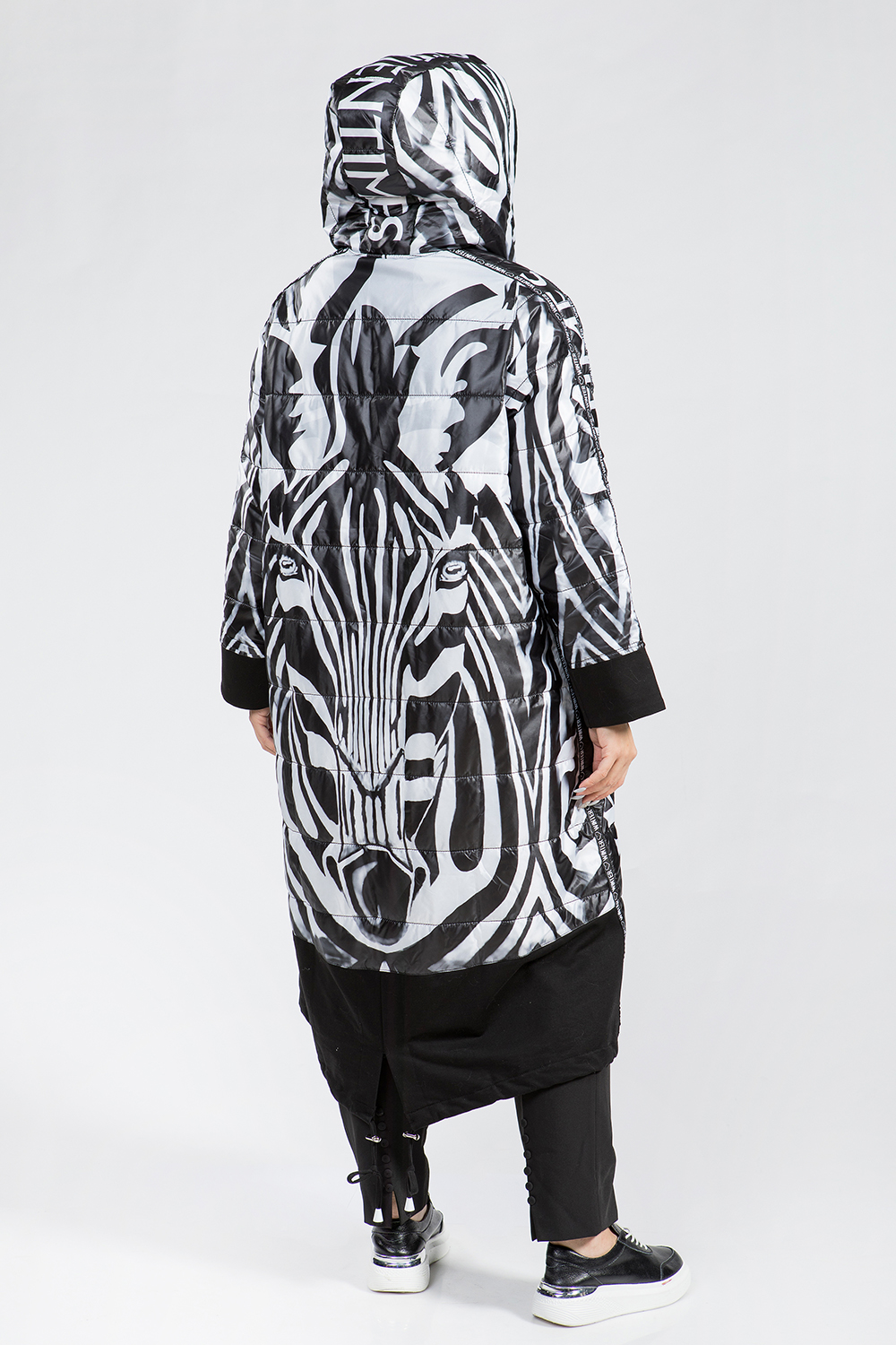 Полупальто женское из текстиля с утеплителем. Перед модели выполнен из трикотажа, а спина с тонким утеплителем, который рассчитан на теплую весну. Модель напоминает удлиненную кофту. Полупальто с капюшоном застегивается на молнию. Спинка модели декорирована ярким, позитивным принтом. Длина изделия спереди 105 см, а сзади 120 см. Полупальто снизу имеет регулирующую утяжку. Модель стильная и оригинальная, подойдет дамам любой комплекции!