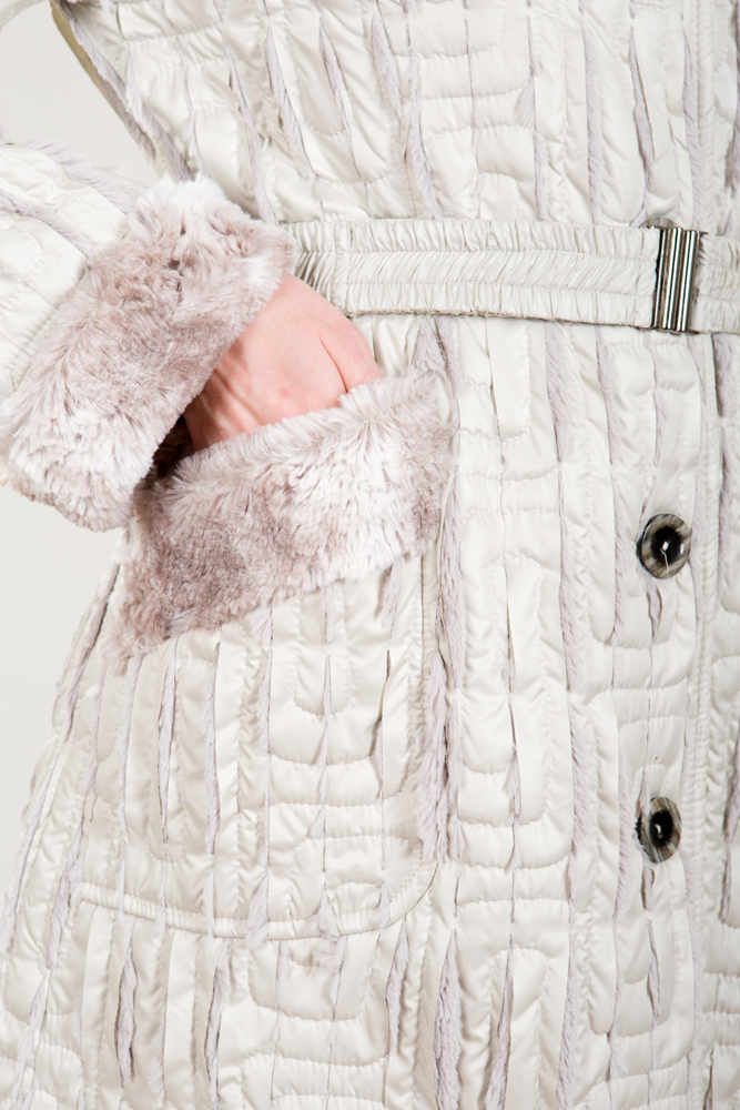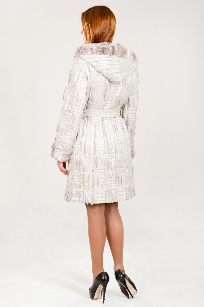 Женское полупальто с капюшоном из экологически-чистого заменителя натурального меха и текстиля. Оригинальная приталенная модель на поясе с накладными карманами.