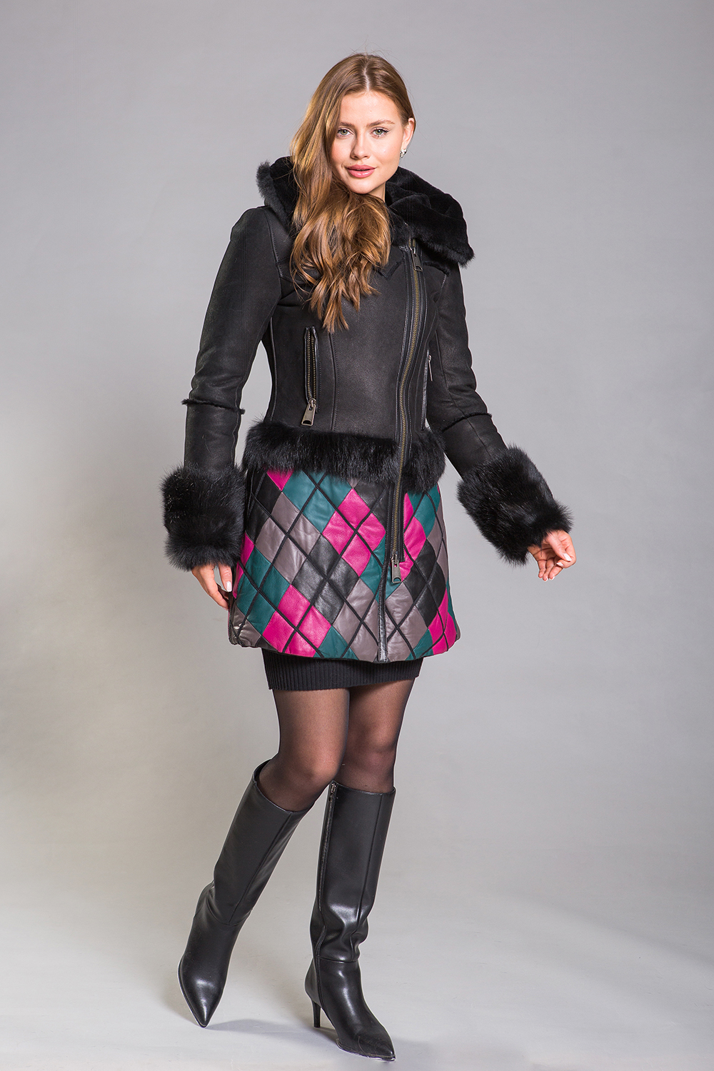 Облегчённая дублёнка из овчины с капюшоном и приталенным силуэтом — идеальный выбор для весны и осени. Эта модель декорирована разноцветной кожей и украшена мехом тосканы, что придаёт ей особый шарм. Не упустите возможность стать обладательницей этой великолепной дублёнки!