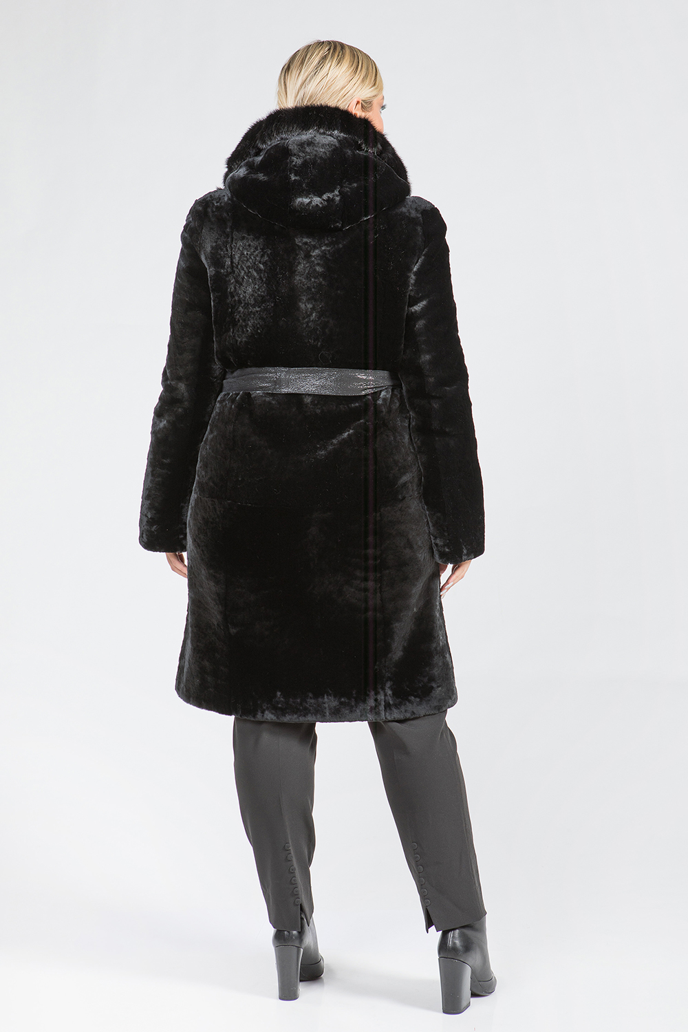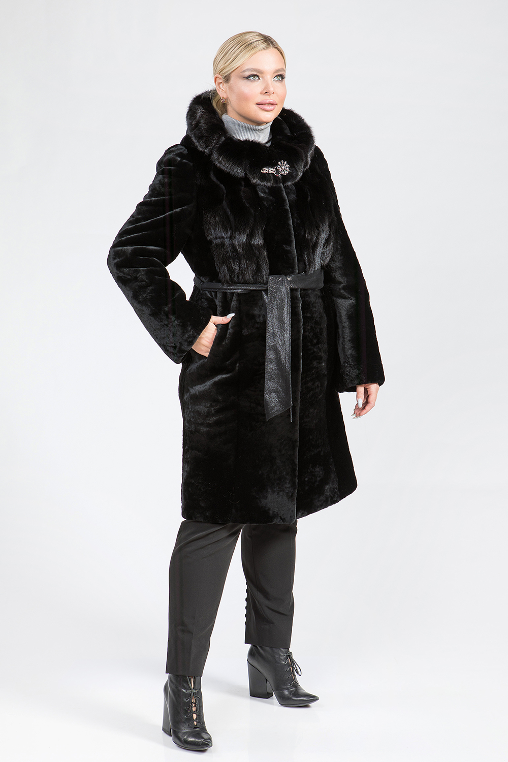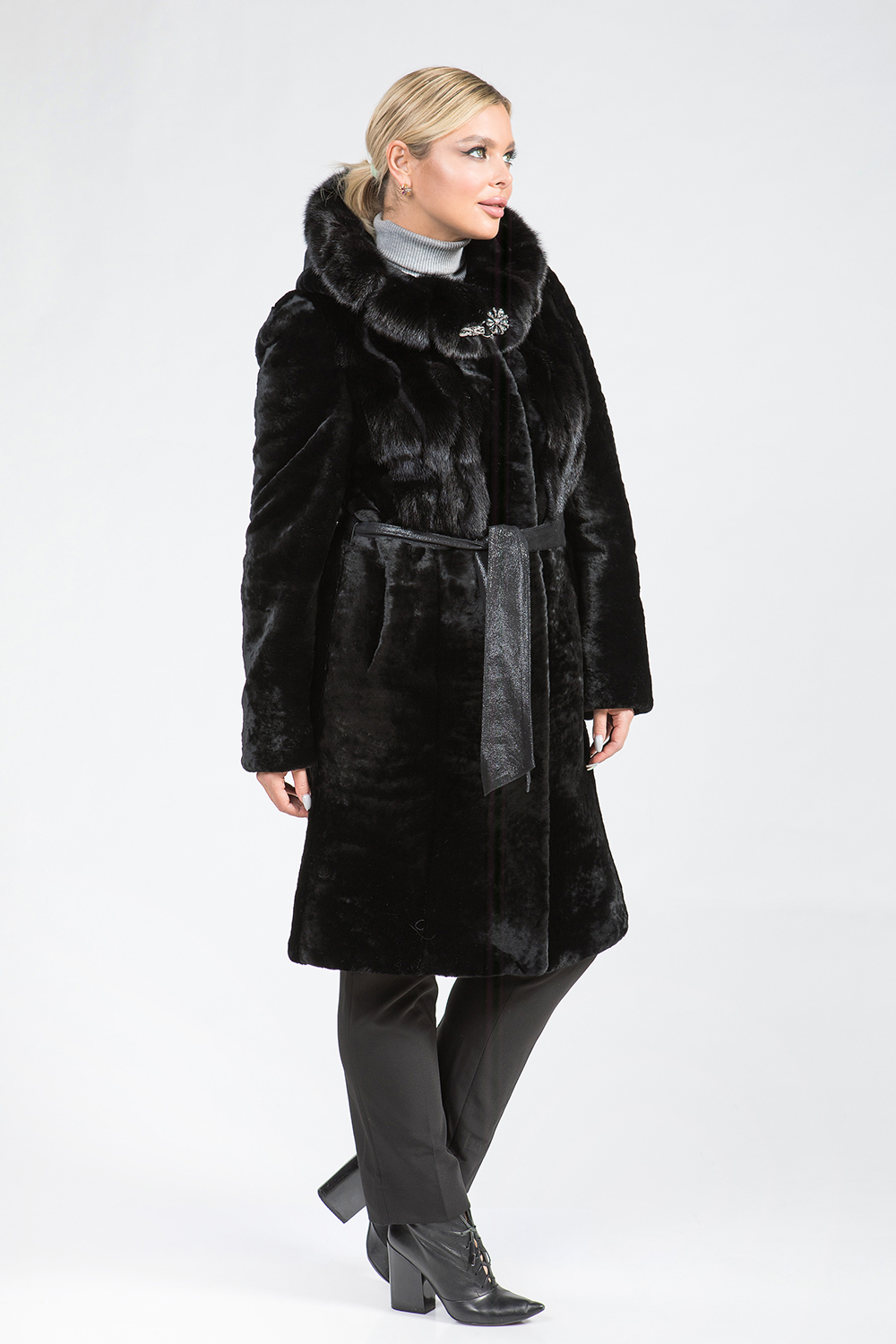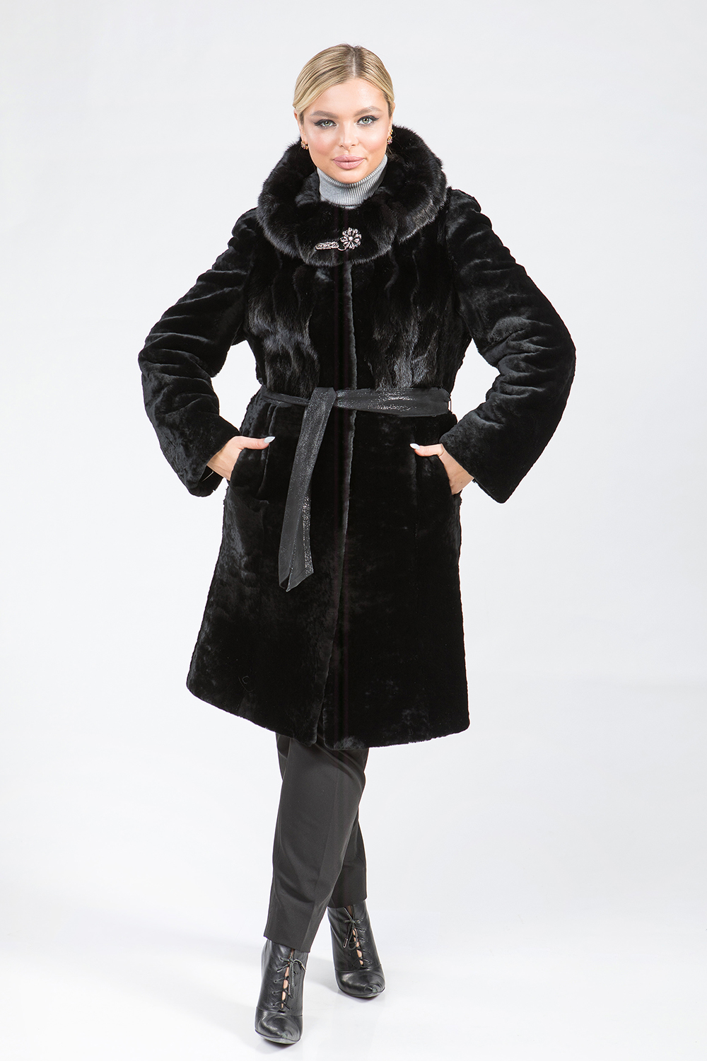 Чёрное меховое пальто гармонично сочетается как с аксессуарами в спокойных тонах, так и с яркими, эффектными вещами. Завершает образ пояс, который подчёркивает стройность силуэта.