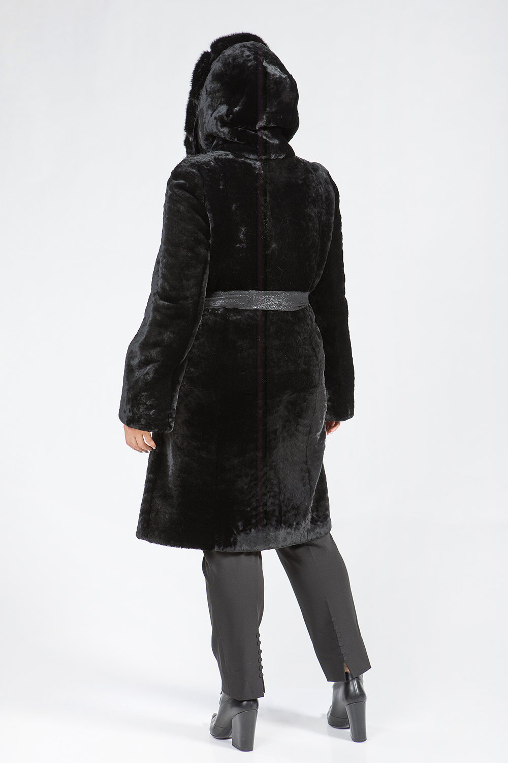 Полупальто из овчины с капюшоном, украшенным мехом норки. Пластинчатый крой изделия придаёт ему элегантность. Передняя часть полупальто декорирована фигурными вставками из норки. По бокам модели расположены карманы. Застёгивается шубка на клипсы. Длина изделия составляет 100 см.