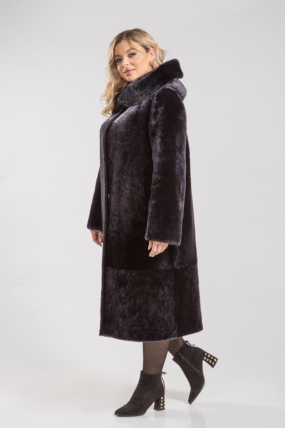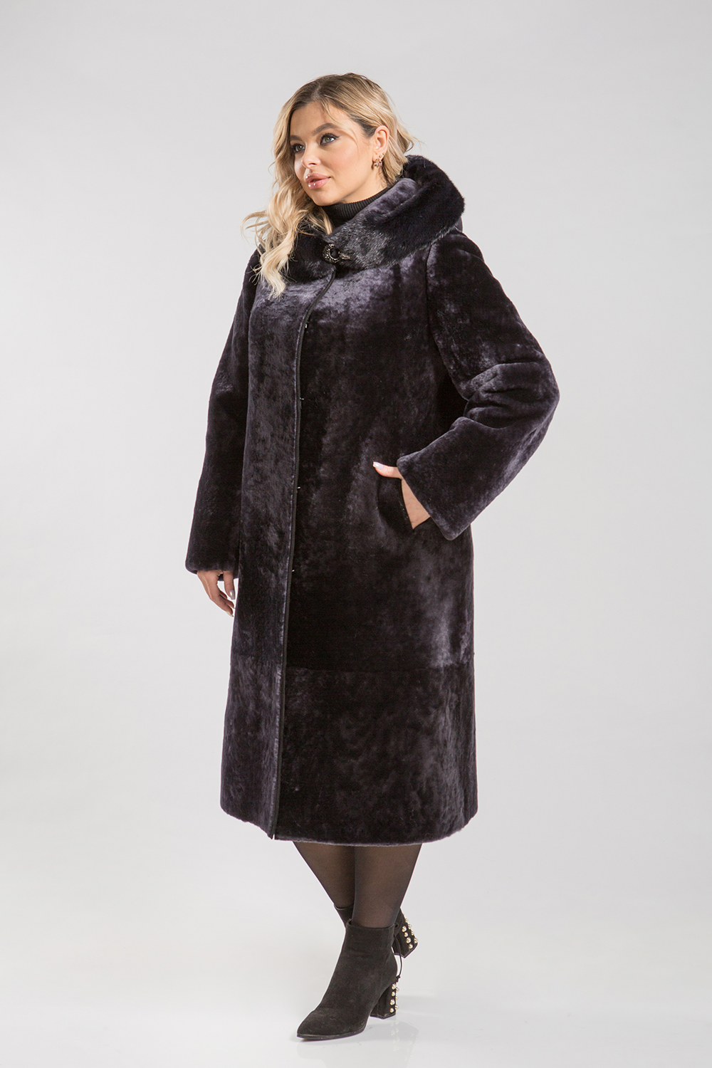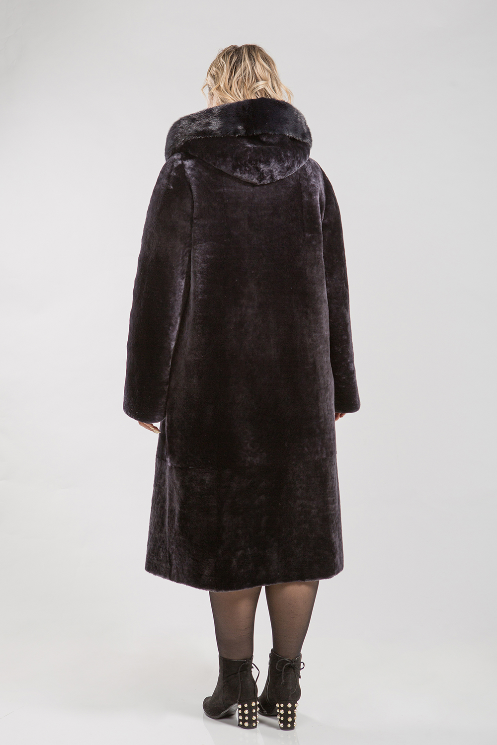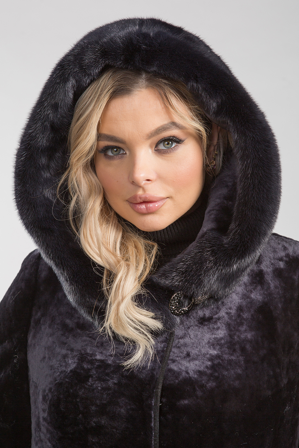 Полупальто, сшитое из овчины, с капюшоном, украшенным норковым мехом. Рукава можно подвернуть, чтобы создать эффектный манжет, а при необходимости — укоротить. Кармашки и борта изделия отделаны натуральной кожей. Длина полупальто составляет 115 см.