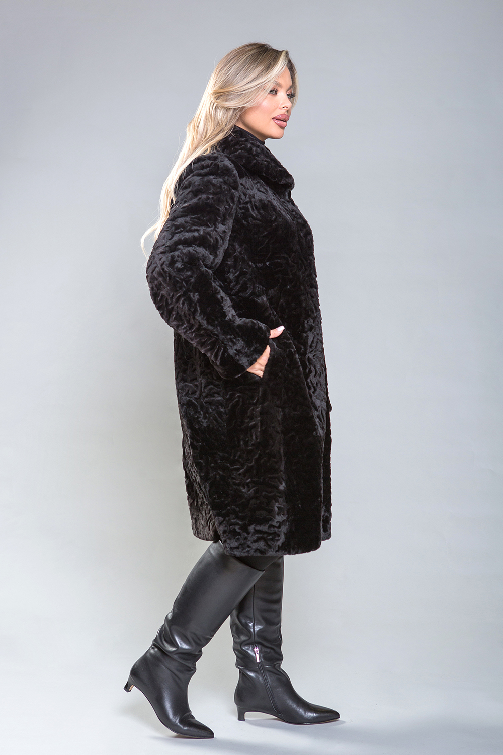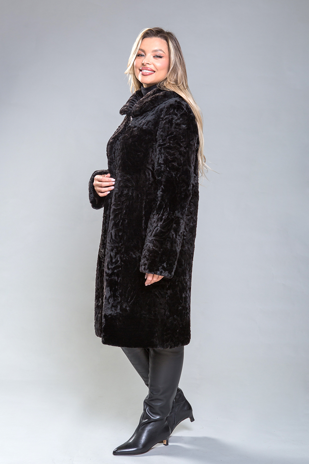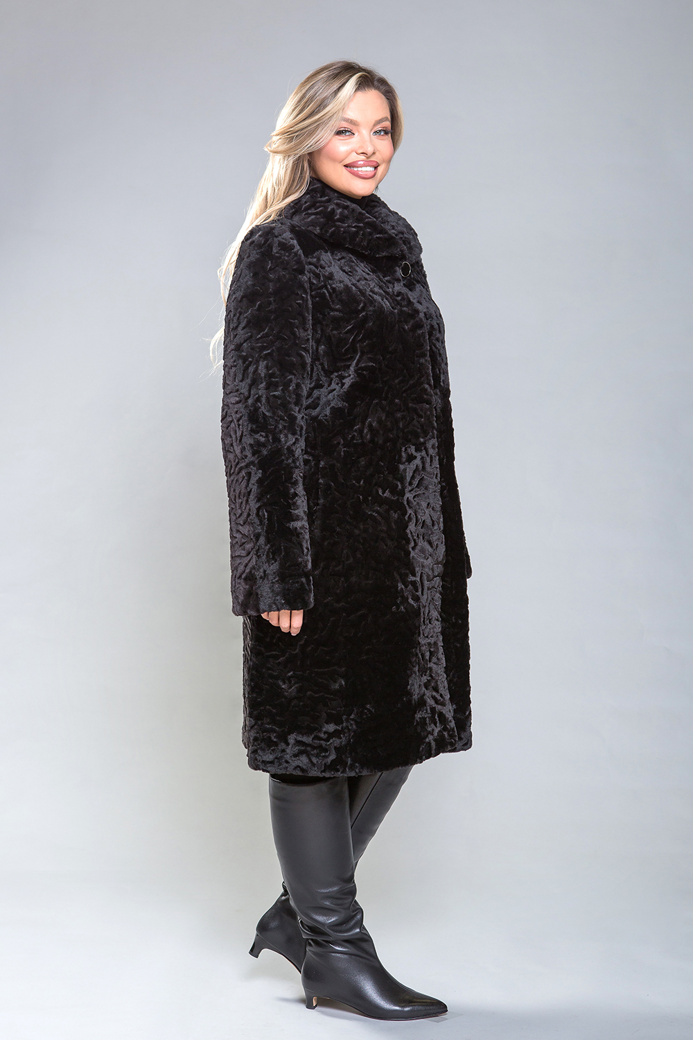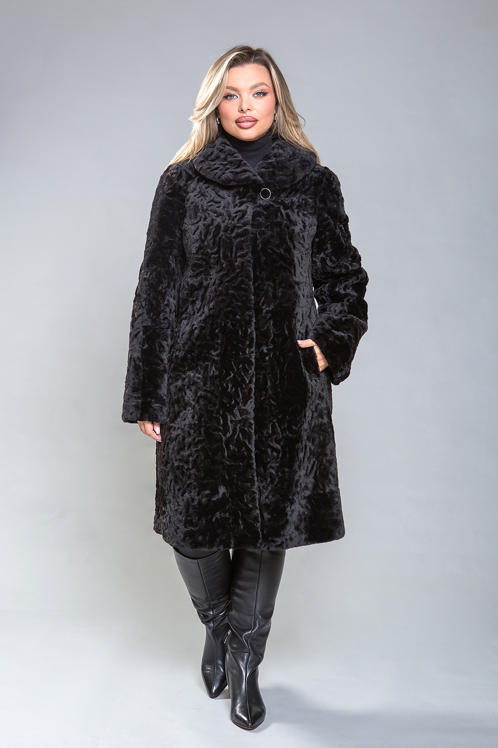 Полупальто из овчины — стильная и практичная модель. Воротник фиксируется на пуговицу, а шубка застегивается на клипсы. Длина изделия составляет 100 см. Модель изготовлена из овчины с фактурным теснением. Это универсальное решение, подходящее для любого типа фигуры. Профессиональные стилисты отмечают, что классический силуэт полупальто добавляет образу элегантности и утонченности.