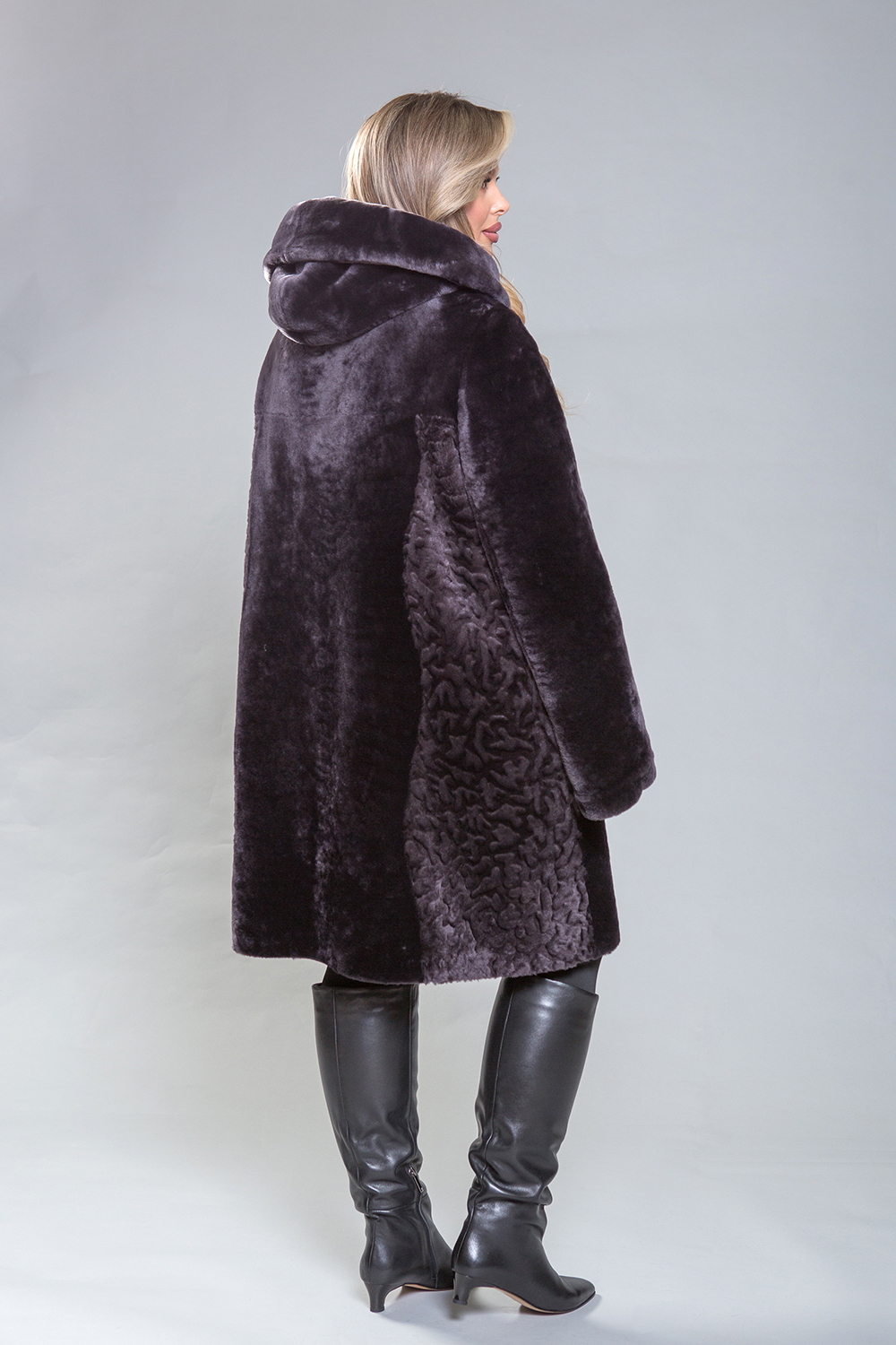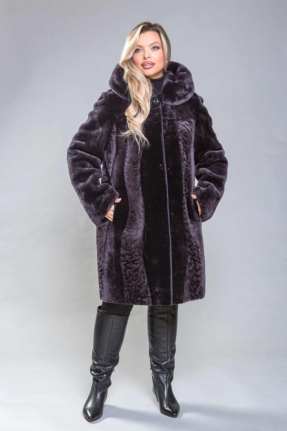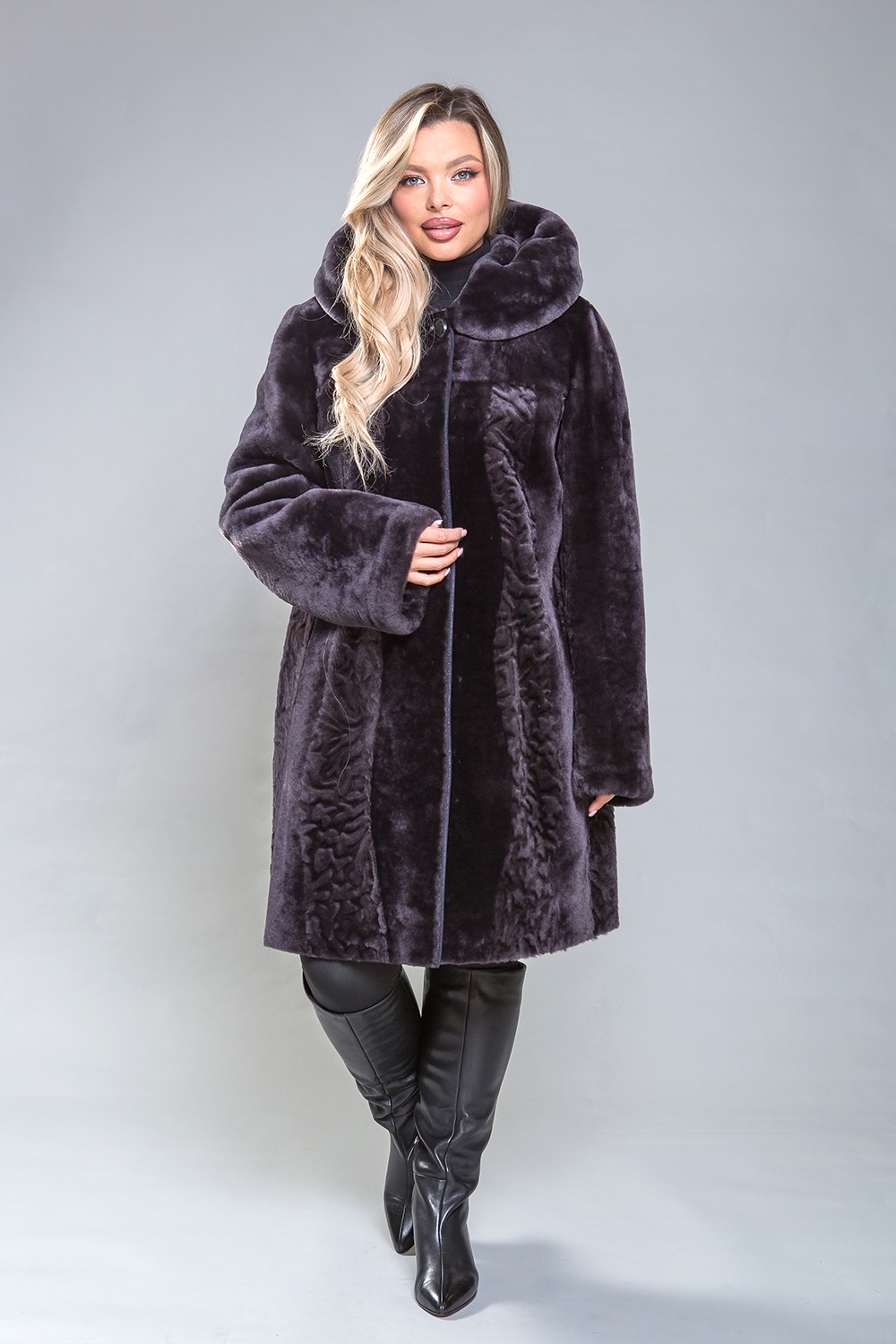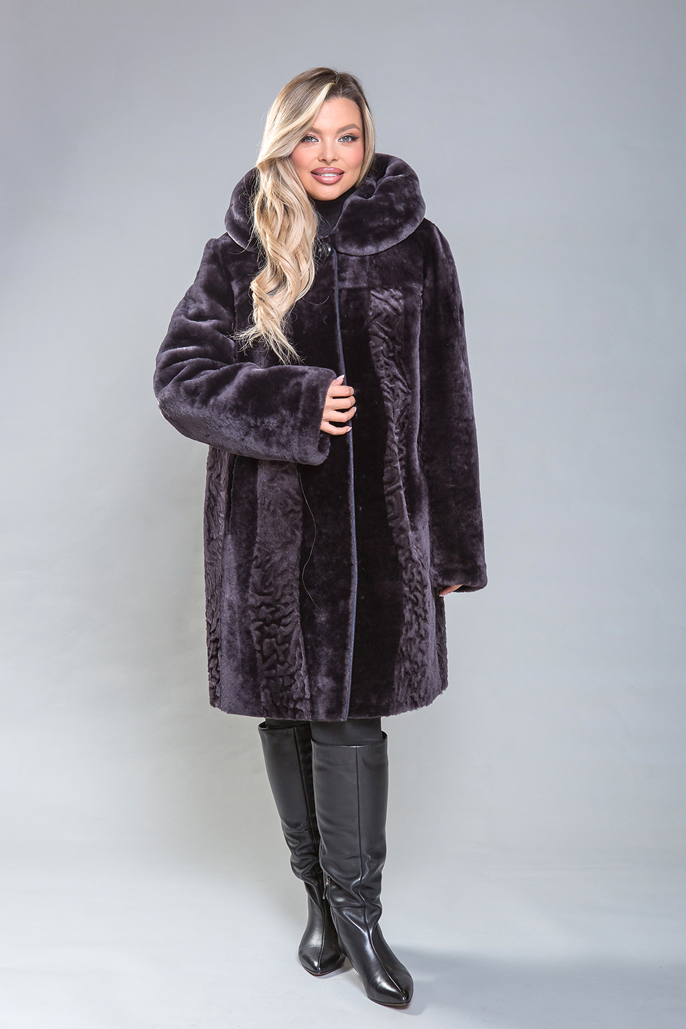 Полупальто из овчины с капюшоном. Модель украшена декоративной узорной выстрижкой, расположенной вертикально по шубе, спереди и по бокам. Капюшон застегивается на пуговицу, шубка — на клипсы. Современный фасон изделия визуально уменьшает объемы и скрывает проблемные зоны. Длина — 95 см. Это легкое, уютное и комфортное полупальто.