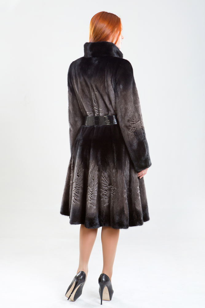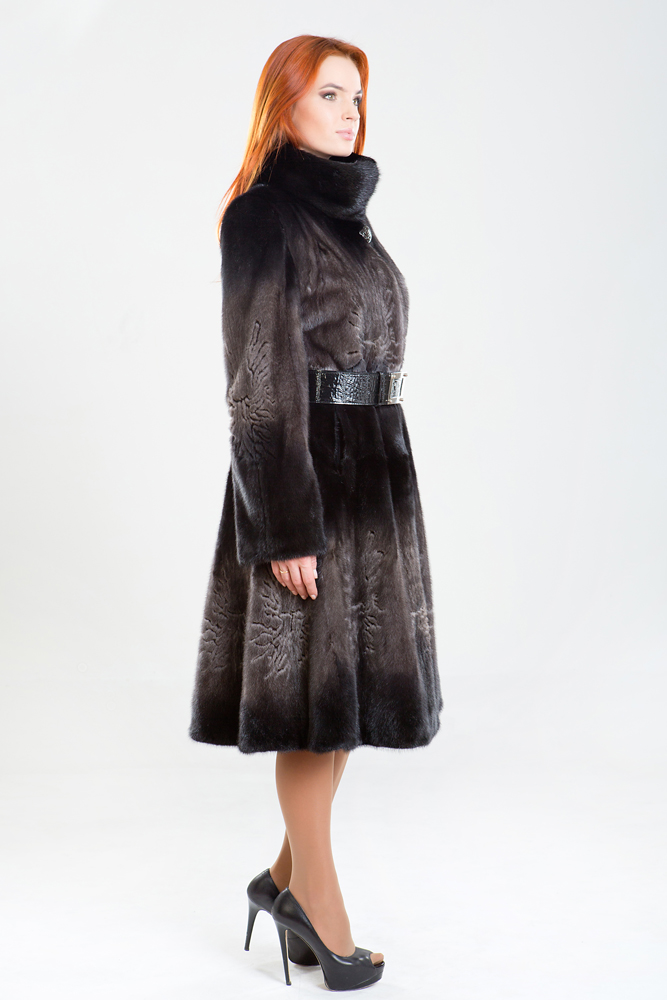 Полупальто из норкового меха. Воротник-стойка. Крой с добавлением пластин и роспуском. Длина изделия — 105 см. Юбка расклешена и украшена лазерной выстрижкой. В комплекте меховой пояс. Пальто с приталенным силуэтом и воротником визуально подчеркивает стройность фигуры!