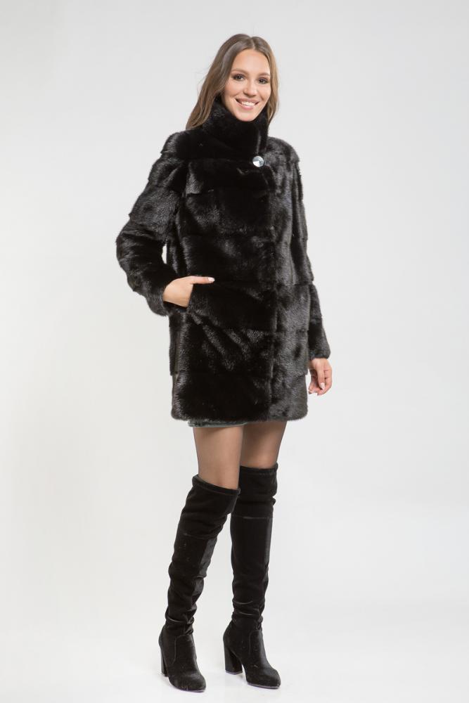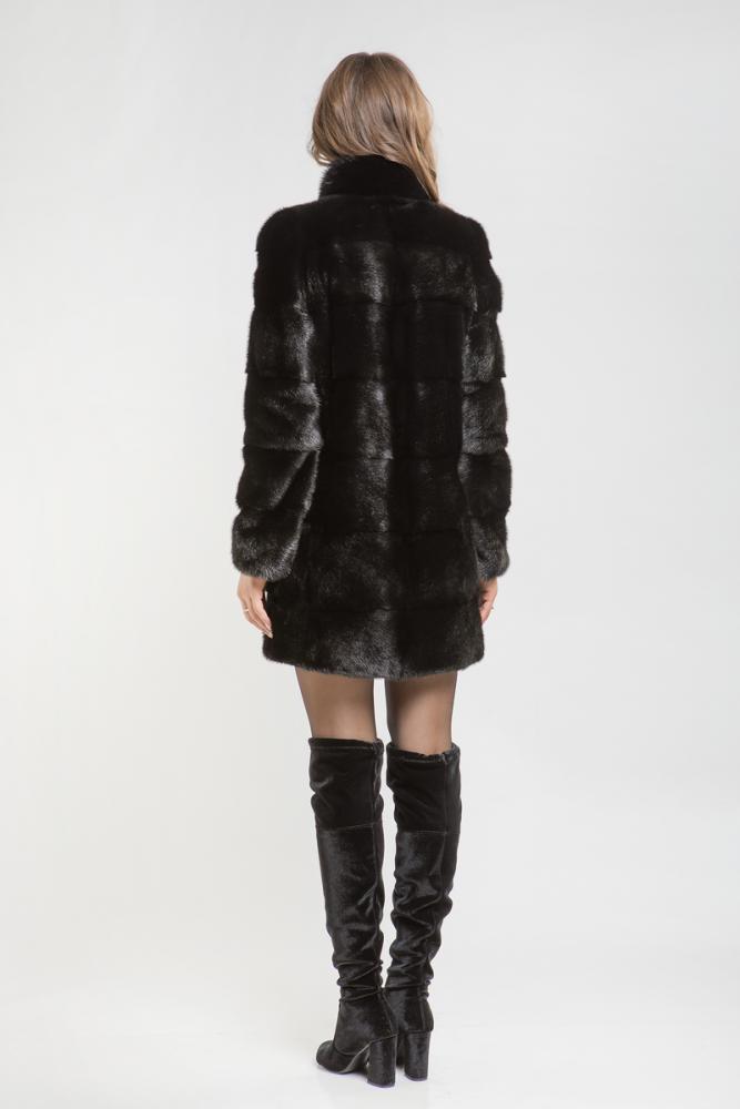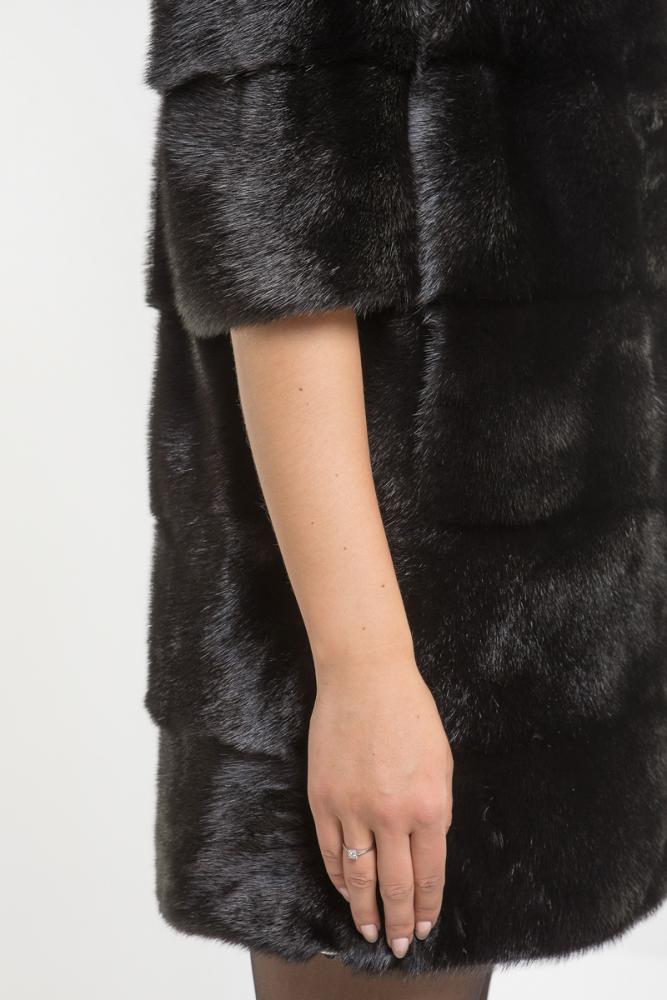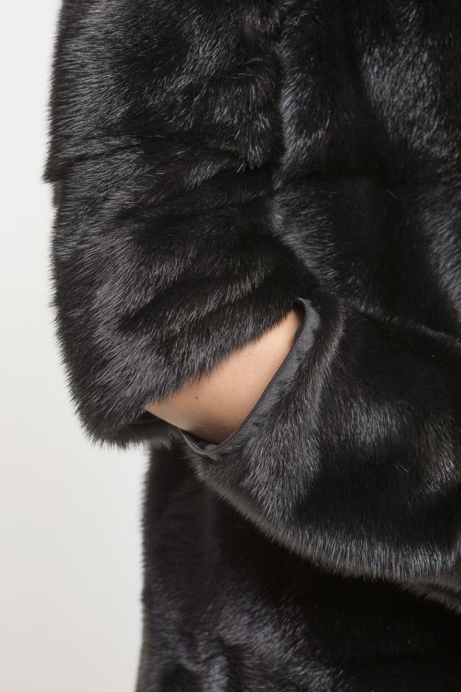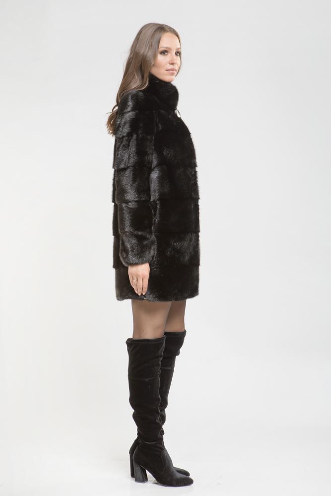 Полупальто из норки с воротником-стойкой. Крой выполнен с поперечной выкладкой пластин. Длина изделия составляет 90 см. Рукава можно трансформировать в более короткие, что позволяет носить их с длинными перчатками или митенками.
