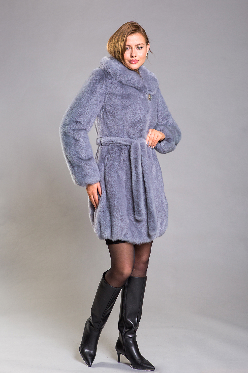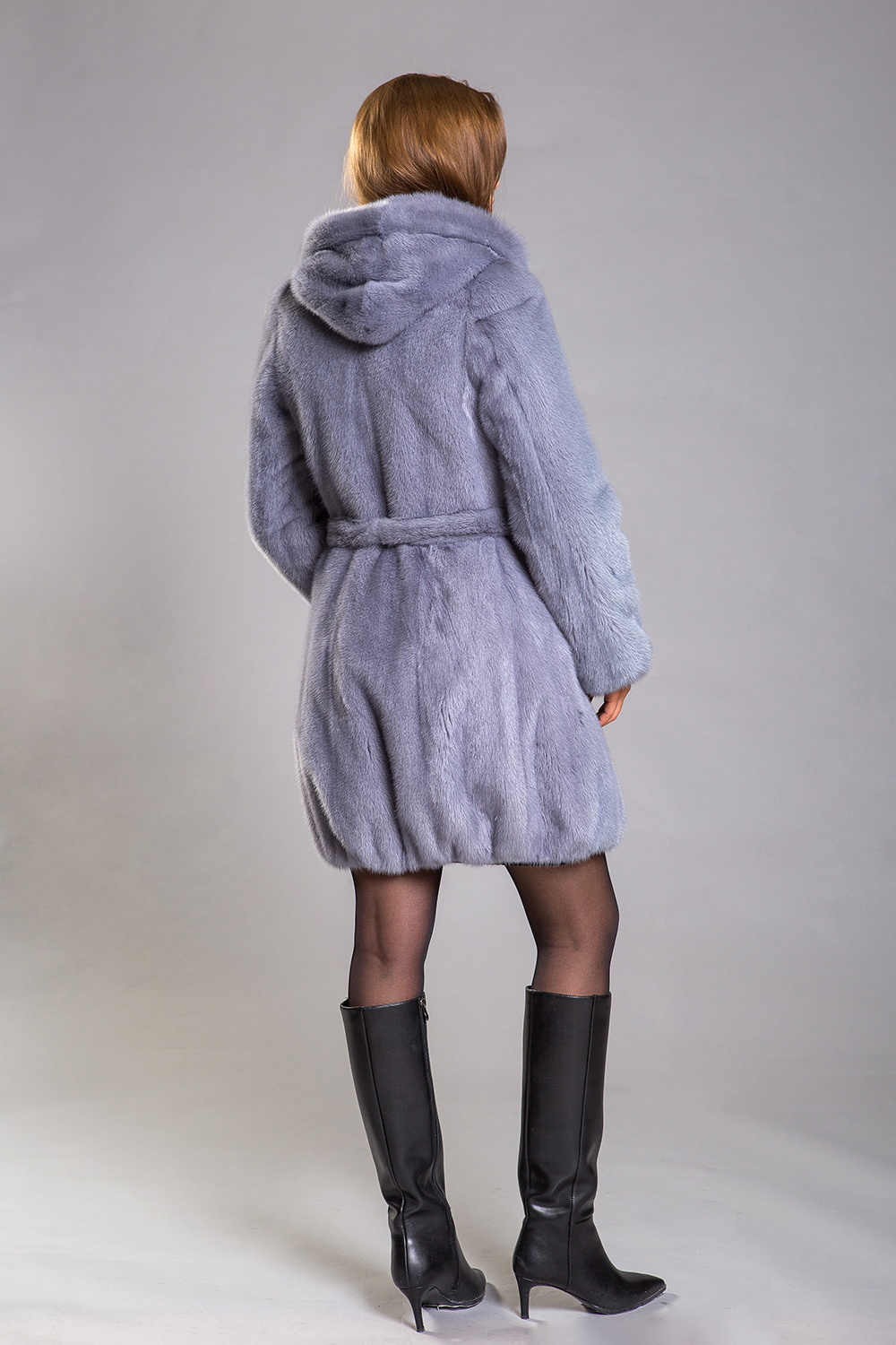 Норковое полупальто с капюшоном, скроенное по технологии роспуска с добавлением пластин. Низ изделия слегка присобран, что делает его ещё более привлекательным. Длина шубки — 90 см. В качестве дополнения к модели идёт пояс, который позволяет подчеркнуть стройность фигуры. Эта шубка не только добавит вашему образу кокетливости, но и сделает его более презентабельным.