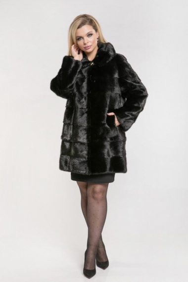 Полупальто из меха норки с капюшоном. Изделие имеет необычный крой, который заключается в поперечной выкладке пластин. Длина шубки составляет 90 см. Особенность модели — возможность отстёгивать рукава и низ, что превращает шубку в миниатюрную и изящную курточку.