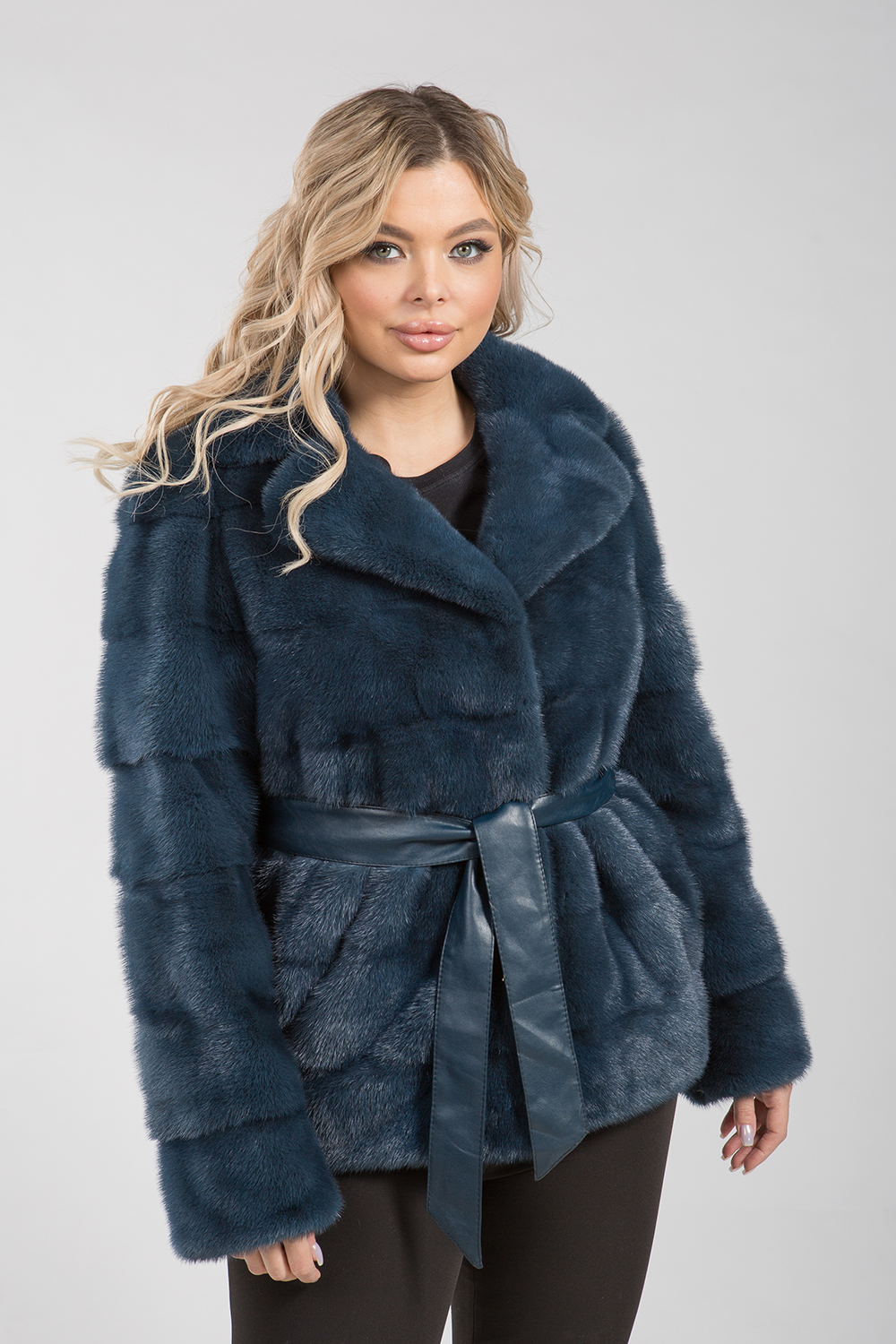 Норковая курточка с английским воротником, который легко трансформируется в классический. Модель имеет поперечную выкладку пластин. Внутри на талии, на рукавах и по низу курточки предусмотрены регулирующие утяжки. С помощью скрытых молний можно сделать рукава более укороченными. Длина изделия составляет 70 см. В комплект входит кожаный пояс.