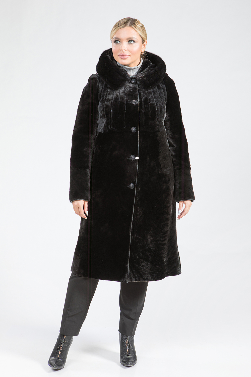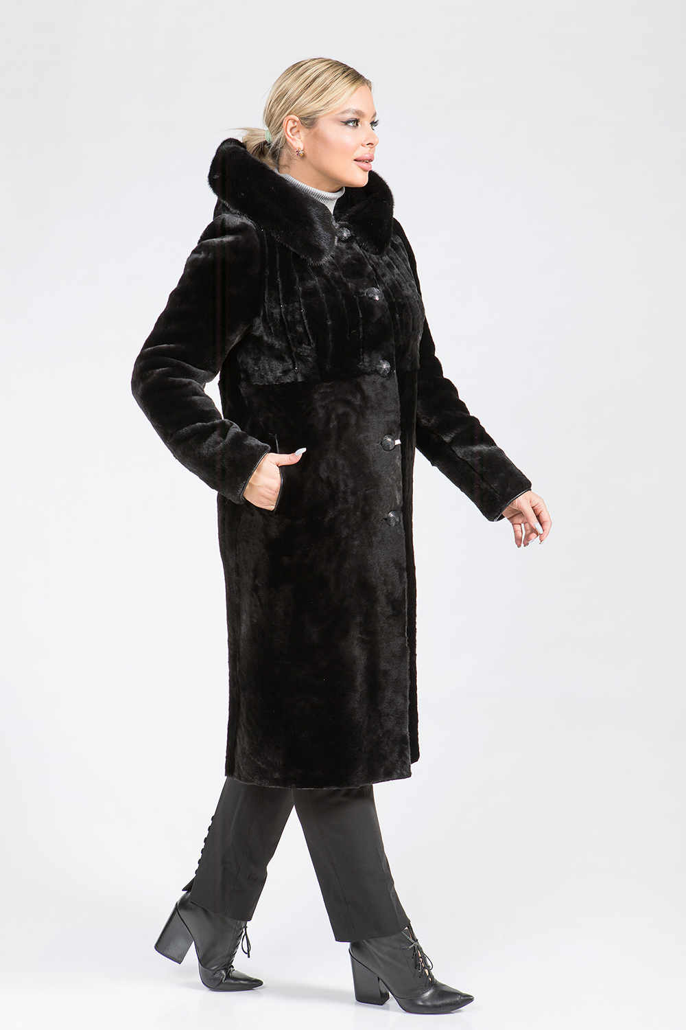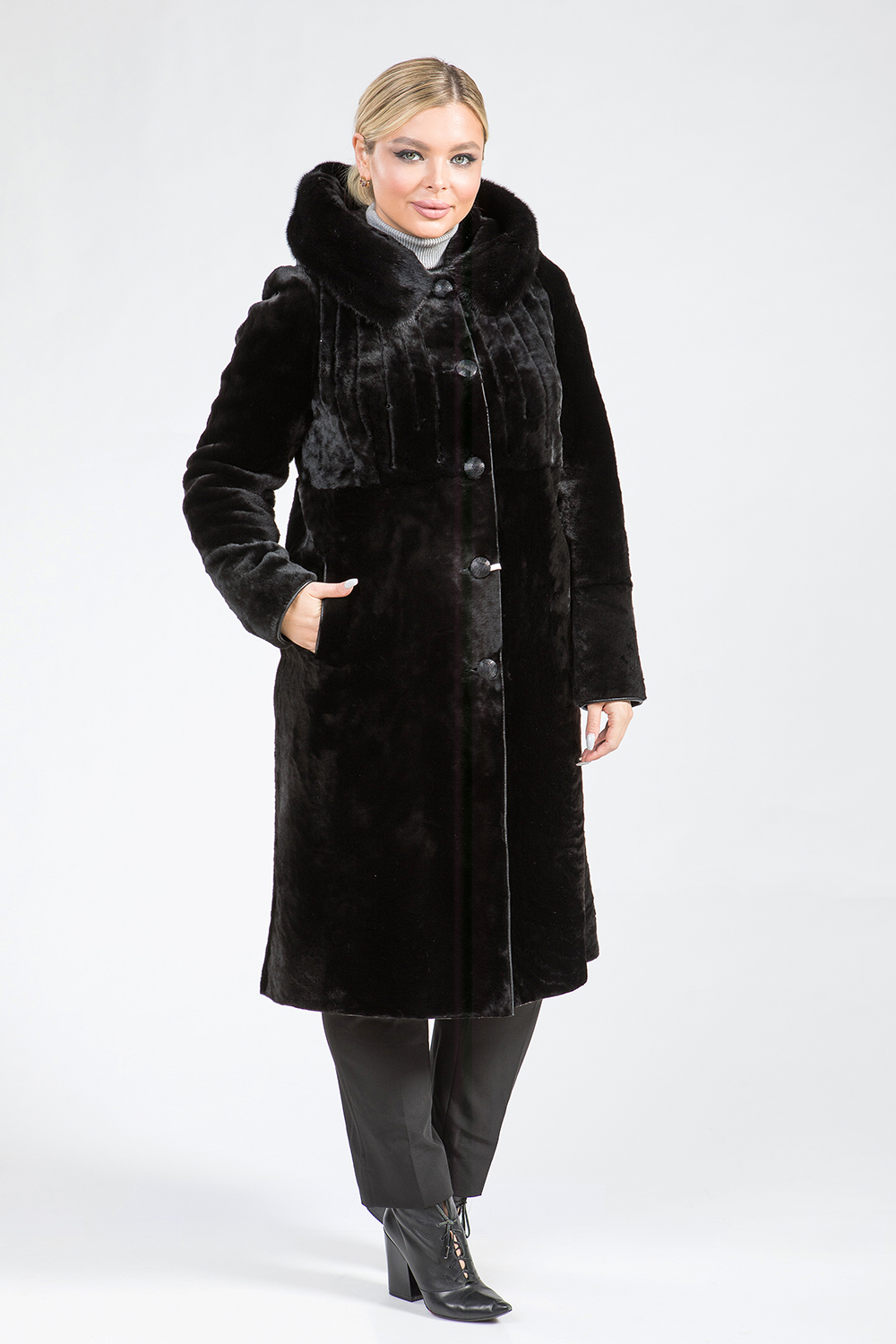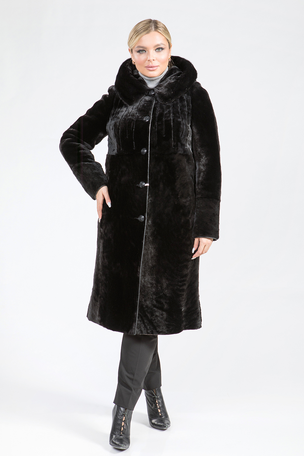 Полупальто из меха овчины. Капюшон модели дополнен мехом норки. Крой изделия пластины. Рукава, карманы и борта шубки обработаны натуральной кожей. Модель застегивается на пуговицы. Длина изделия 110 см. Перед модели декорирован вертикальной вышивкой и слегка заметными стеклярусами. Шубка классического кроя выглядит элегантно, профессиональные стилисты считают классику безошибочным выбором!
