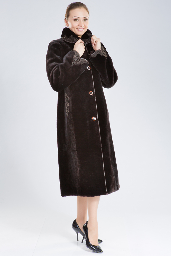 Полупальто из меха овчины. Воротник и рукава модели декорированы мехом каракуля. Борта изделия выполнены из натуральной замши. Модель застегивается на пуговицы. Длина изделия 120 см. Универсальный вариант! Шубку классического силуэта профессиональные стилисты считают безошибочным вариантом!