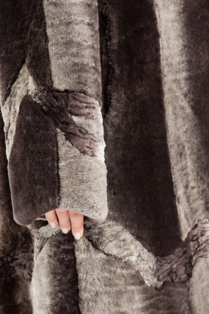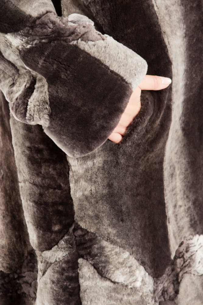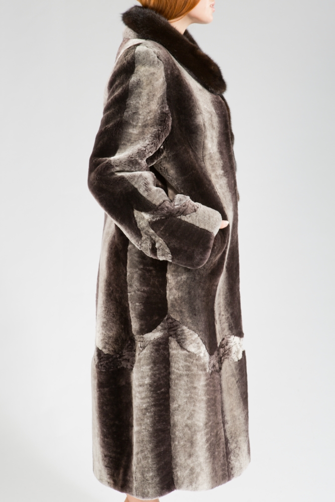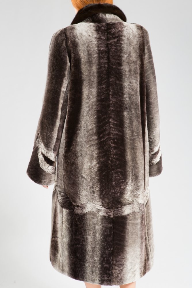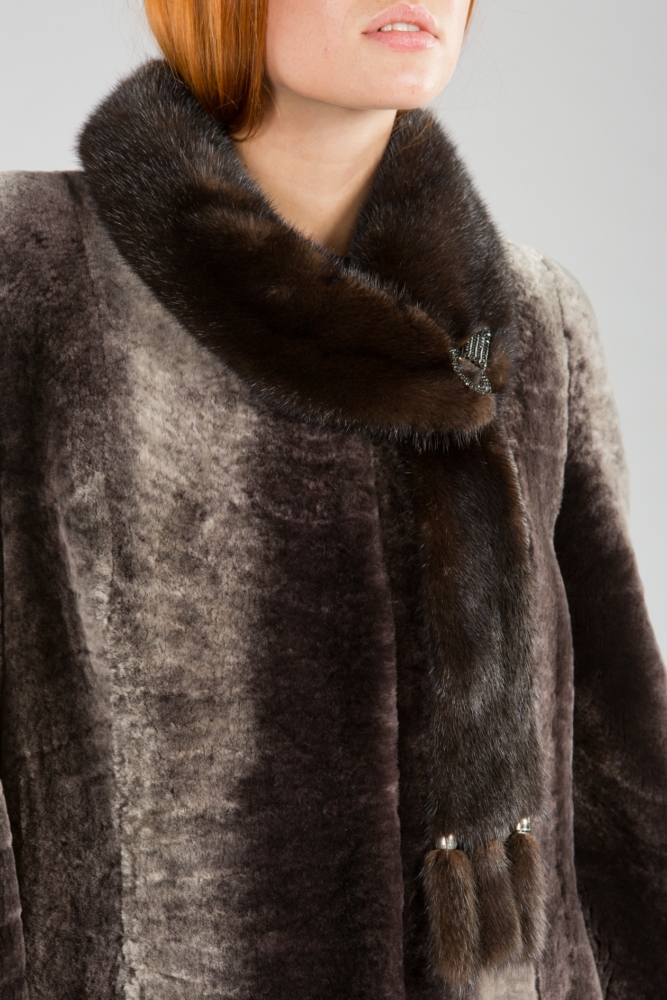 Полупальто из меха овчины. Воротник модели выполнен из меха норки и дополнен клипсой со стеклярусами. Изделие декорировано фигурной выстрижкой. Длина модели 115 см. Универсальный вариант! Шубка классического силуэта профессиональные стилисты считают безошибочным вариантом!