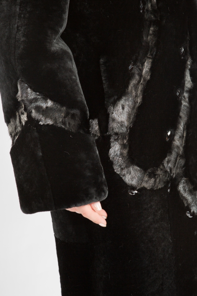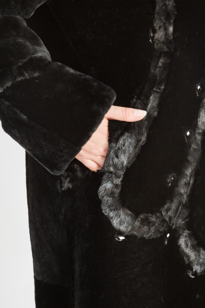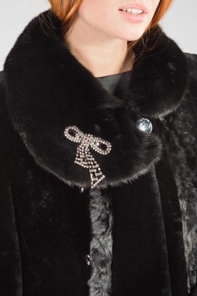 Полупальто из меха овчины. Воротник модели дополнен мехом норки и фиксируется магнитом. Изделие застегивается на клипсы. Шубка декорирована фигурными вставками из меха норки и оригинальной брошью, которую при желании можно убрать. Длина изделия 115 см. Рукава модели могут подворачиваться, образуя манжеты. Элегантный внешний вид шубки вдохновляет многих модниц на создание новых образов!