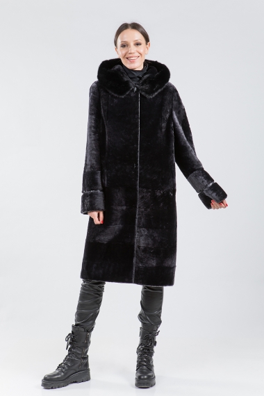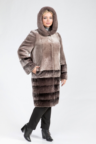 Полупальто из меха овчины с капюшоном. Крой изделия пластины. Рукава модели могут подворачиваться манжетом и укорачиваться, если в этом есть необходимость. Кармашки изделия обработаны натуральной замшей. Капюшон и низ модели декорированы красивой ажурной выстрижкой. Длина изделия 100 см. Застегивается шубка на клипсы. Натуральный мех овчины не боится атмосферных осадков, сохраняет тепло и защищает от ветра. Классическое полупальто с элементами декора в гардеробе всегда актуально!