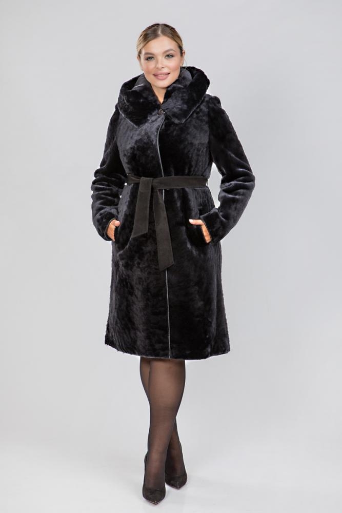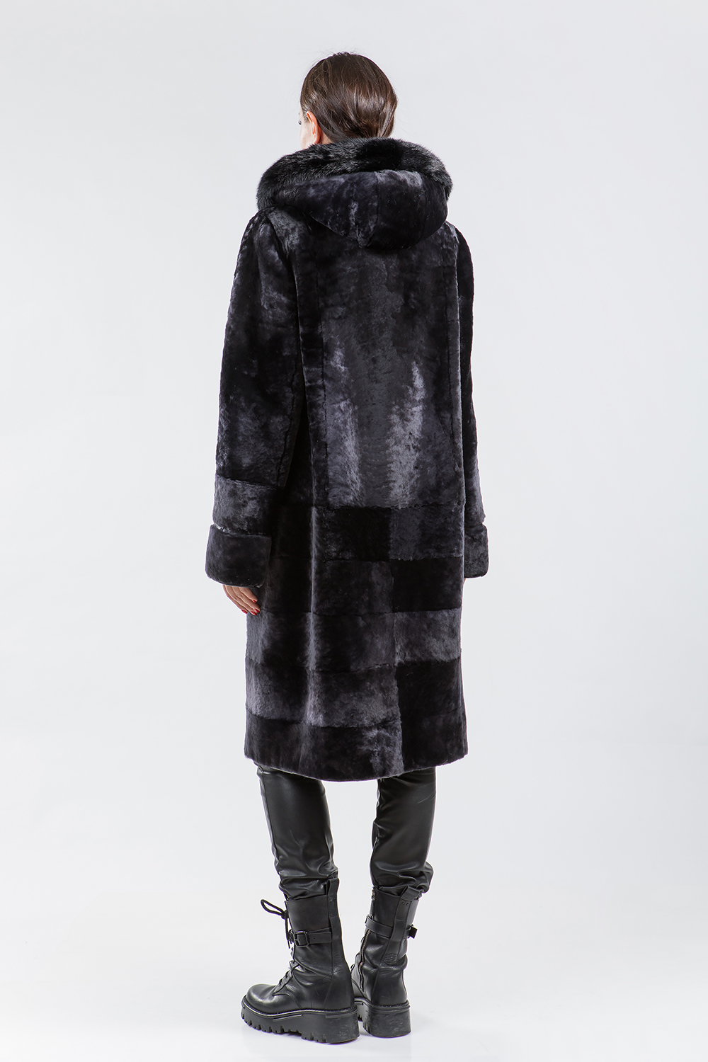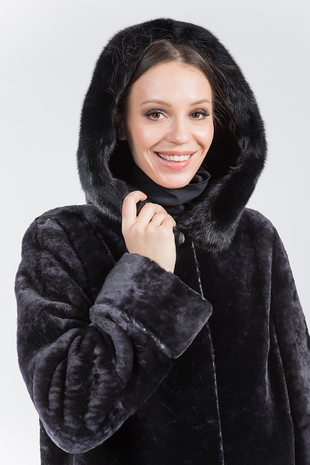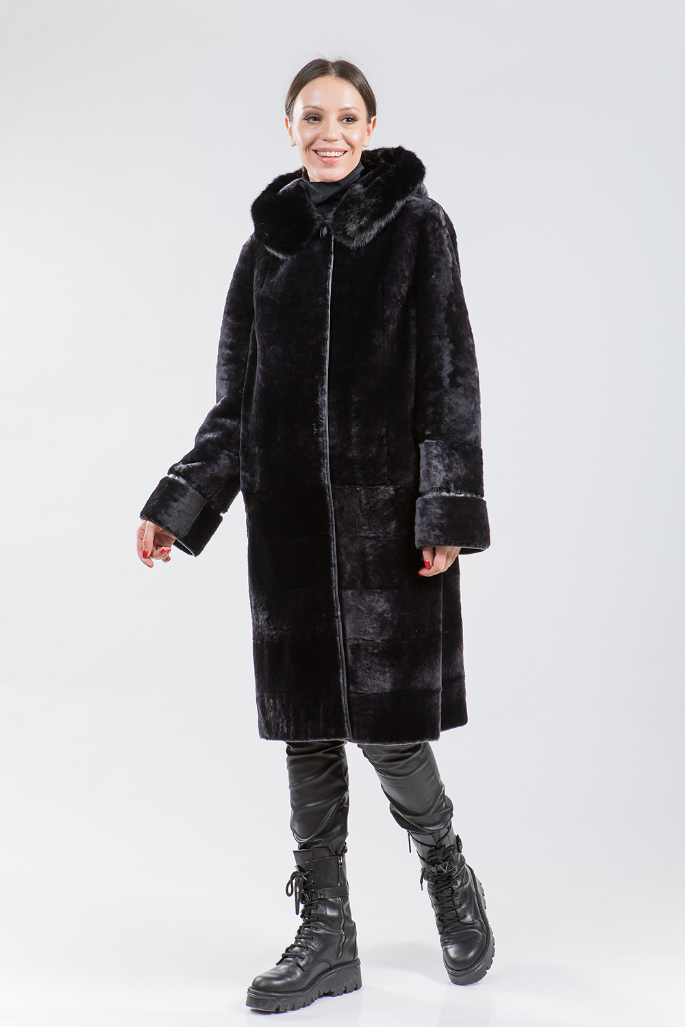 Полупальто из меха овчины. Капюшон модели декорирован мехом норки. Крой изделия пластины, низ модели-поперечная выкладка пластин. Рукава, карманы и борта шубки обработаны натуральной кожей. Модель застегивается на клипсы. Длина изделия 100 см. Шубка имеет универсальный фасон и подходит для любого типа фигуры!