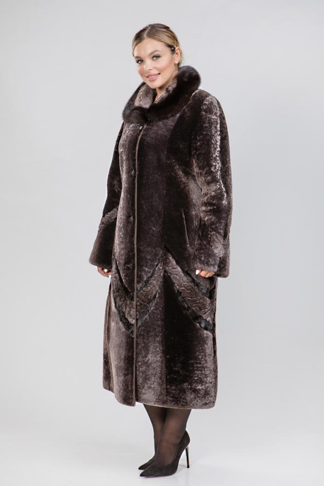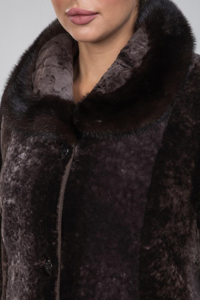 Полупальто из меха овчины. Воротник модели дополнен мехом норки. Изделие застегивается на пуговицы. Длина модели 120 см. Низ изделия декорирован мехом норки. Такая оригинальная и теплая шубка для ценительниц строгого классического стиля!