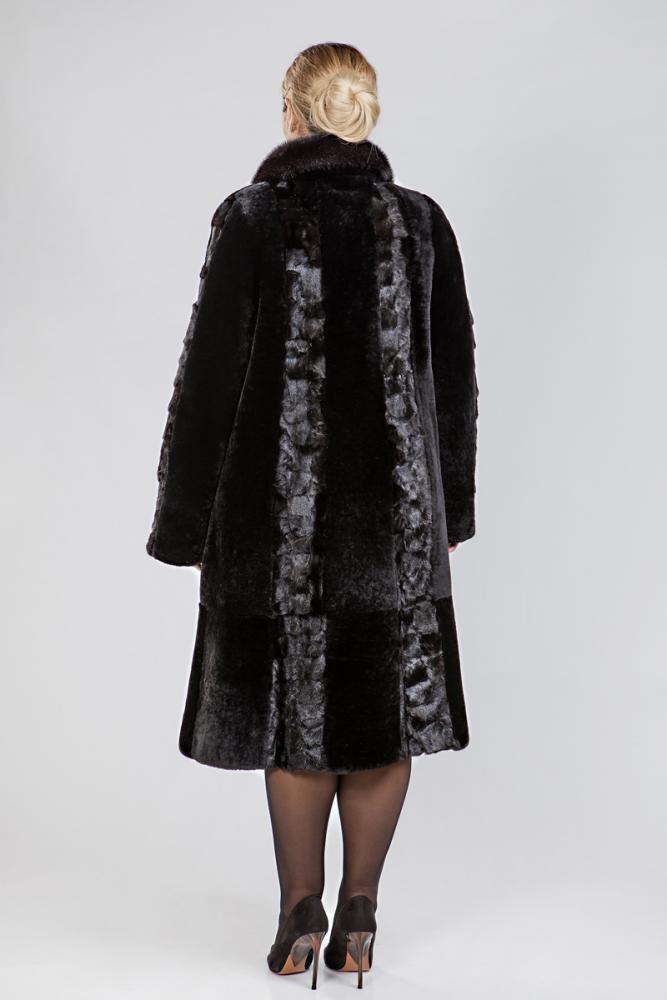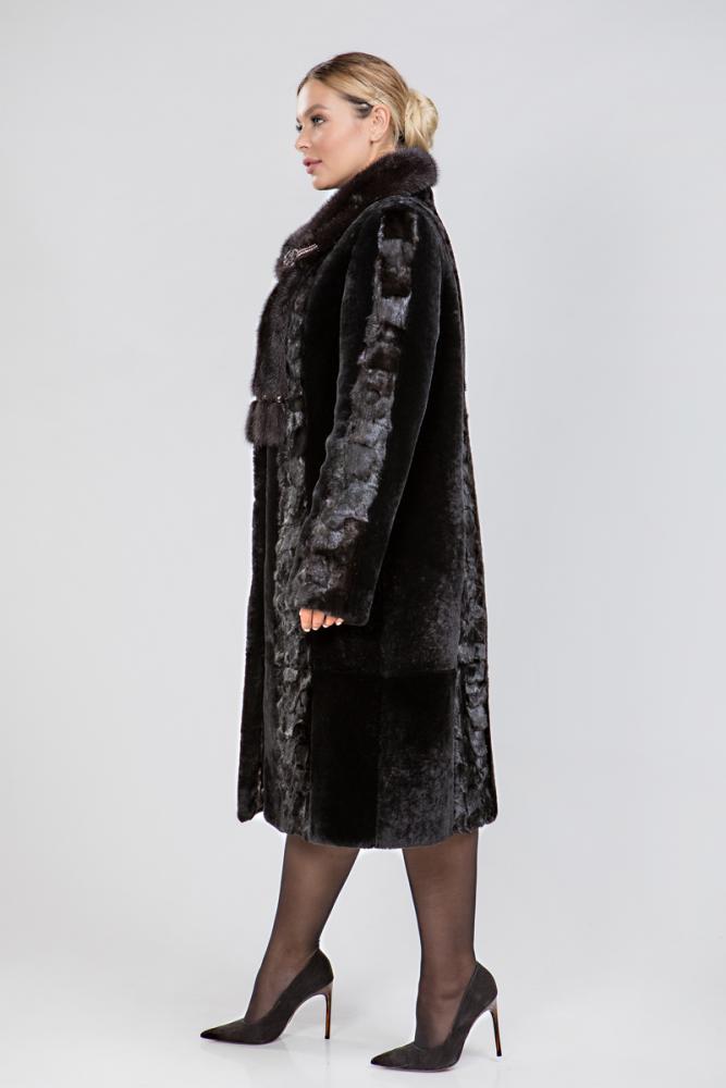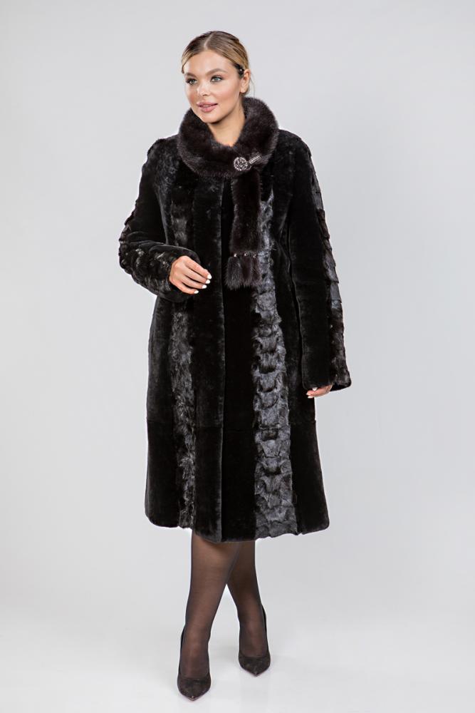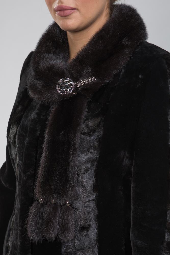Полупальто из меха овчины. Воротник модели дополнен мехом норки и фиксируется декоративной клипсой. Длина изделия 110 см. Шубка декорирована вставками из меха норки. Рукава модели могут подворачиваться, образуя манжеты. Эта элегантная модель для ценительниц строгого классического стиля!