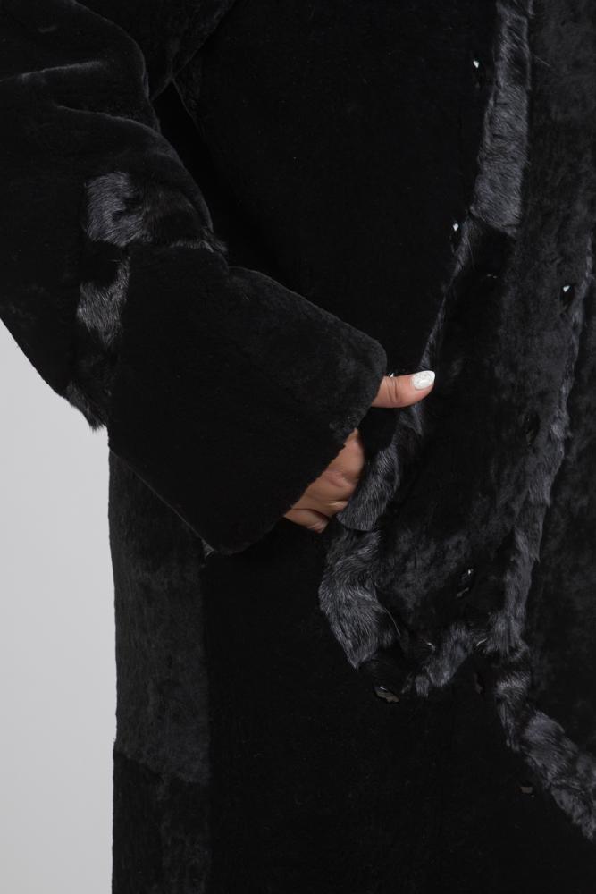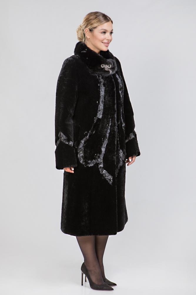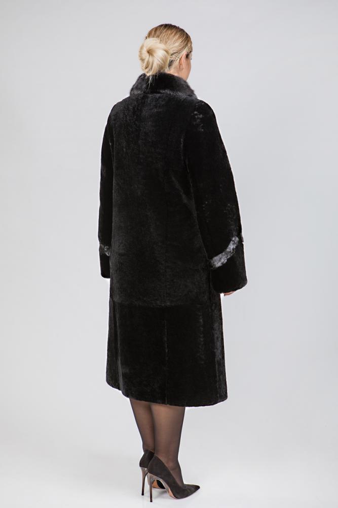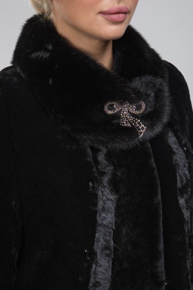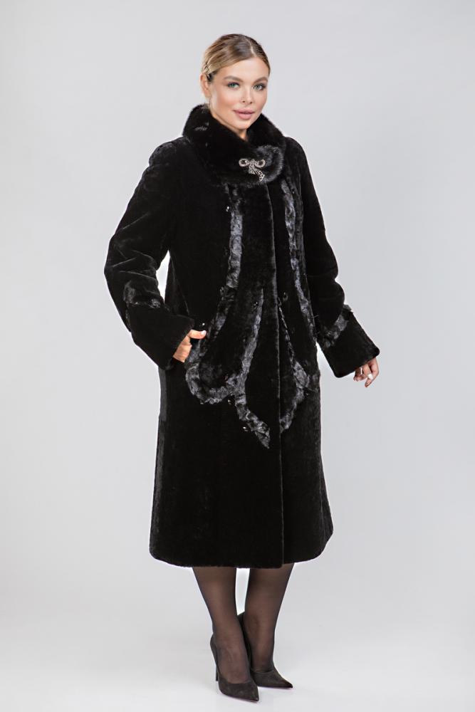 Полупальто из меха овчины. Воротник модели дополнен мехом норки и фиксируется магнитом. Изделие застегивается на клипсы. Шубка декорирована фигурными вставками из меха норки и оригинальной брошью, которую при желании можно убрать. Длина изделия 115 см. Рукава модели могут подворачиваться, образуя манжеты. Элегантный внешний вид шубки вдохновляет многих модниц на создание новых образов!