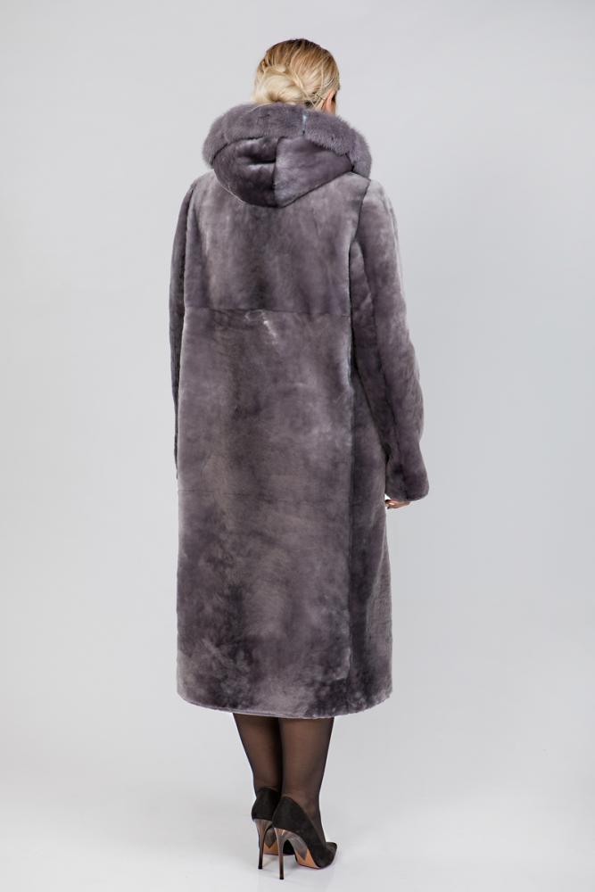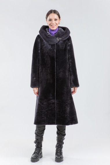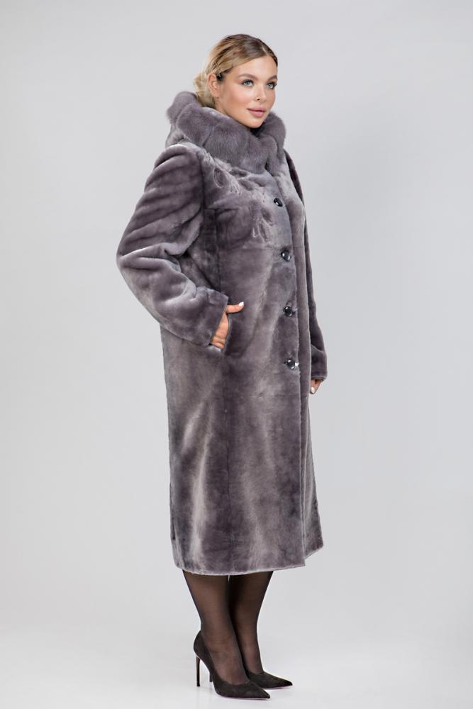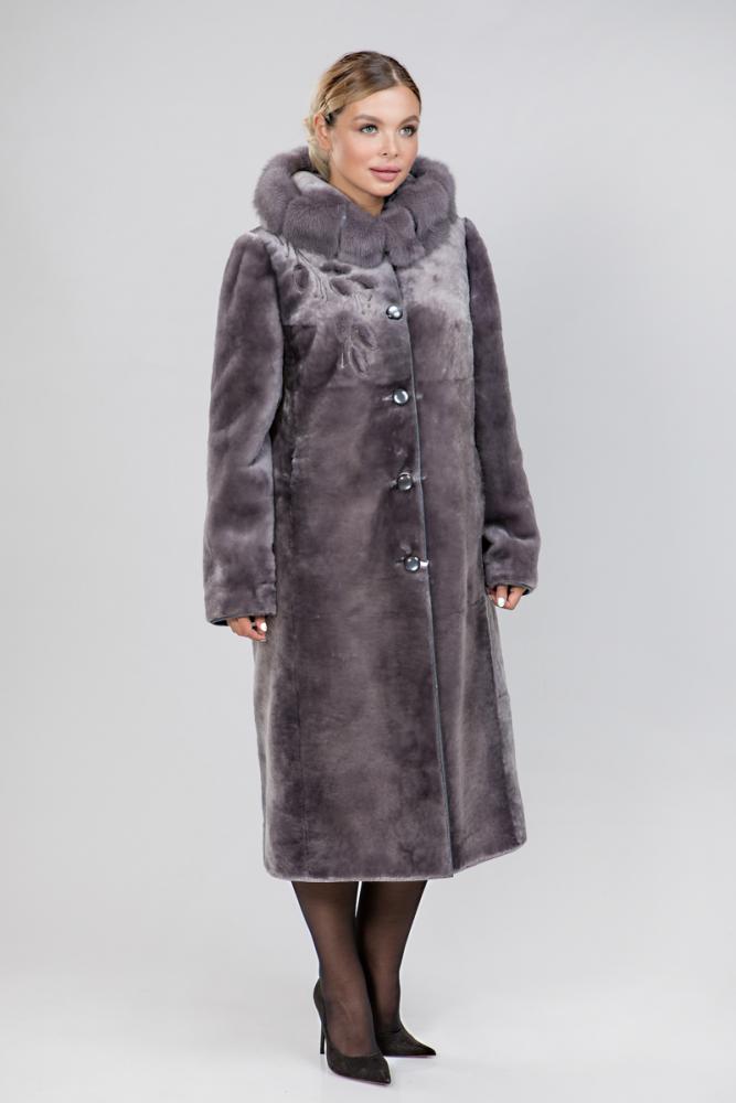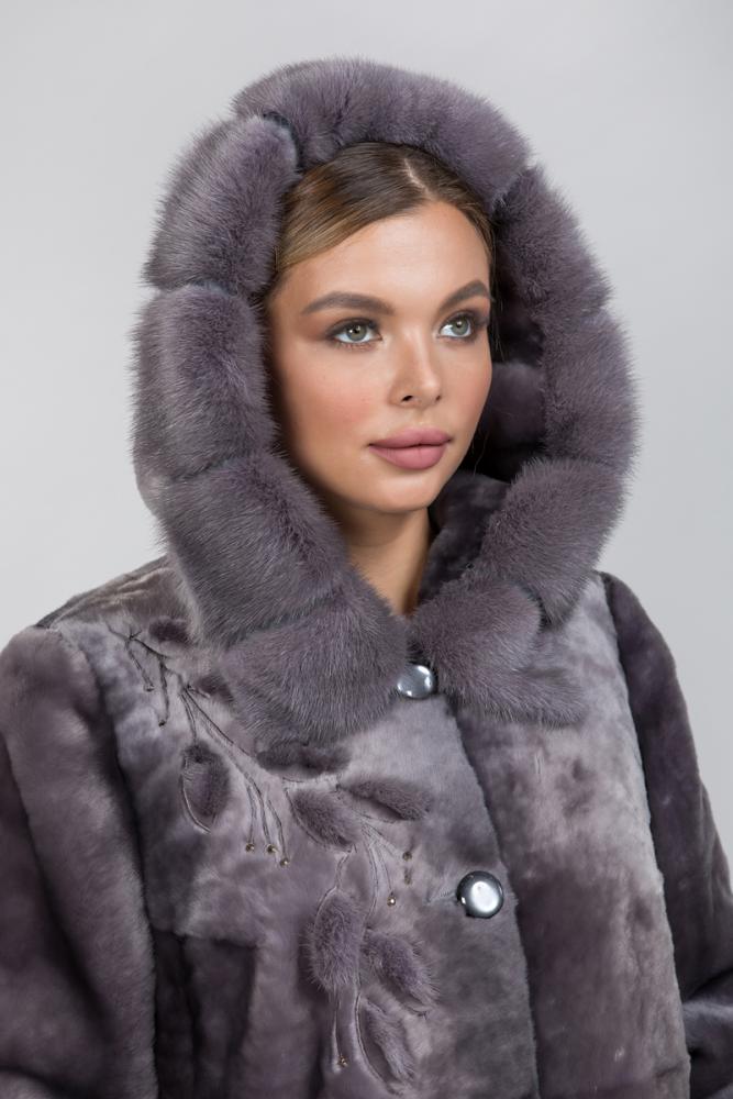 Полупальто из меха овчины. Капюшон изделия дополнен мехом норки. Модель застегивается на пуговицы. На груди шубки декоративная вышивка и мех норки. Длина изделия 115 см. Лаконичный и прямой силуэт модели подойдет девушкам любой комплекции и позволит чувствовать себя комфортно.