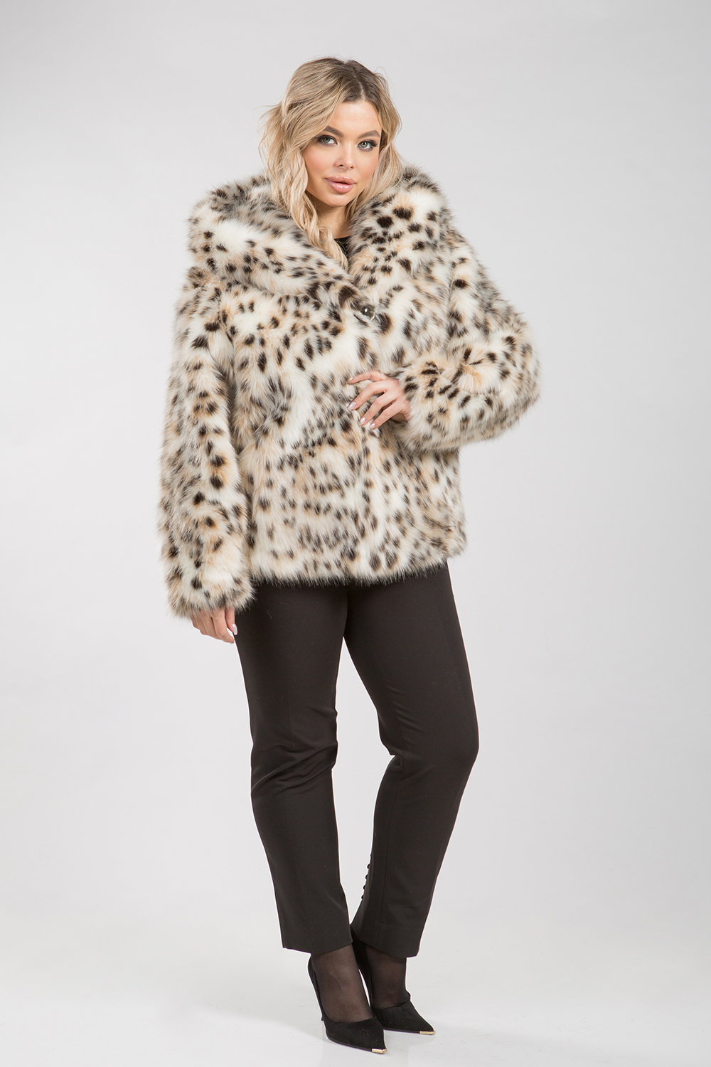 Курточка из искусственного меха с капюшоном. Застегивается модель на пуговицы и клипсы. Великолепная расцветка похожая на рысь не оставит равнодушной ни одну модницу. Длина изделия 80 см. Курточка легкая и комфортная!