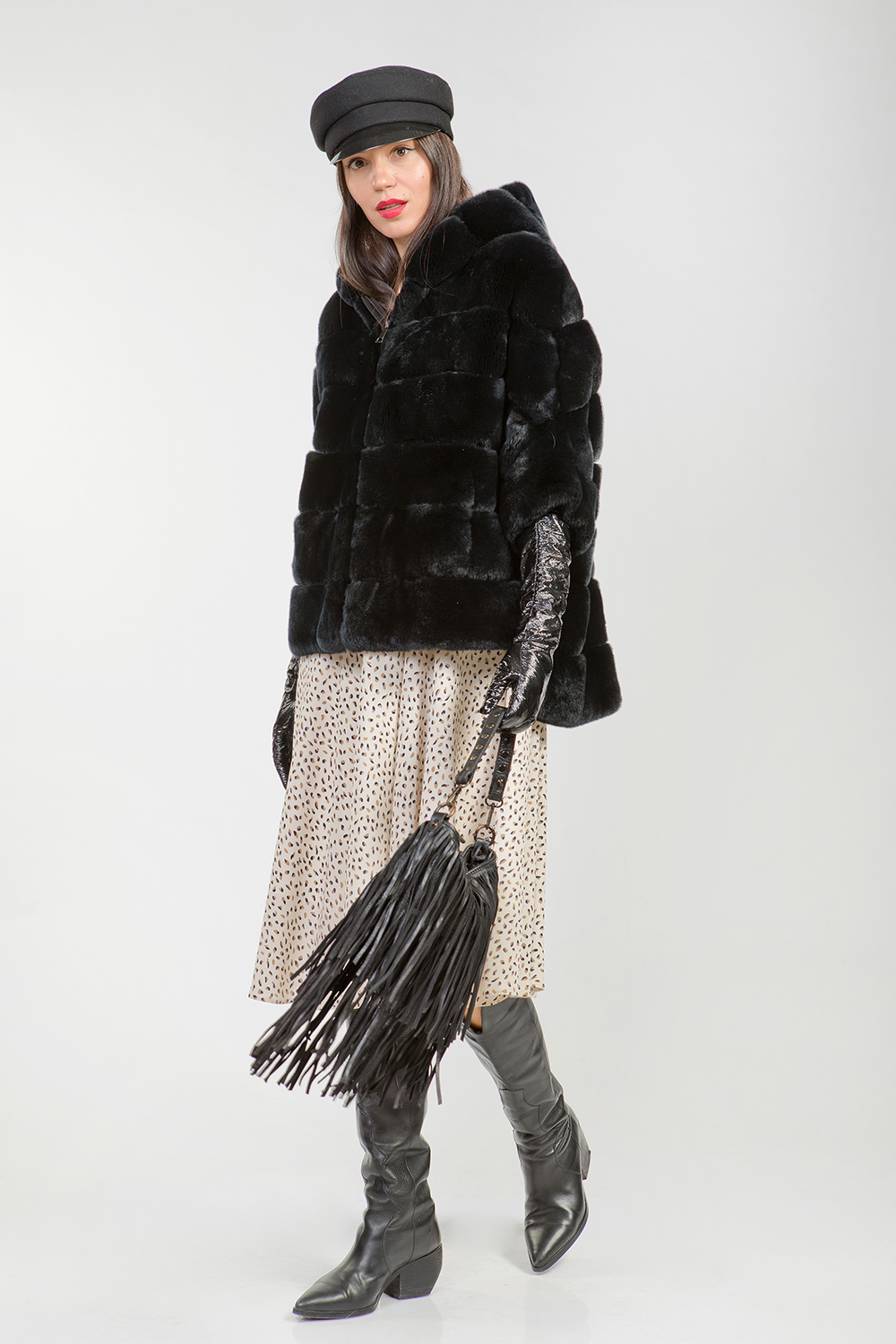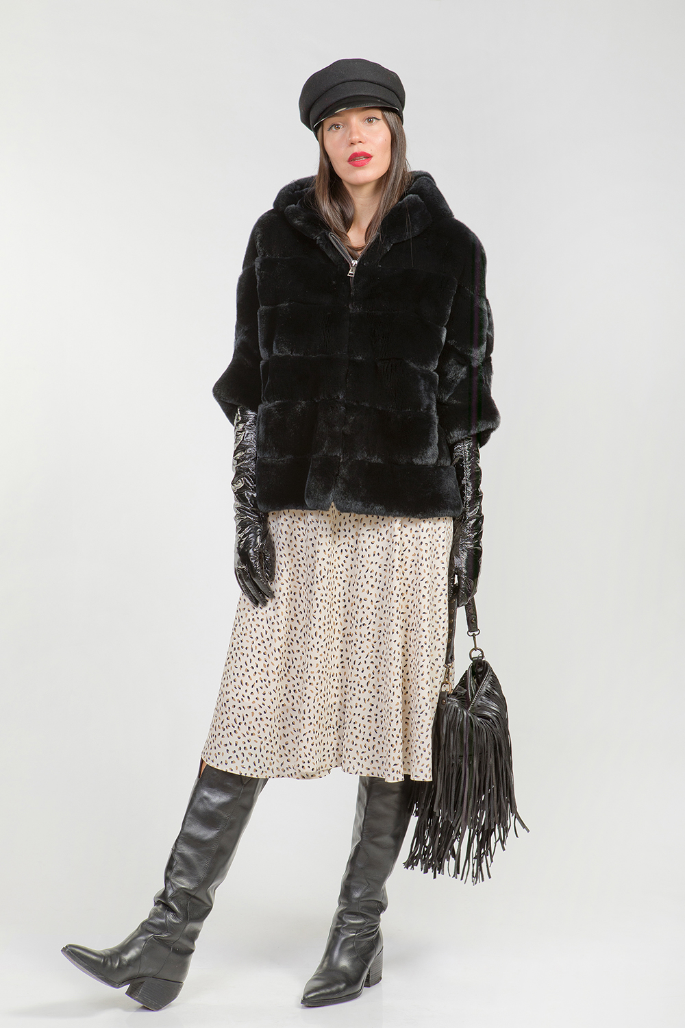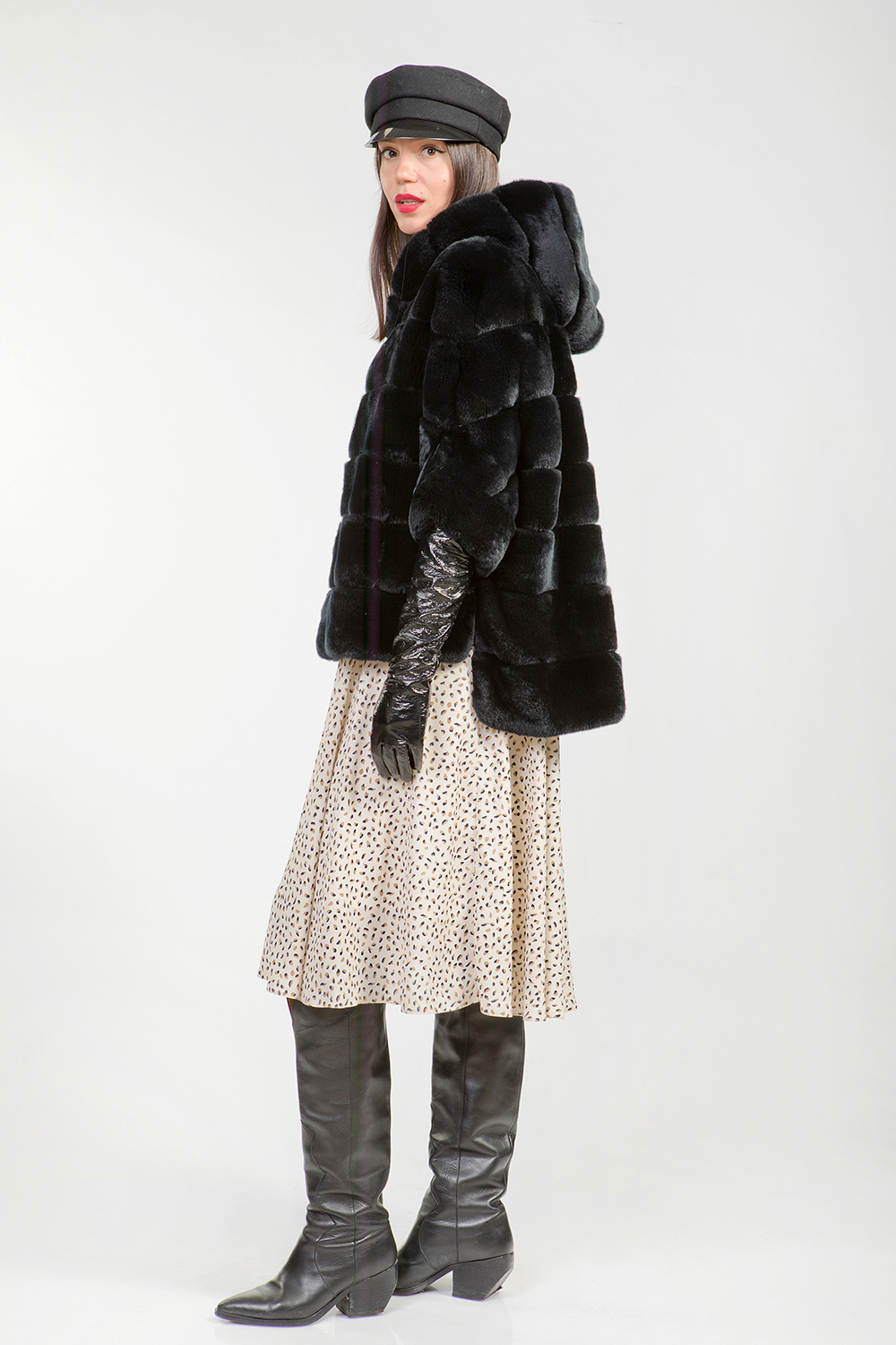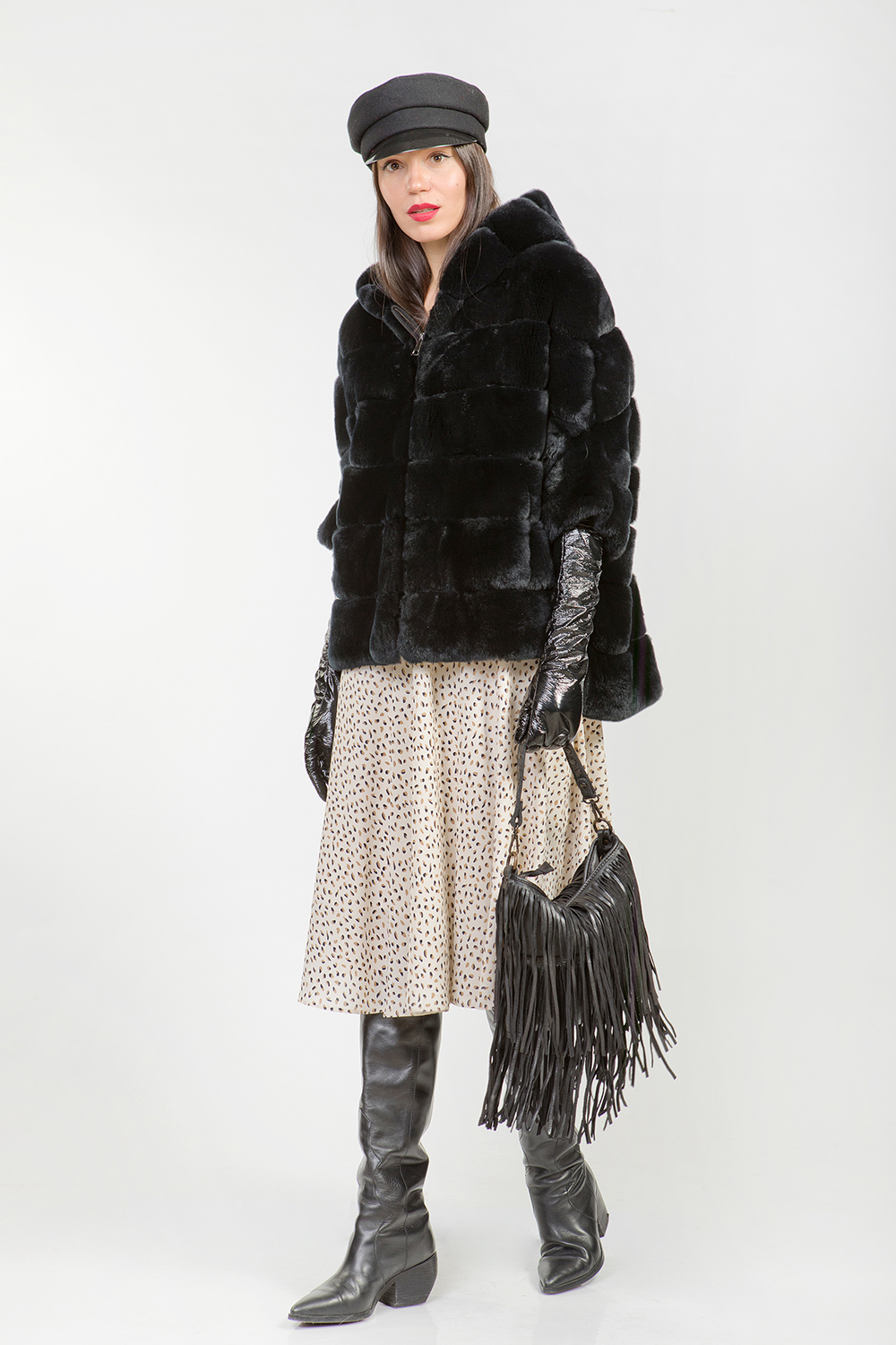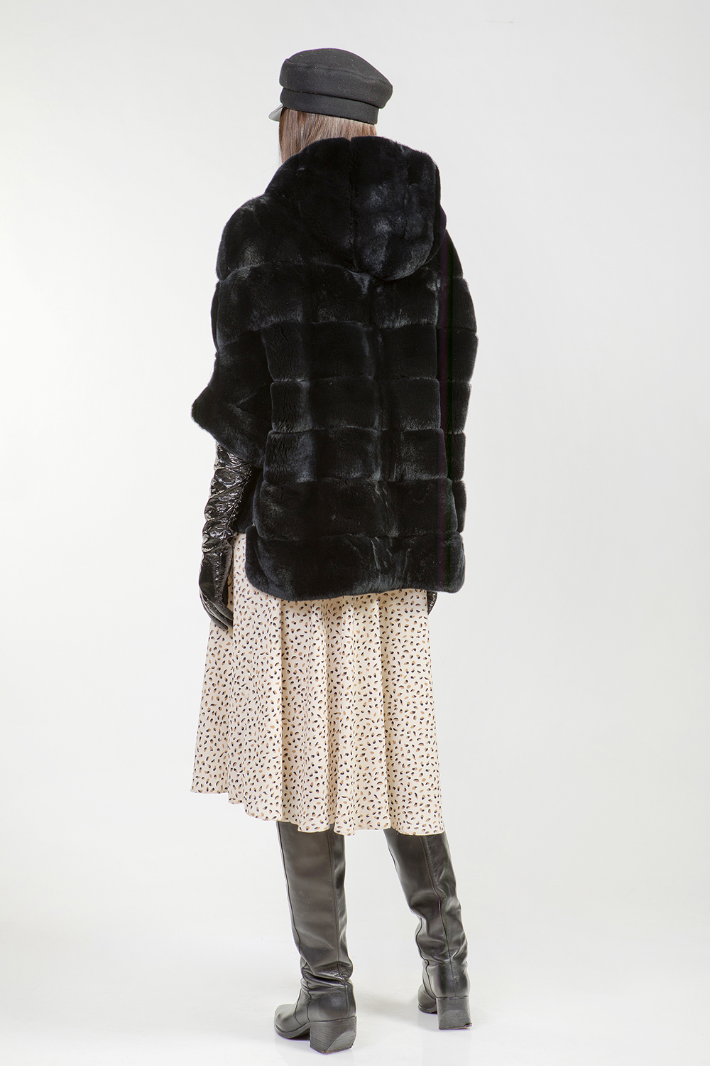 Куртка-пончо из меха кролика "Рекс"с капюшоном. Крой изделия поперечная выкладка пластин. Модель застегивается на молнию. Изделие имеет удобные кармашки. Рукава курточки укороченные, что позволяет носить модель с длинными перчатками и митенками. Такая меховая курточка-пончо прекрасно сочетается с одеждой любой длины и станет незаменимой вещью в гардеробе!