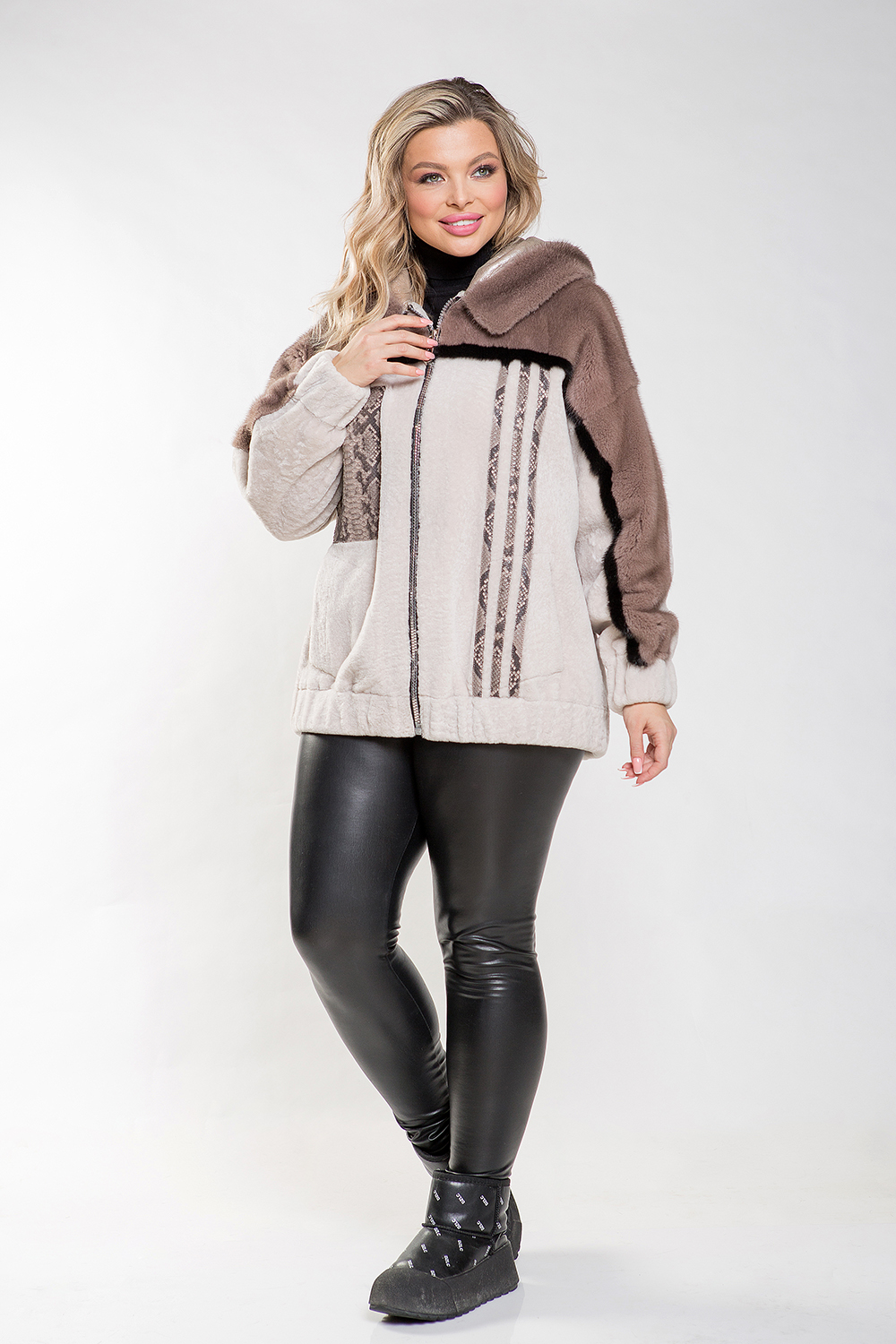 Женская натуральная куртка-дублёнка из овчины с капюшоном — это превосходный выбор для холодных дней. Модель украшена мехом норки, что придаёт ей особый шарм. Куртка застёгивается на молнию, а её два основных кармана дополняют один декоративный карман из кожи питона на груди. Длина изделия составляет 78 см, что делает его незаменимым элементом повседневного образа.