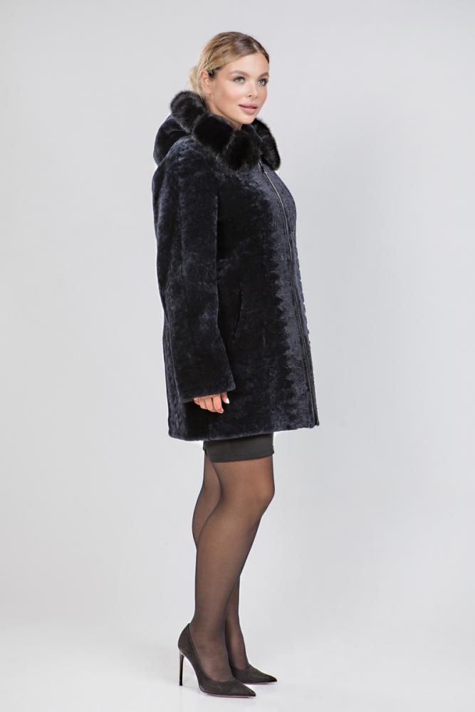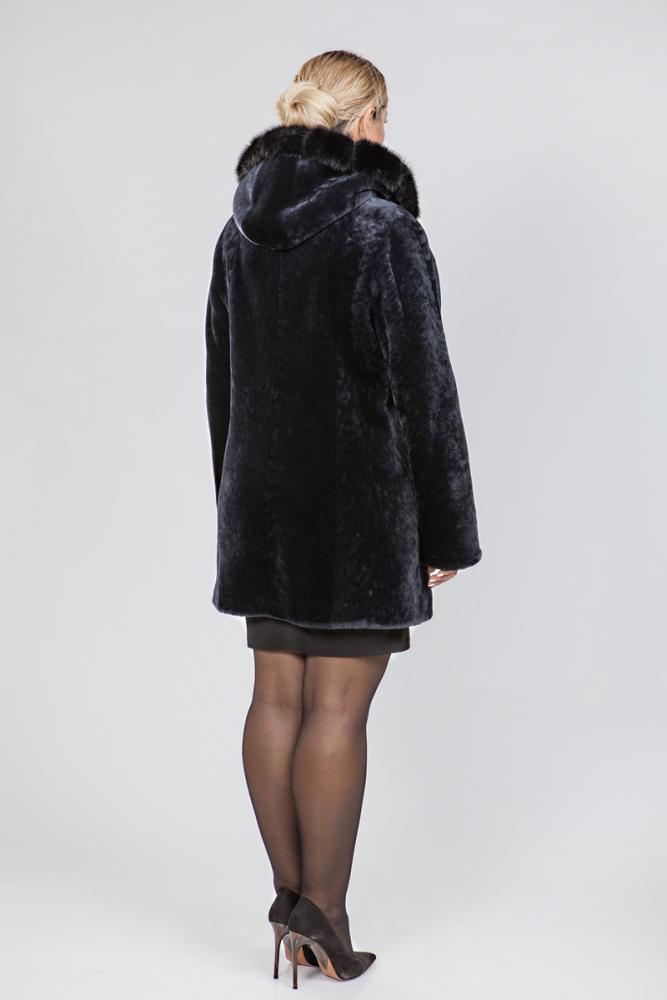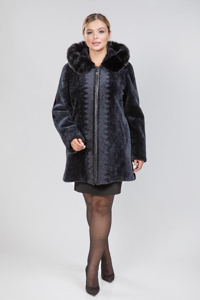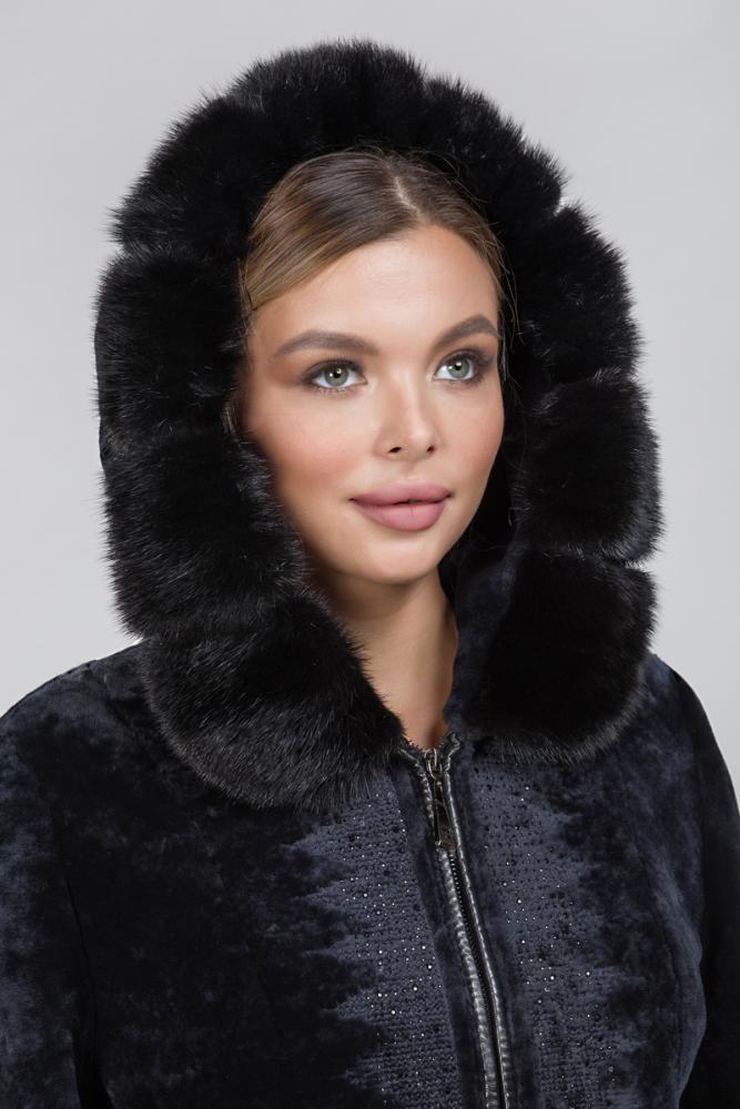 Курточка из меха овчины. Капюшон модели дополнен мехом норки. Крой изделия пластины. Модель застегивается на молнию. Изделие декорировано оригинальной вышивкой и стеклярусами. Длина модели 80 см. Элегантная курточка теплая и комфортная!
