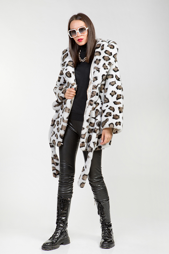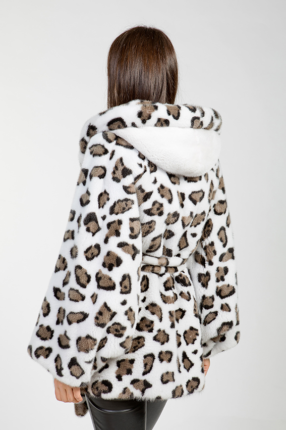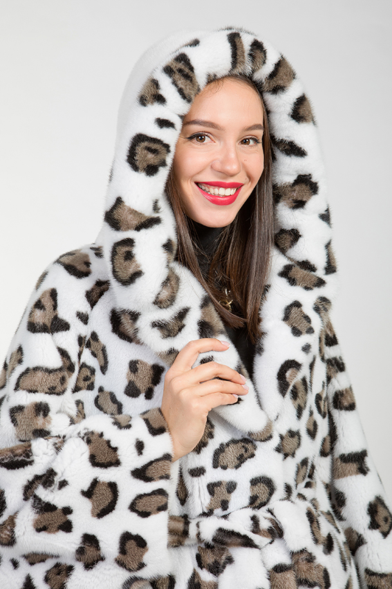 Куртка-пончо с капюшоном из меха норки. Модель выполнена в пластинчатом крое с добавлением роспуска. Длина изделия составляет 80 см. Рукава имеют свободный крой. Удобный капюшон с утяжками обеспечивает защиту от холода. Расцветка напоминает снежного барса и вызывает положительные эмоции. Эта модель придаёт образу величественность и престижность.