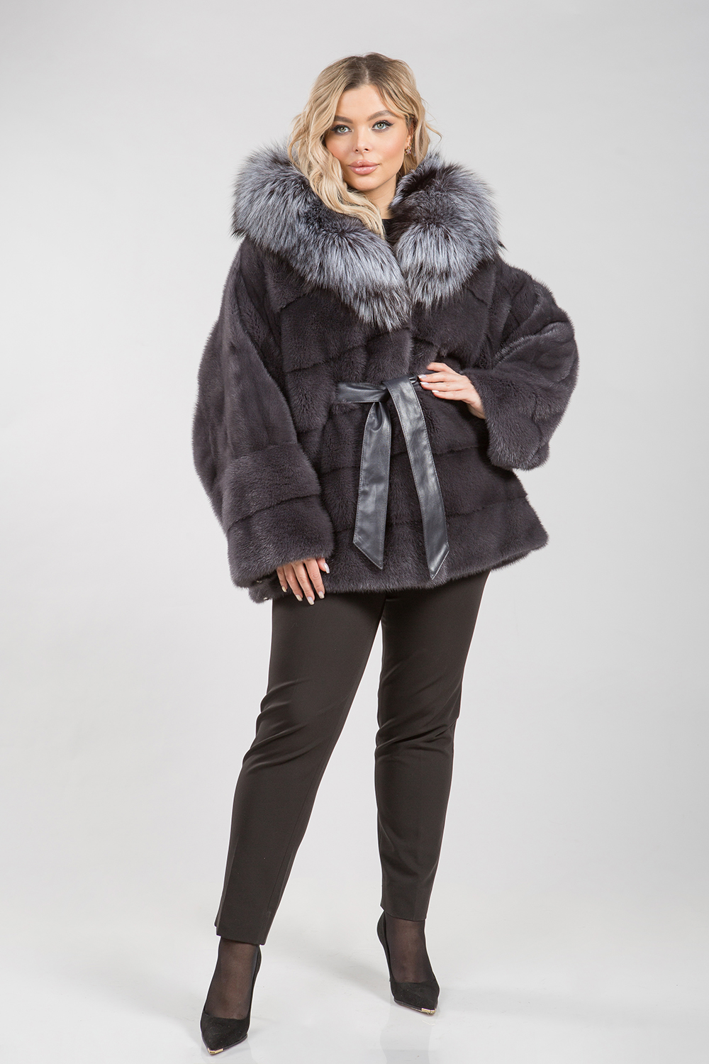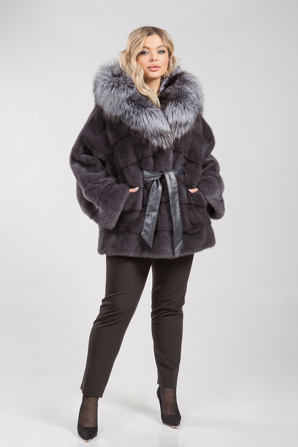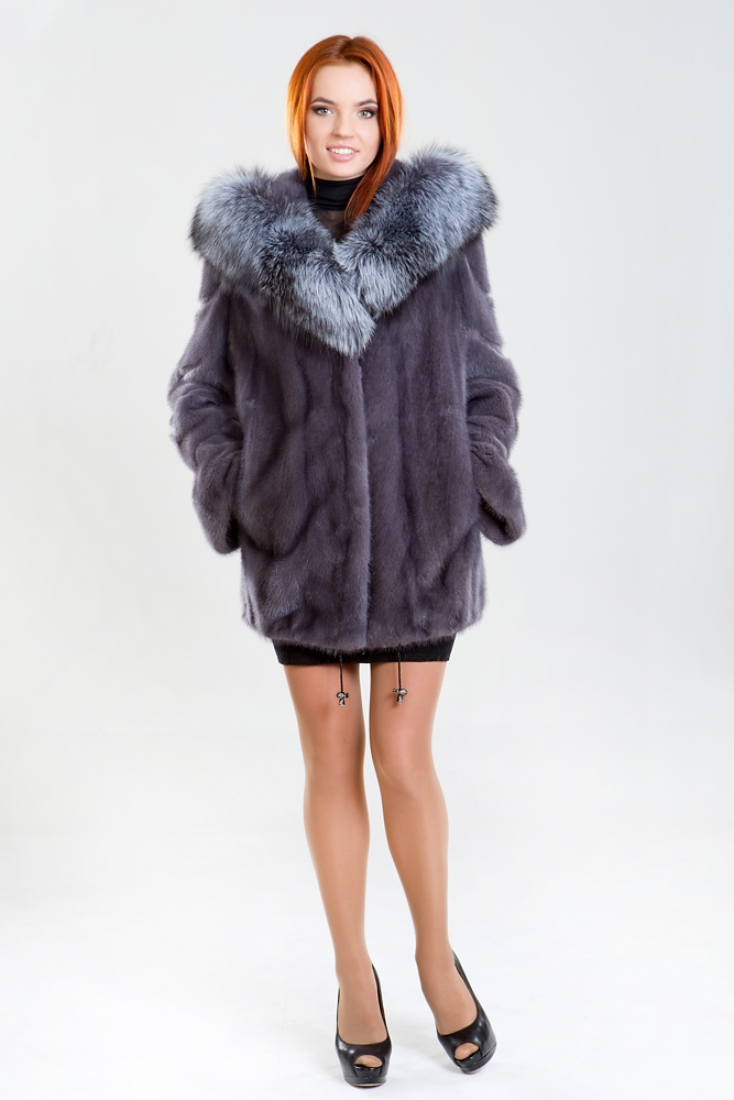 Курточка-пончо из меха норки. Капюшон модели декорирован мехом чернобурой лисы. Крой изделия диагональная выкладка пластин. Рукава и низ курточки оснащены регулирующими утяжками. Длина изделия 75 см. Кожаный пояс шубки продевается внутри изделия и тем самым придает курточке оригинальность. А благодаря шикарной лисе шубка выглядит очень эффектно, добавляя в образ модели нотки шика и гламура!
