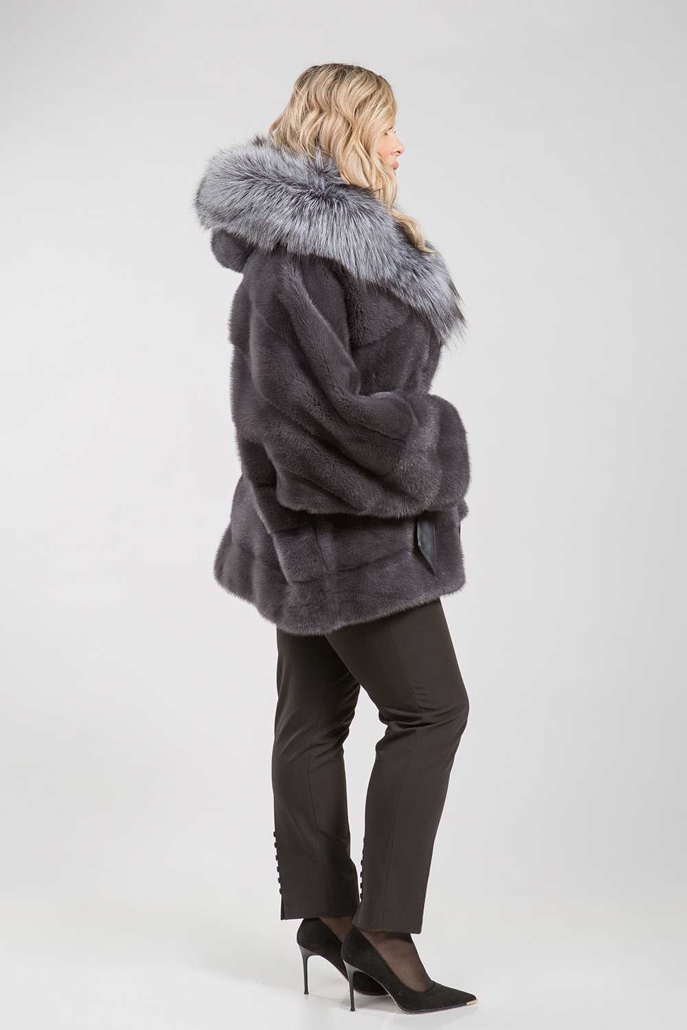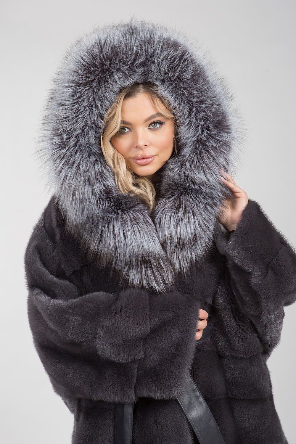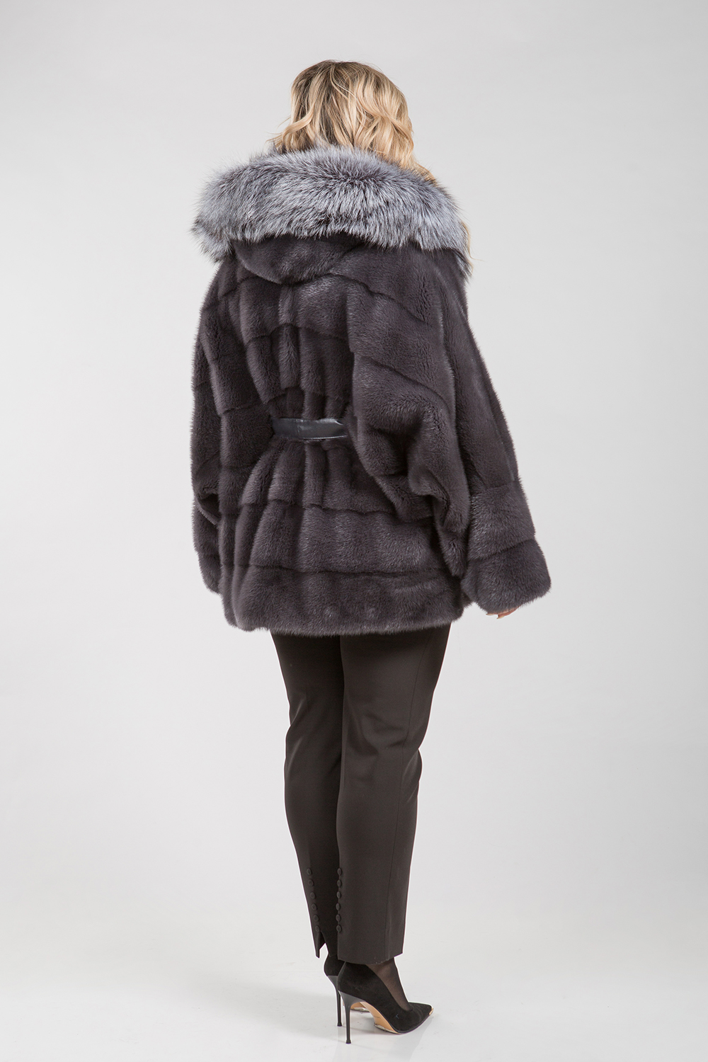 Курточка-пончо из меха норки. Капюшон модели декорирован мехом чернобурой лисы. Крой изделия диагональная выкладка пластин. Рукава и низ курточки оснащены регулирующими утяжками. Длина изделия 75 см. Кожаный пояс шубки продевается внутри изделия и тем самым придает курточке оригинальность. А благодаря шикарной лисе шубка выглядит очень эффектно, добавляя в образ модели нотки шика и гламура!