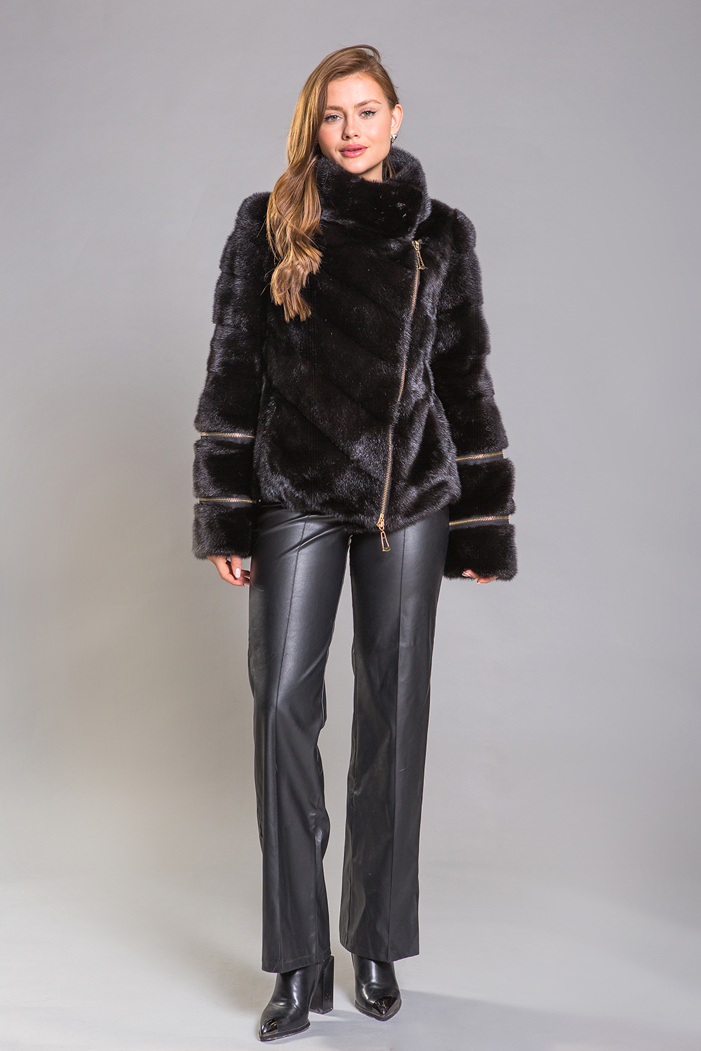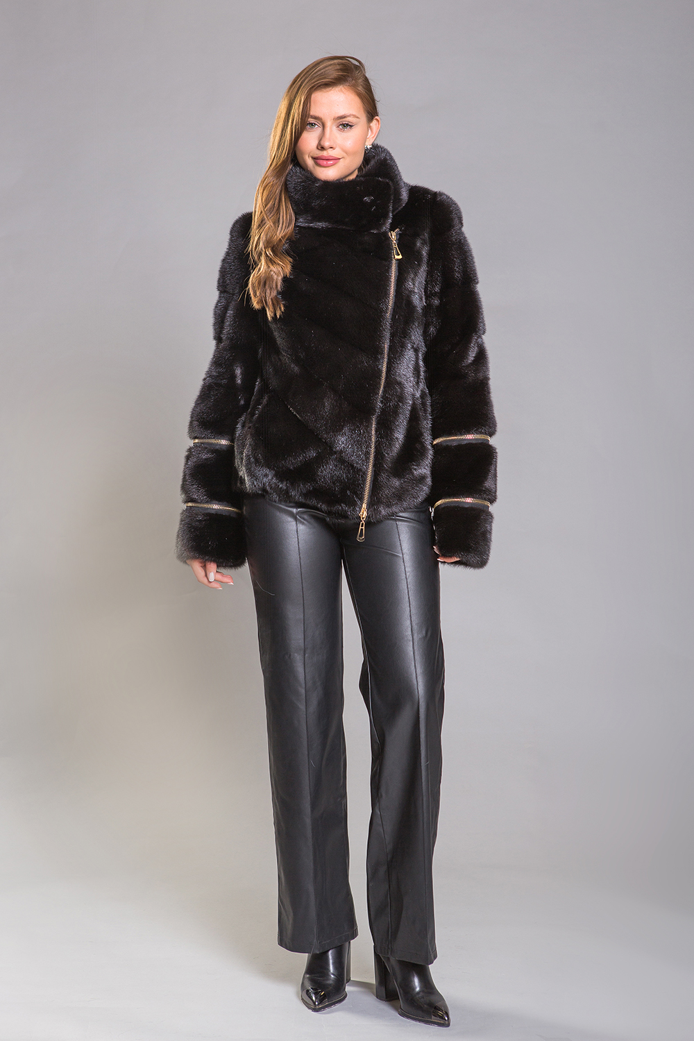 Куртка из меха норки, выполненная в стиле «диагональная выкладка пластин», станет вашим незаменимым спутником в холода. Её воротник-стойка придаст вашему образу элегантности, а благодаря замкам-молниям вы сможете легко укоротить рукава, создавая смелые и оригинальные сочетания.
