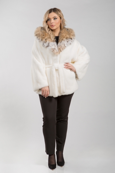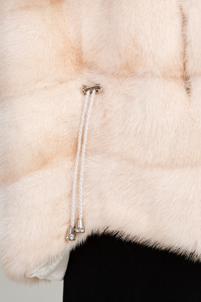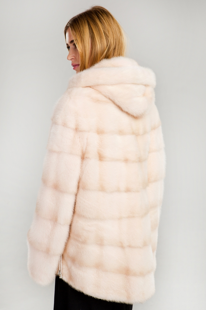 Куртка женская из меха норки с капюшоном. Крой изделия - поперечная выкладка пластин. По бокам модели функциональные утяжки, с помощью их можно видоизменить изделие. Длина изделия 80 см. Меховая курточка уютная и комфортная!