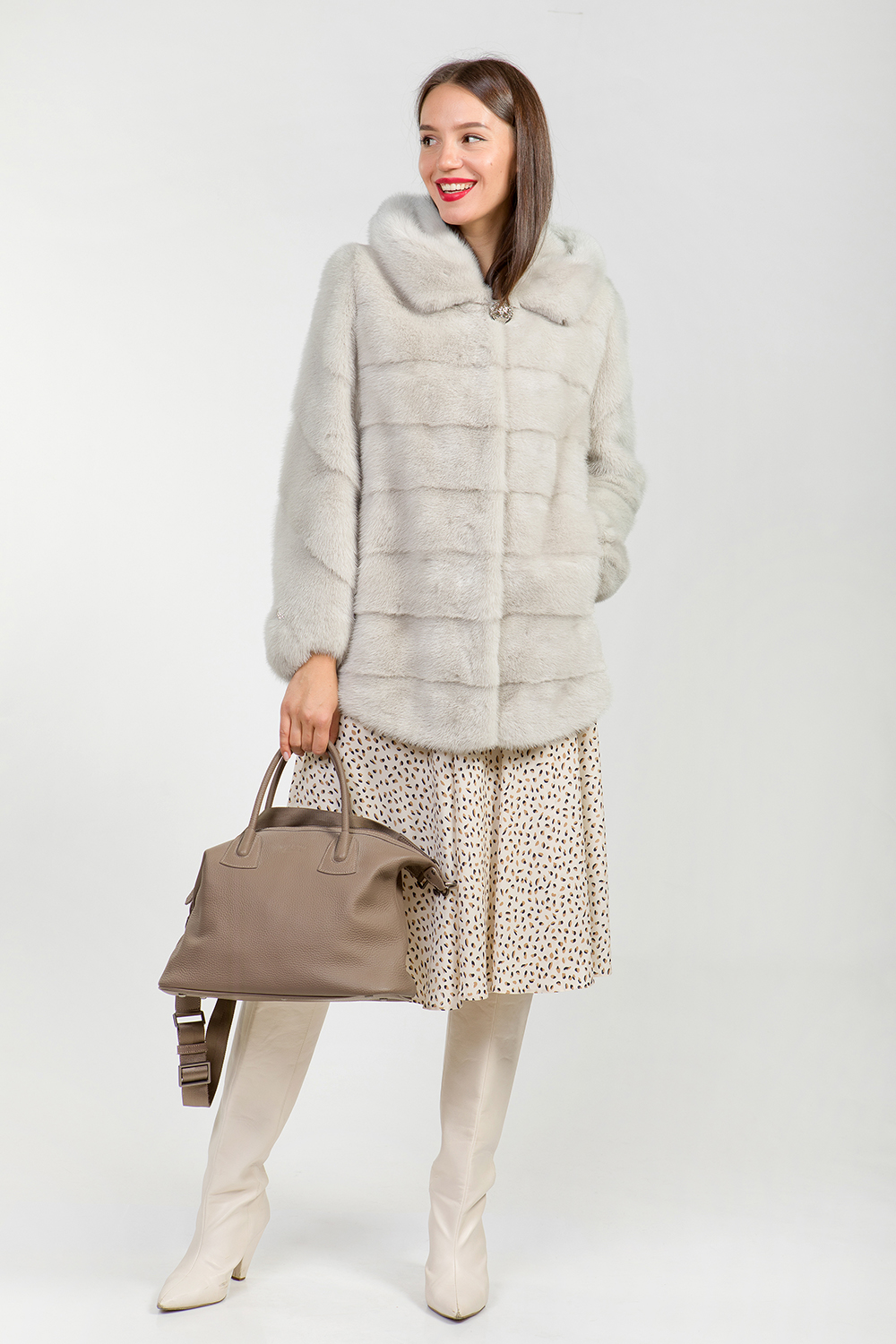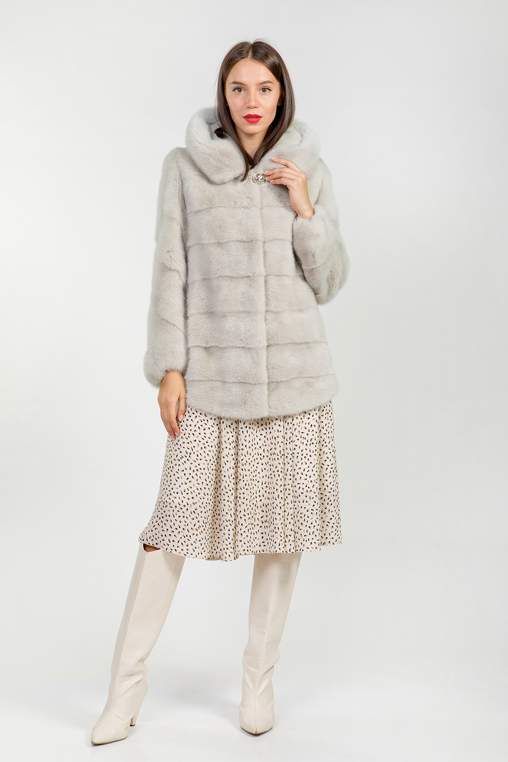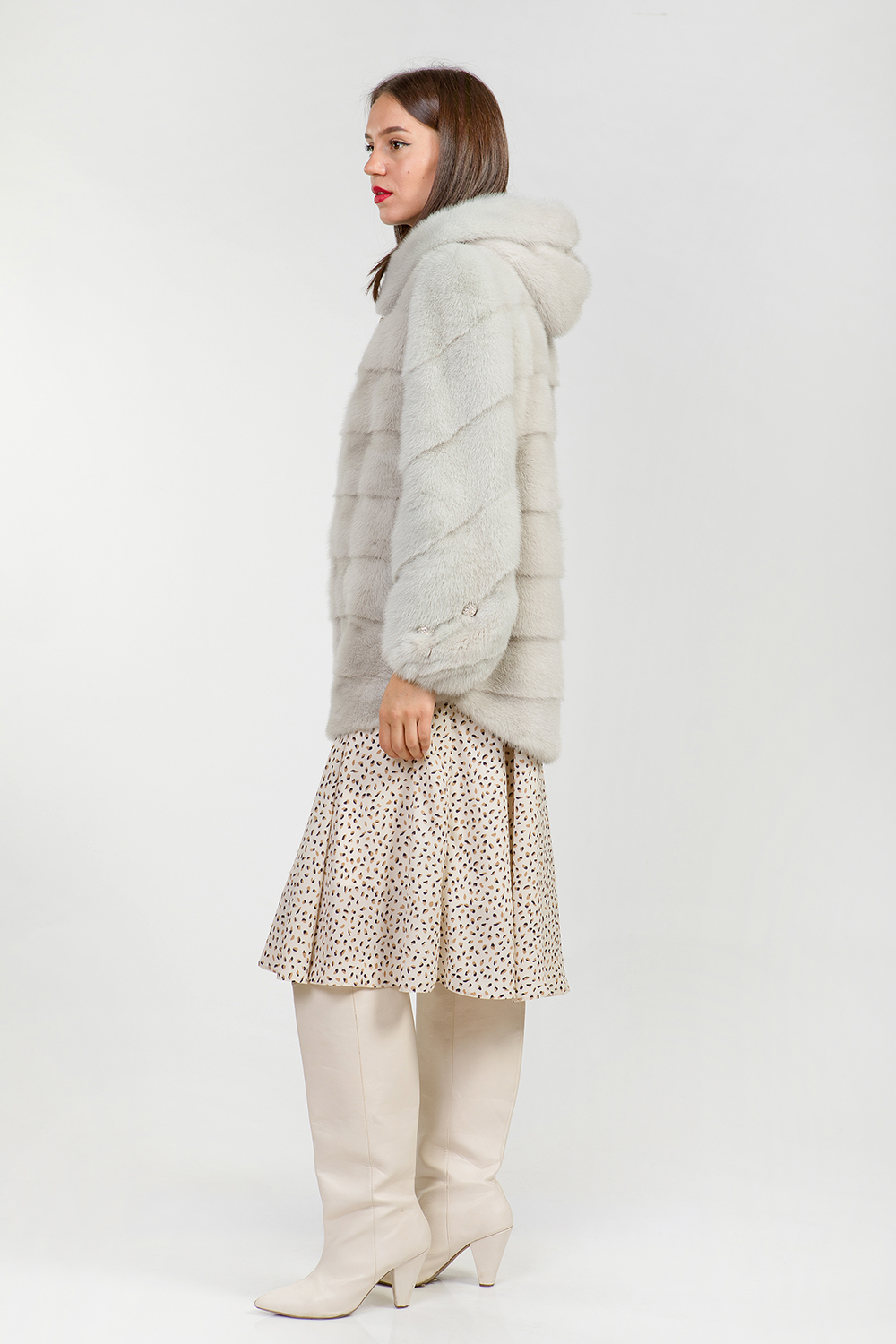 Куртка из меха норки с капюшоном. Крой изделия поперечная выкладка пластин. Модель оснащена регулирующими утяжками на рукавах и на талии. Длина изделия 80 см. Курточка имеет универсальный фасон и подходит для любого типа фигуры.