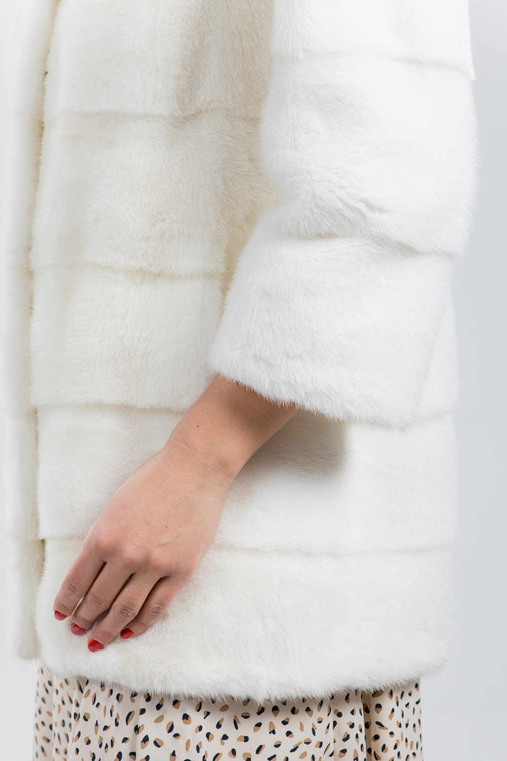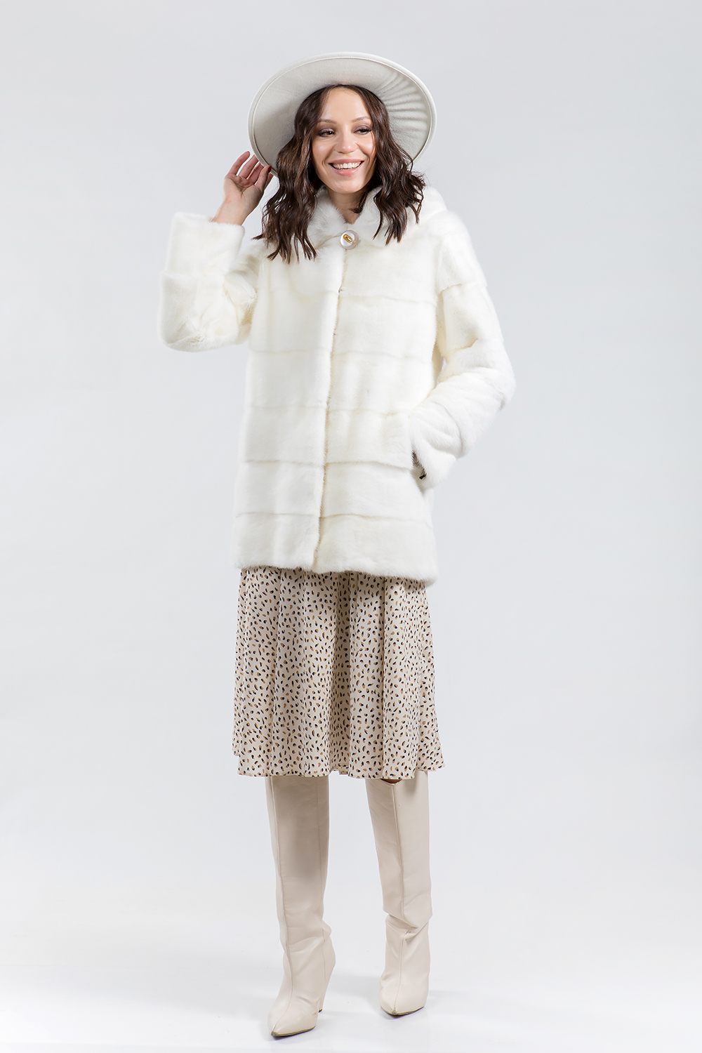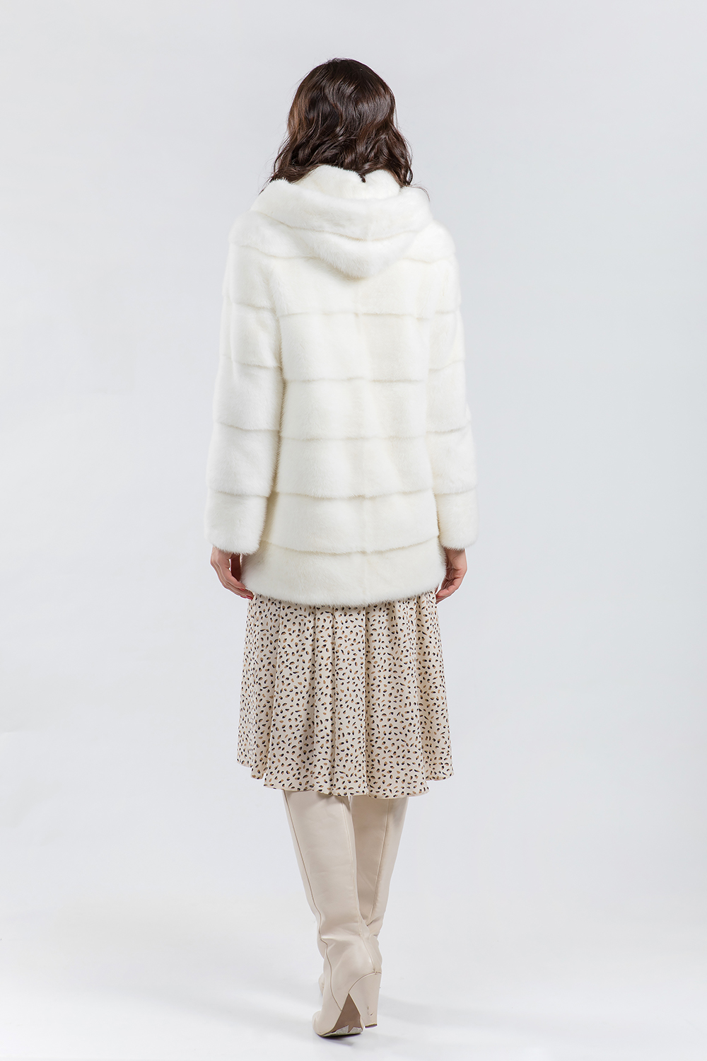 Норковая курточка с капюшоном, выполненная из поперечно выложенных пластин меха. Регулируемые утяжки расположены на талии, рукавах и подоле изделия. Длина куртки составляет 80 см. Рукава можно укоротить с помощью потайных молний. Эта модель идеально сочетается как с юбками и платьями любой длины, так и с брюками — от свободных до облегающих. Натуральный мех устойчив к погодным условиям, сохраняет тепло и защищает от ветра.